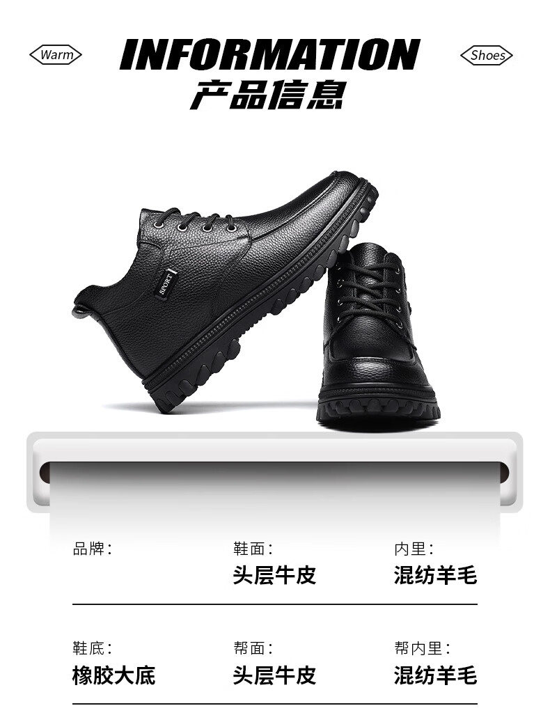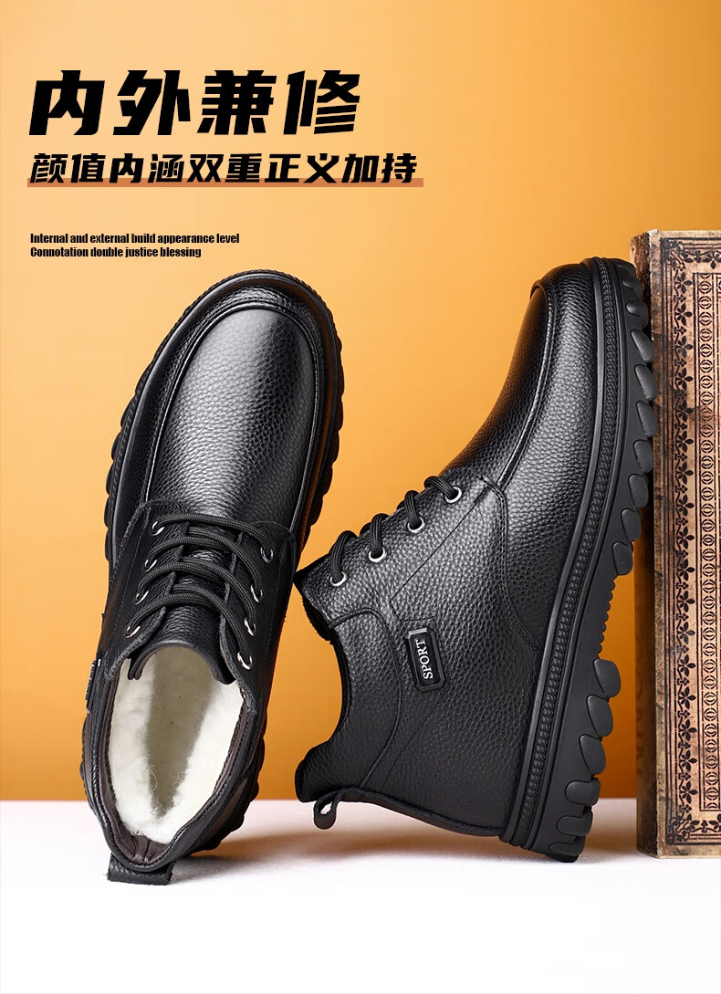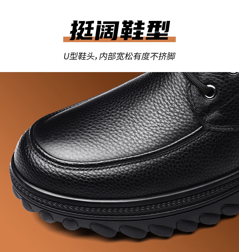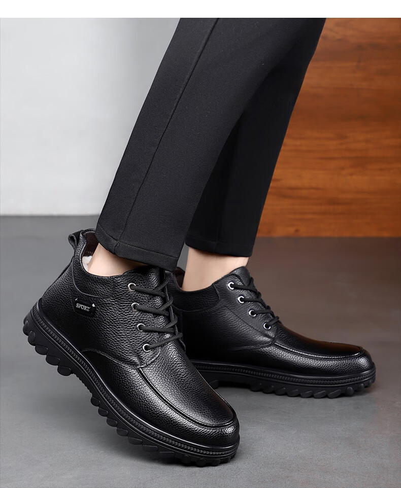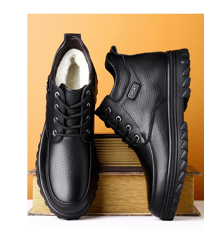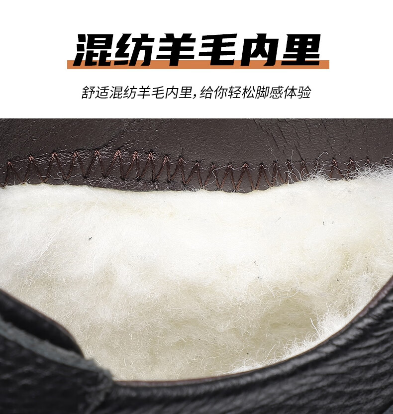 稻草人(MEXICAN)头层牛皮羊毛大棉鞋男冬季加绒加厚高帮皮鞋中年老年爸爸冬鞋保暖 黑色 38