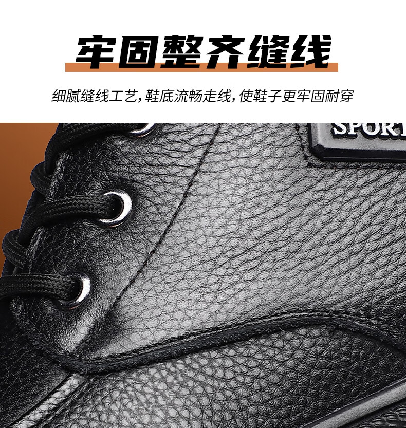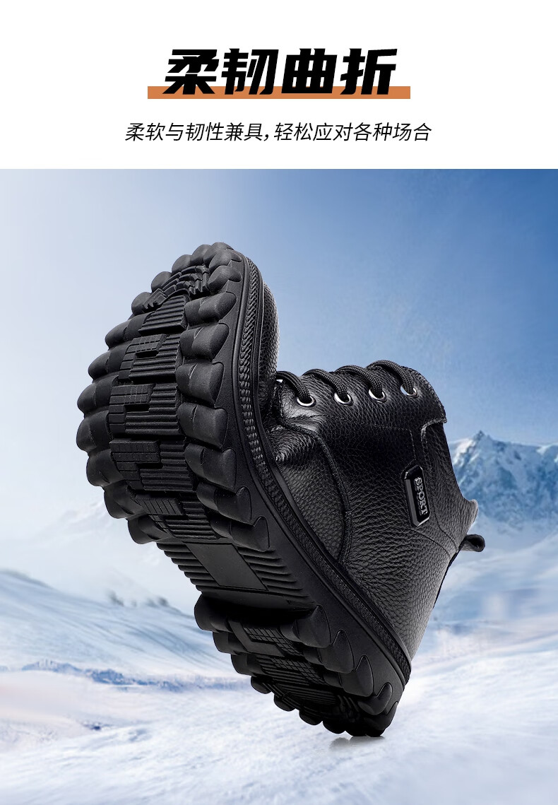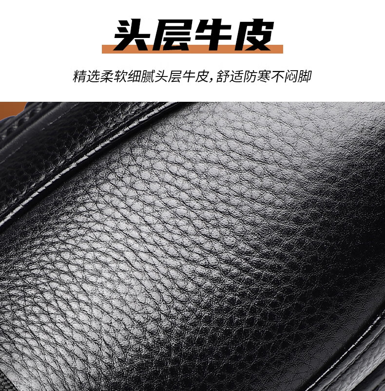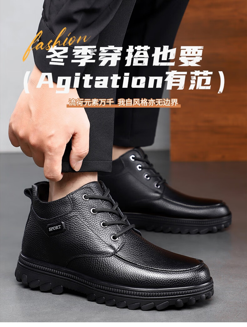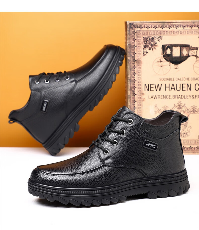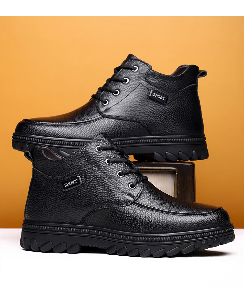 稻草人(MEXICAN)头层牛皮羊毛大棉鞋男冬季加绒加厚高帮皮鞋中年老年爸爸冬鞋保暖 黑色 38