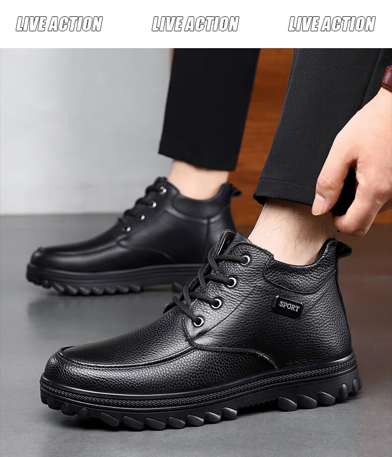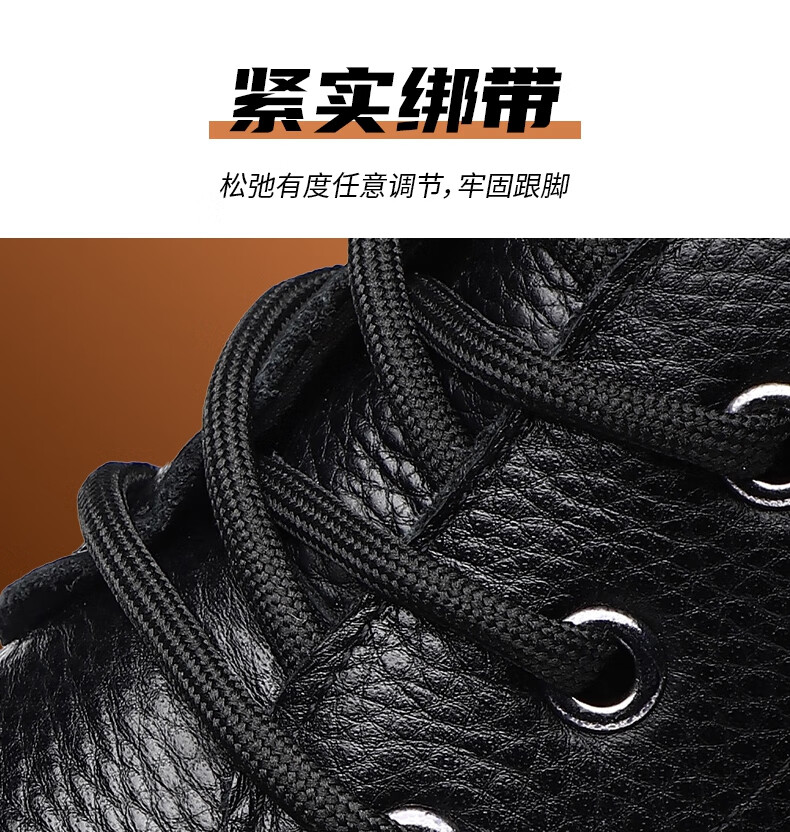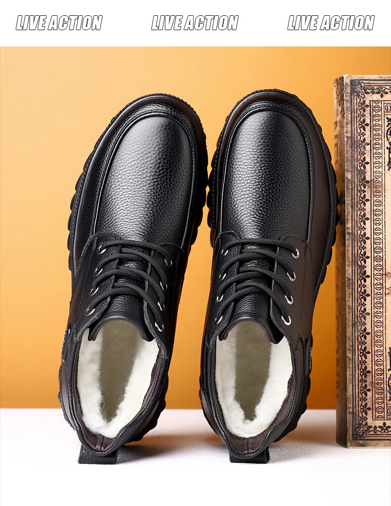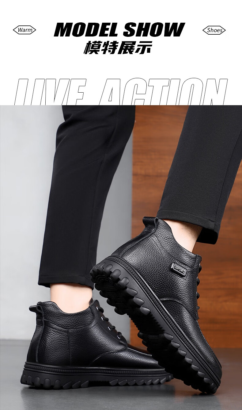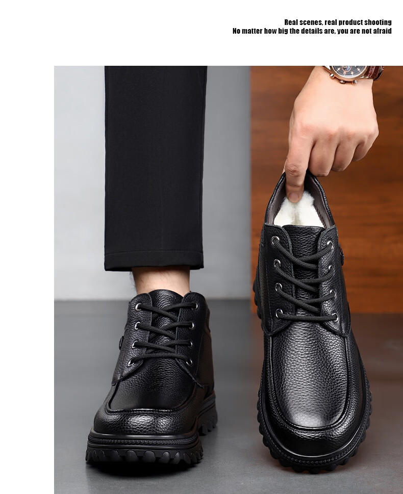 稻草人(MEXICAN)头层牛皮羊毛大棉鞋男冬季加绒加厚高帮皮鞋中年老年爸爸冬鞋保暖 黑色 38