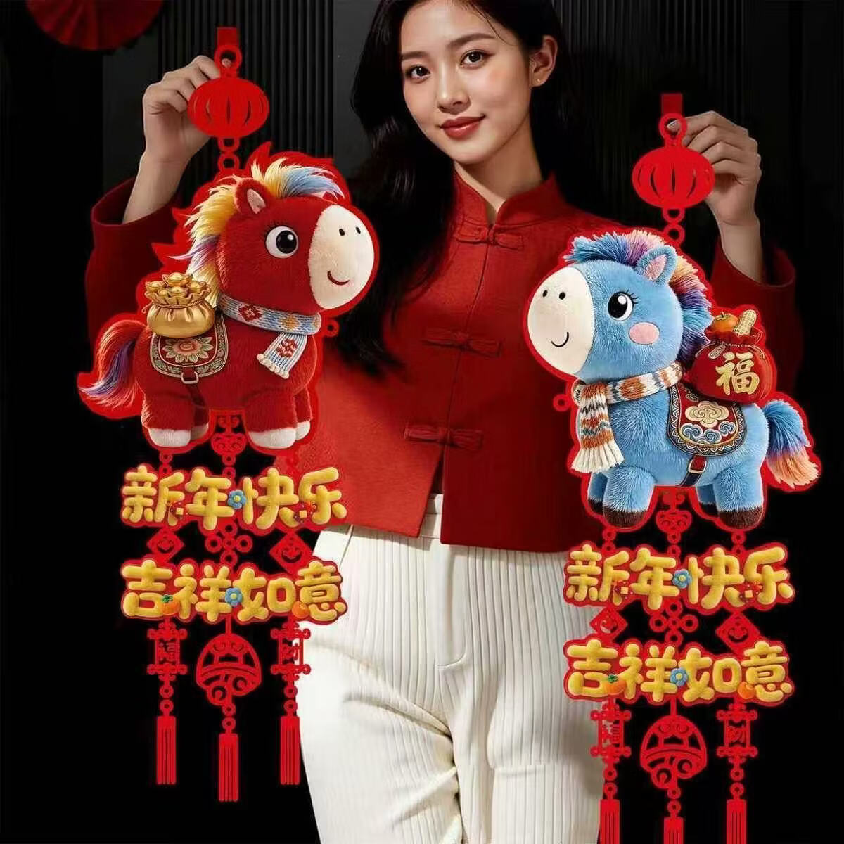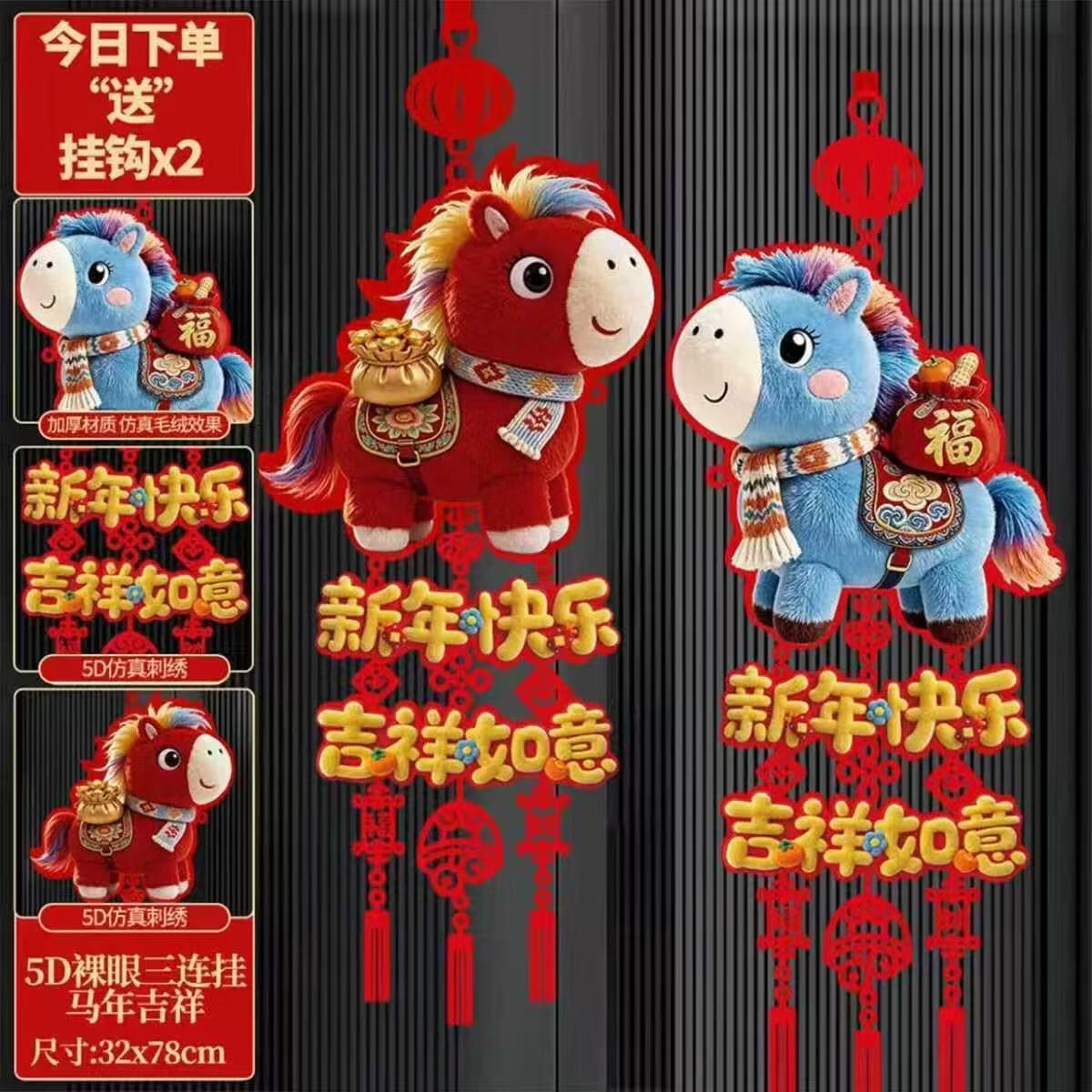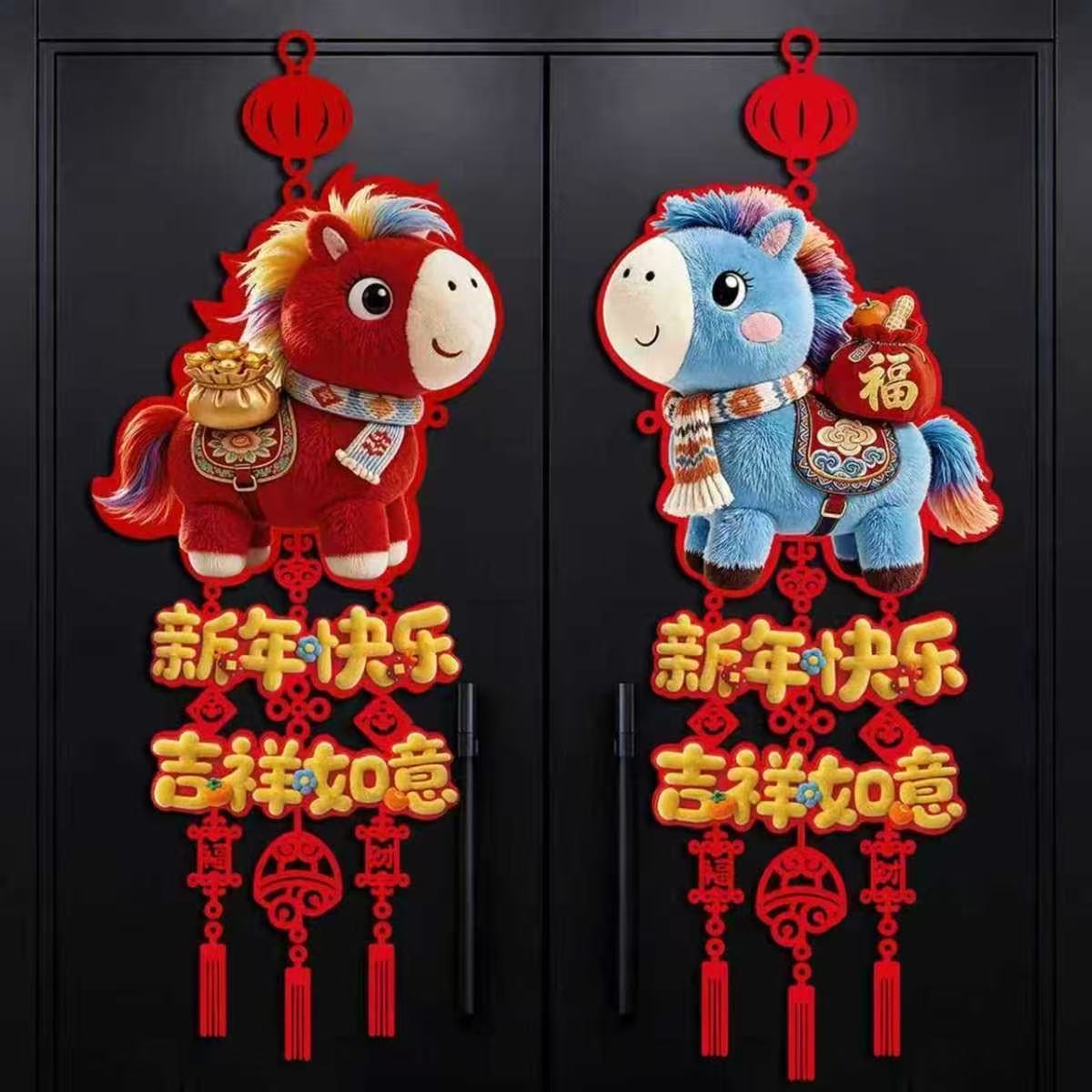 2026马年新款仿毛绒5D挂饰装饰新年福字室内墙上卧室家居门贴挂件 【福马+财马 】挂件【一对装】 32cm*78cm
