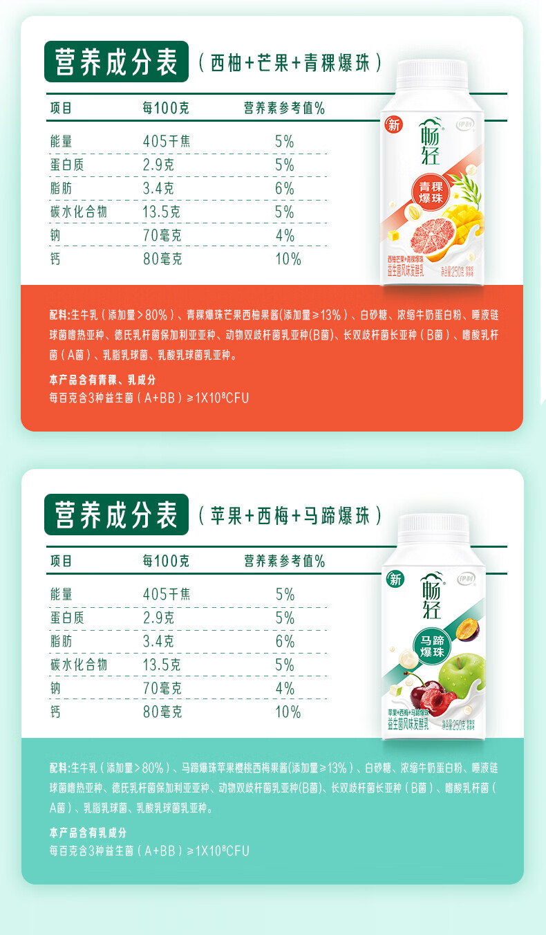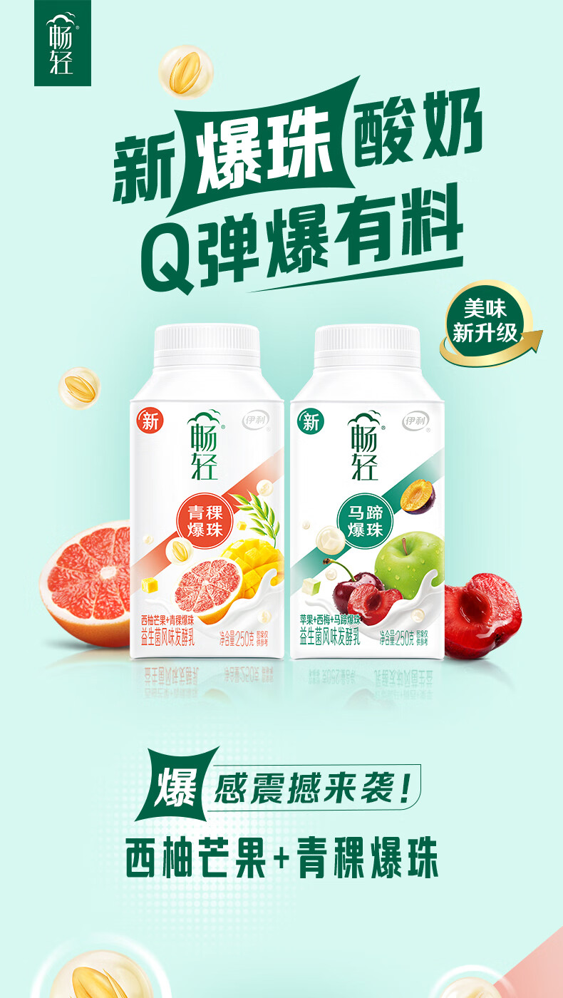 伊利 畅轻低温酸奶生牛乳西柚芒果青稞爆珠250g*4酸牛奶 风味发酵乳