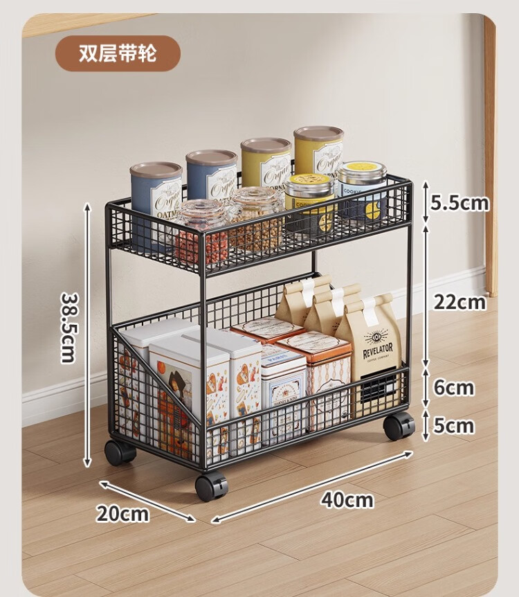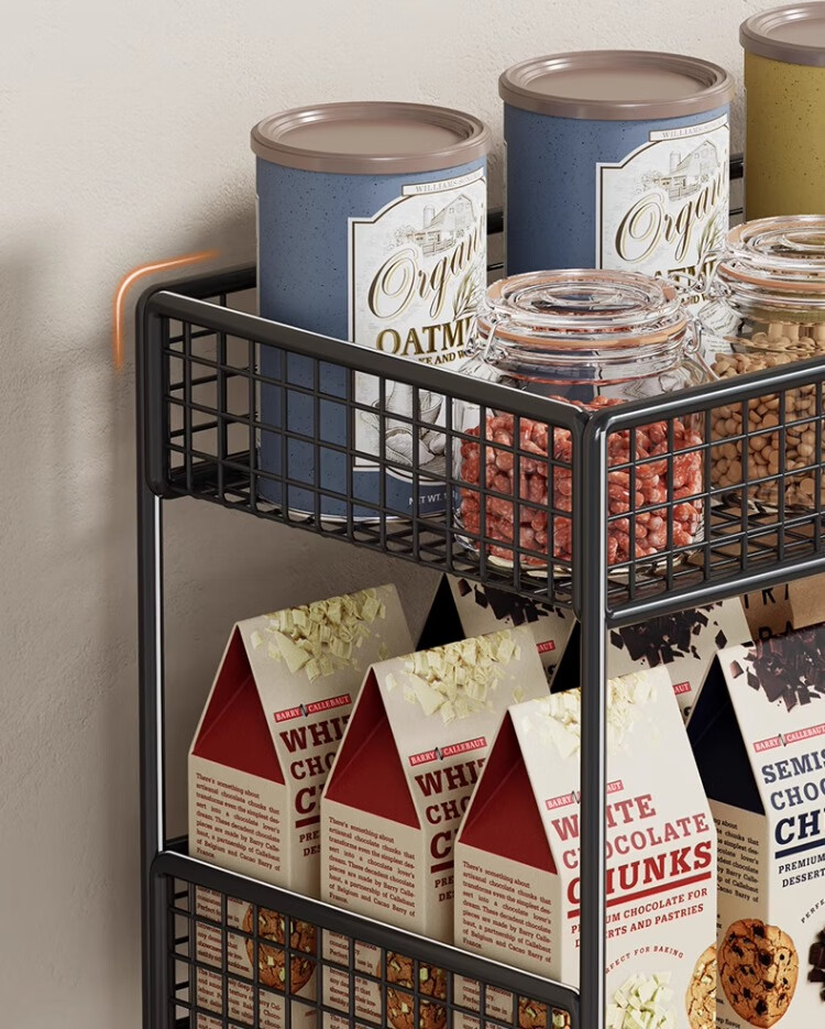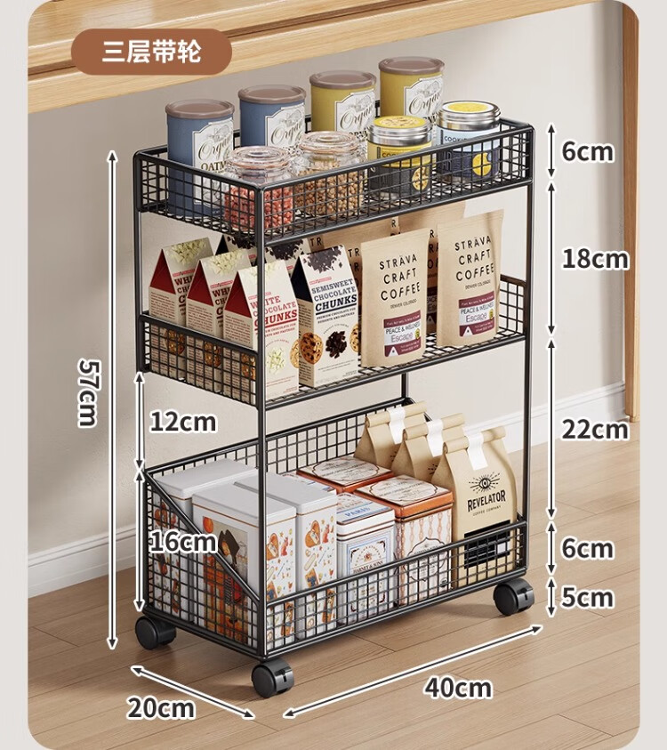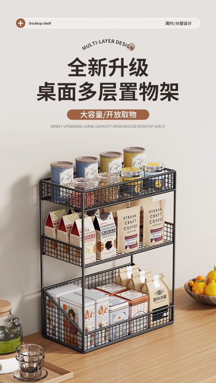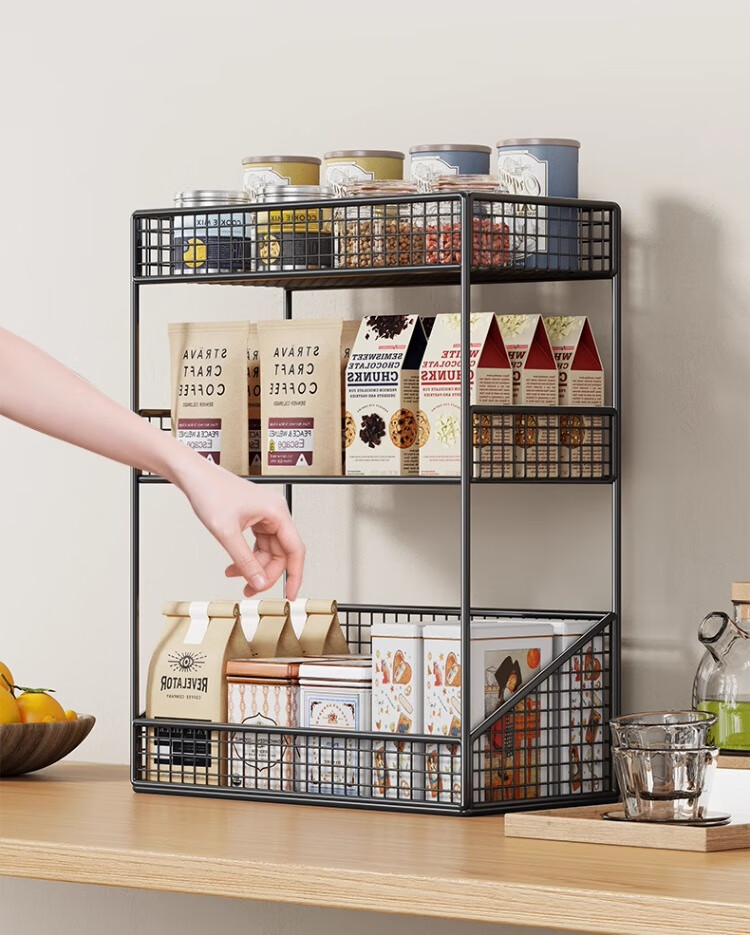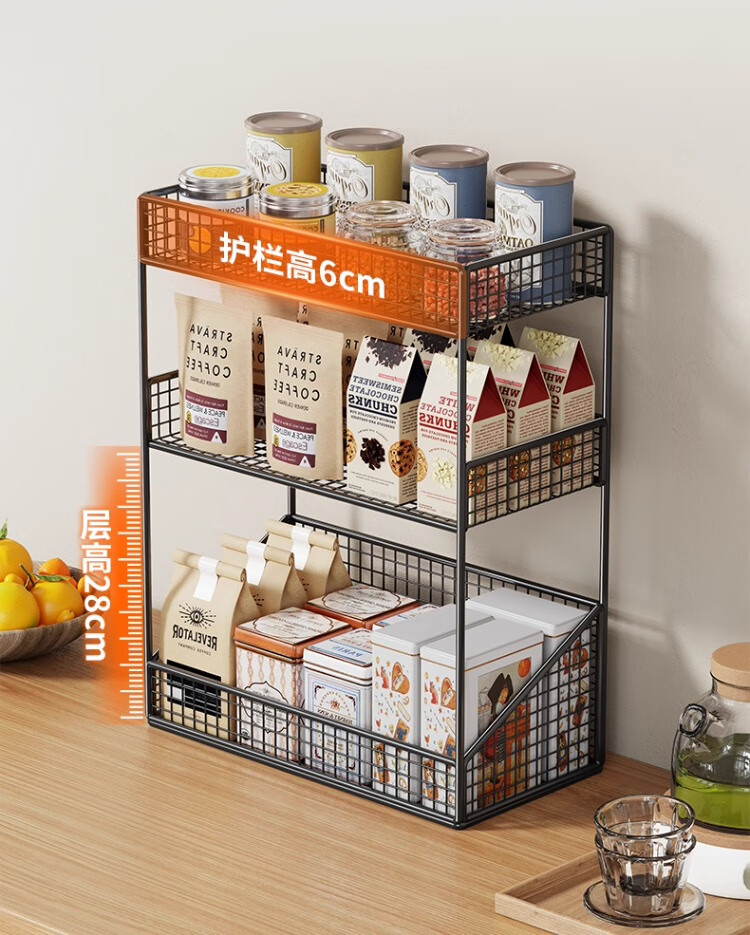 尔思家厨房置物架台面多层调料架零食架多功能收纳神器餐桌茶杯储物架 黑色三层加长-无轮