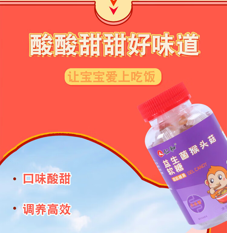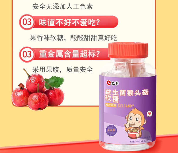 仁和益生菌猴头菇软糖肠胃山楂鸡内金儿童大人 30粒*3瓶 【实惠装】