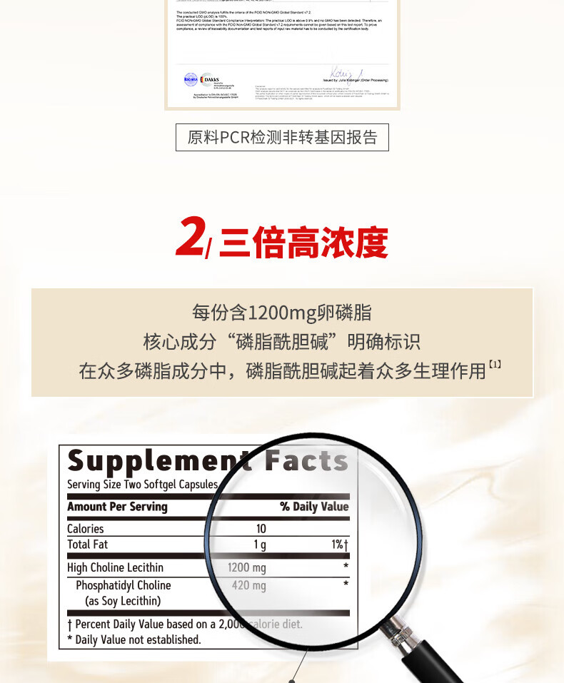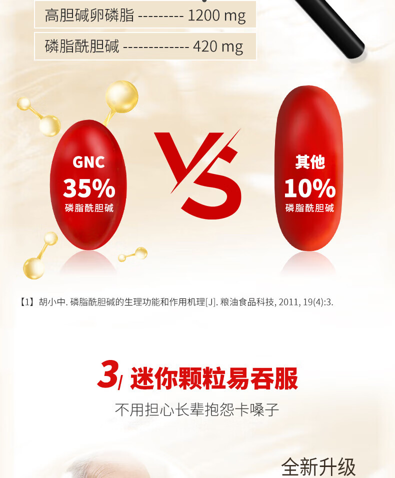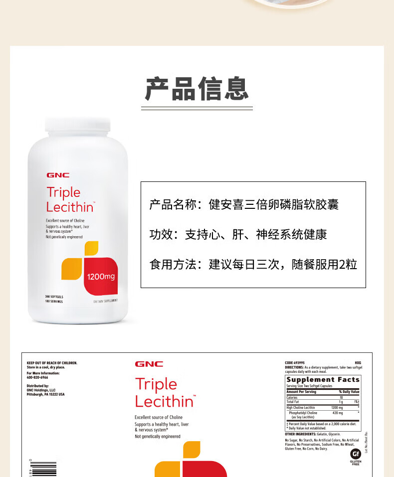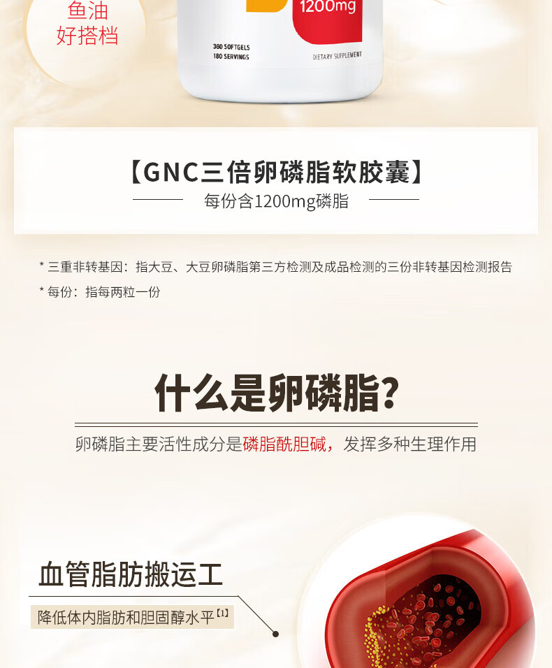 GNC健安喜三倍大豆卵磷脂软胶囊 1200mg高含量 鱼油好搭档呵护心肝脑 【非转基因】卵磷脂 180粒*1瓶
