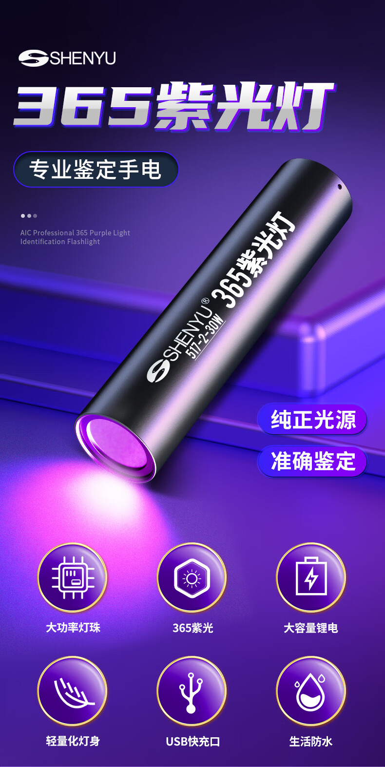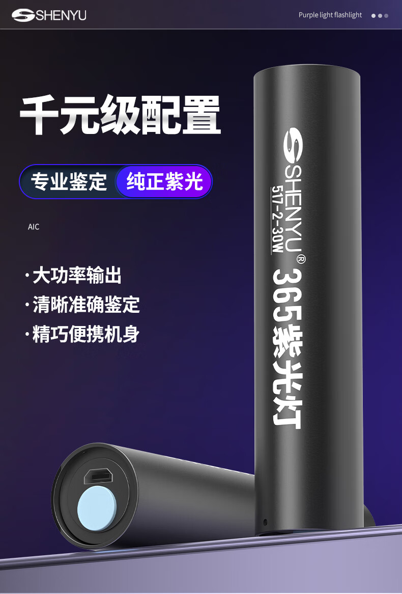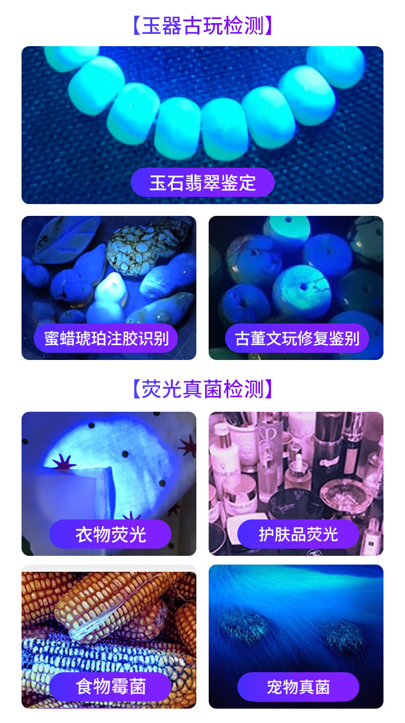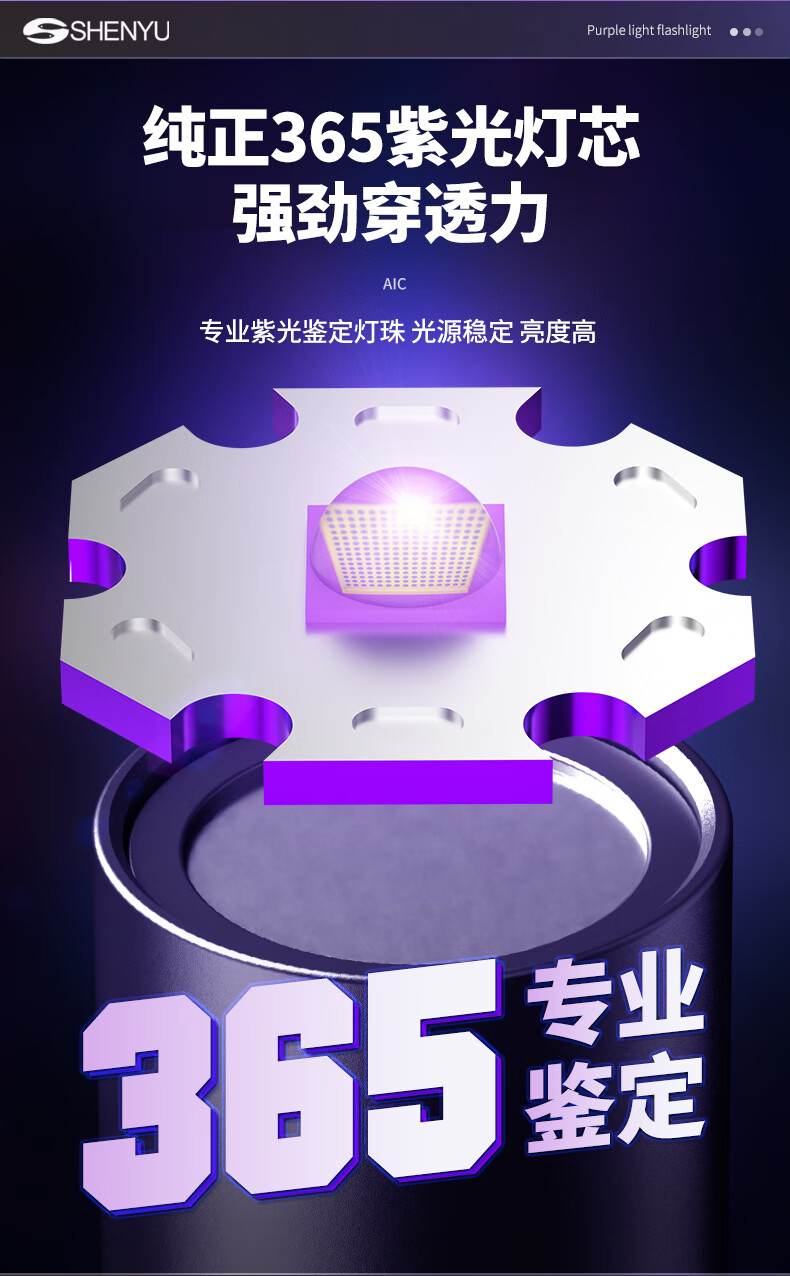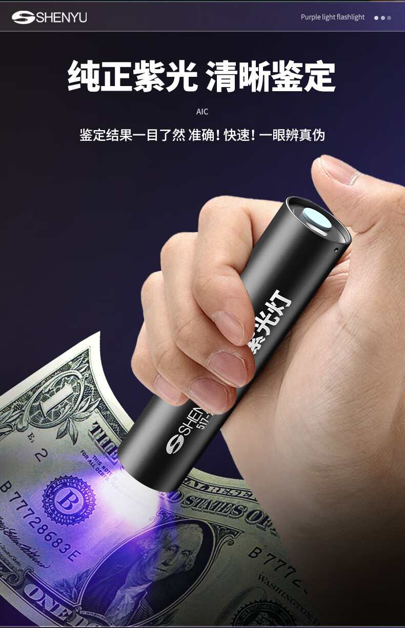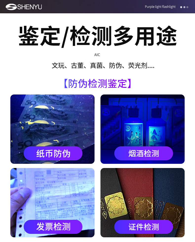 Aic紫光灯检测照烟酒专用验钞鉴定玉石翡翠365nm紫外线手电筒 紫光鉴定手电筒365NM
