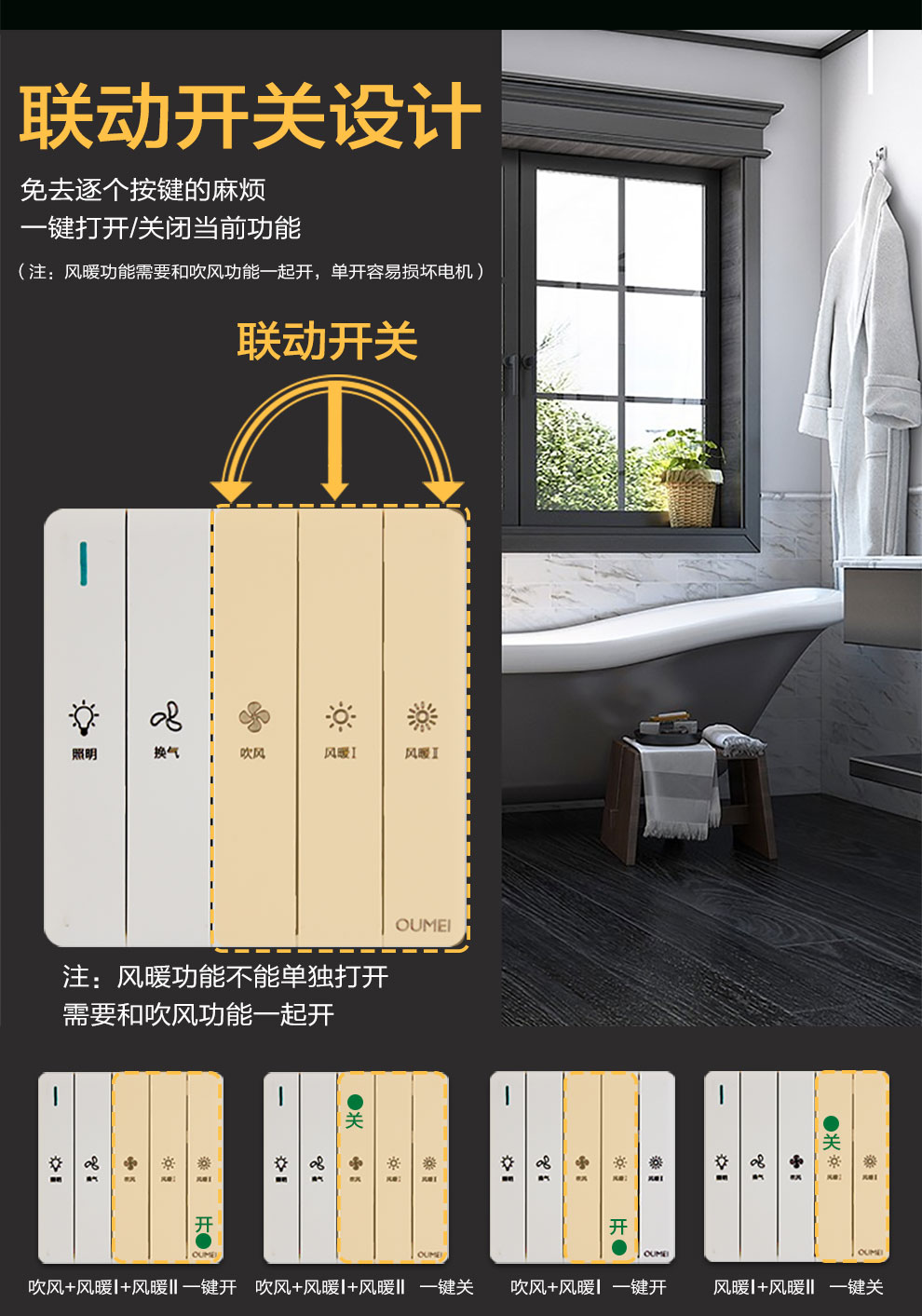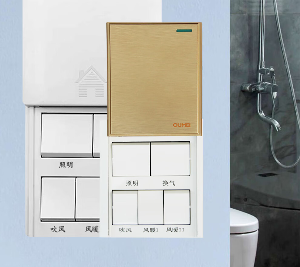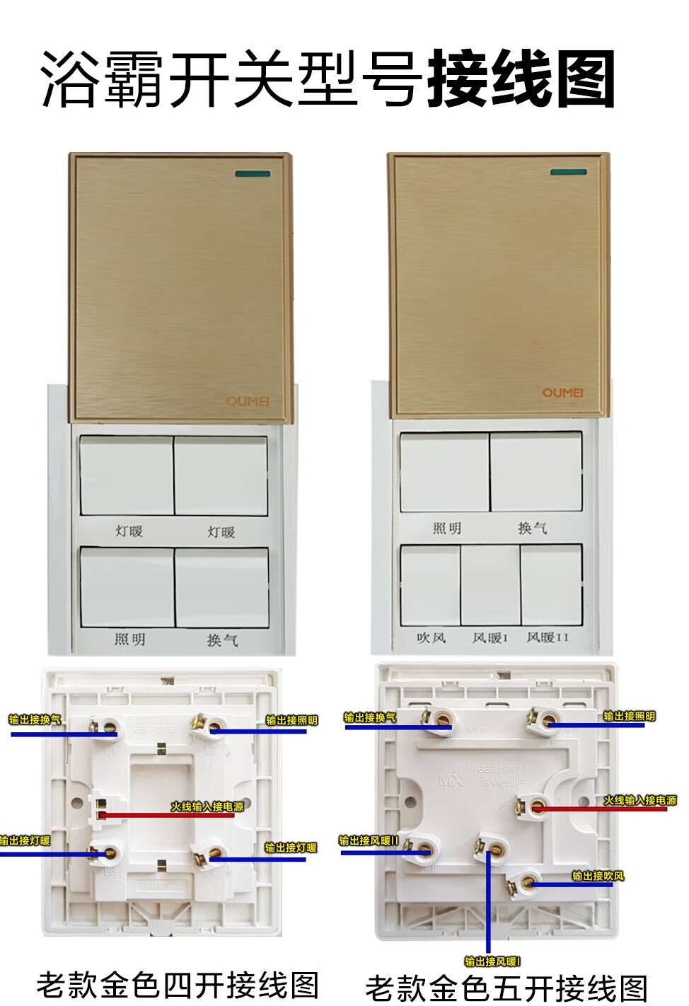 朗格瑞奇 欧美光源 家用 四开/五开五合一双电机 夜光浴霸开关浴室卫生间 金色-浴霸四开