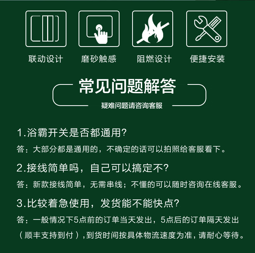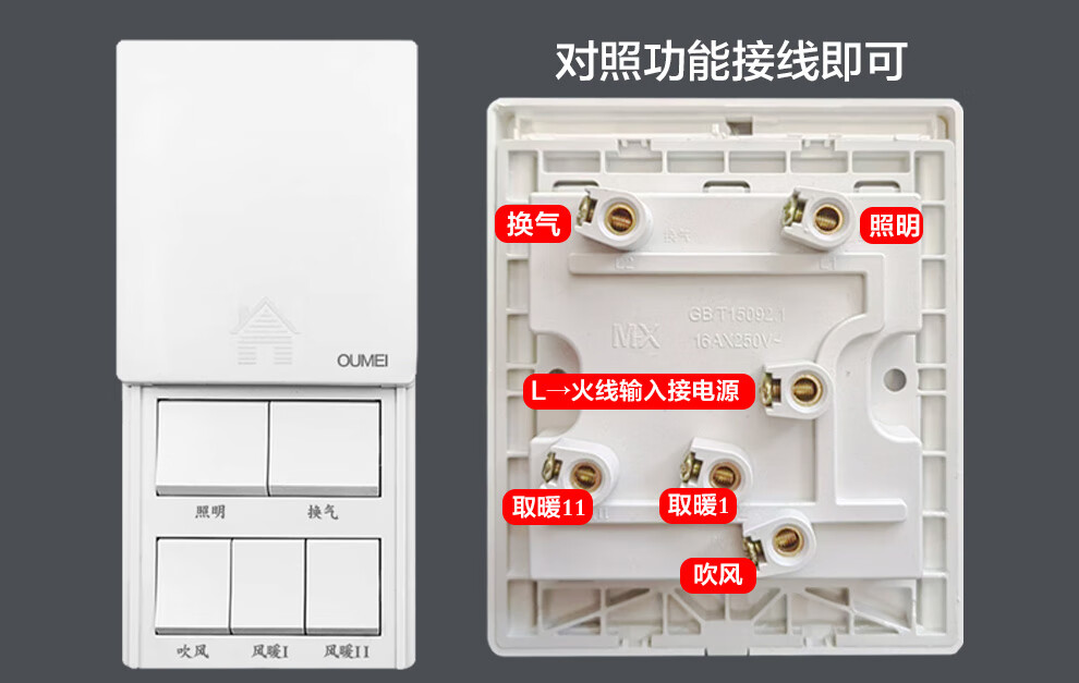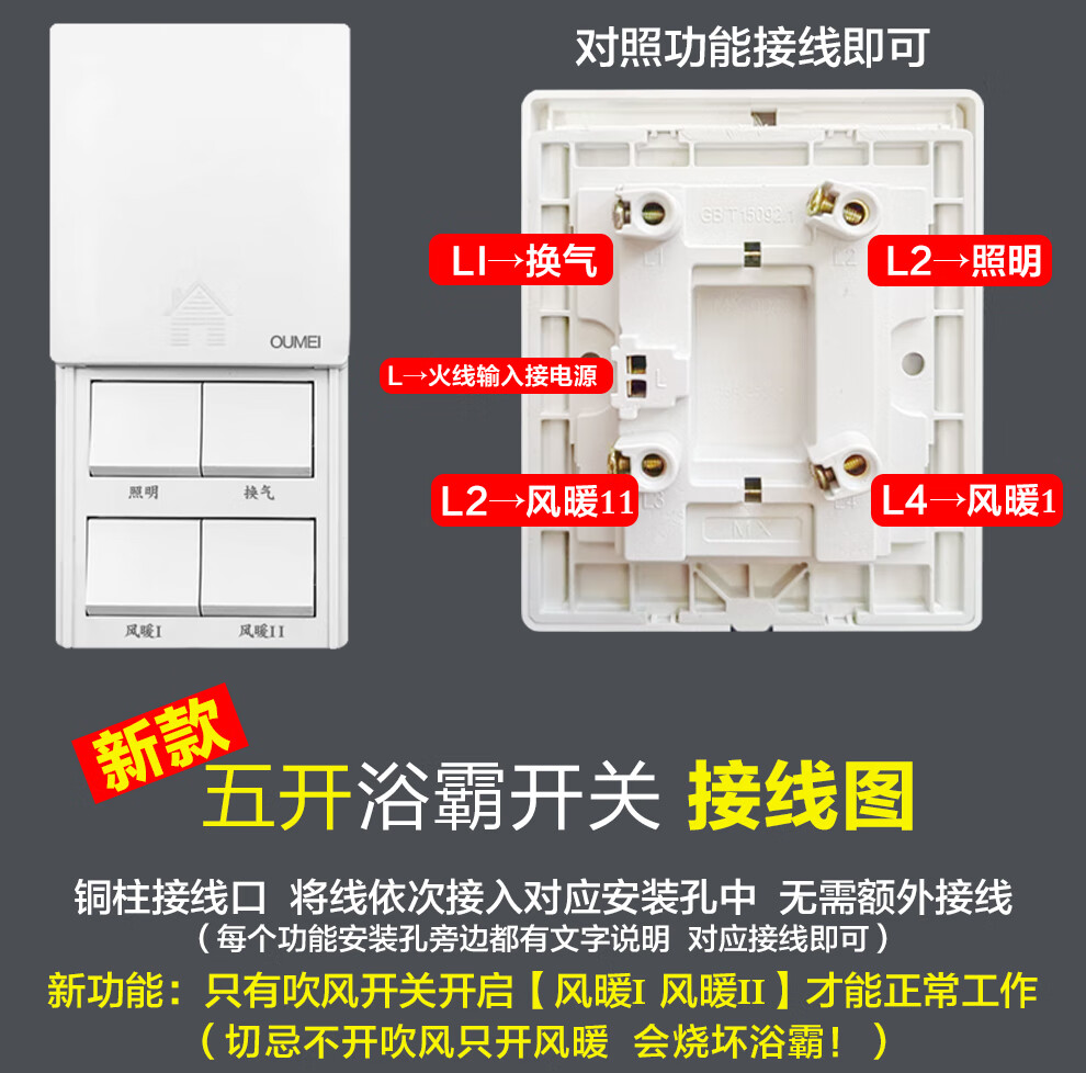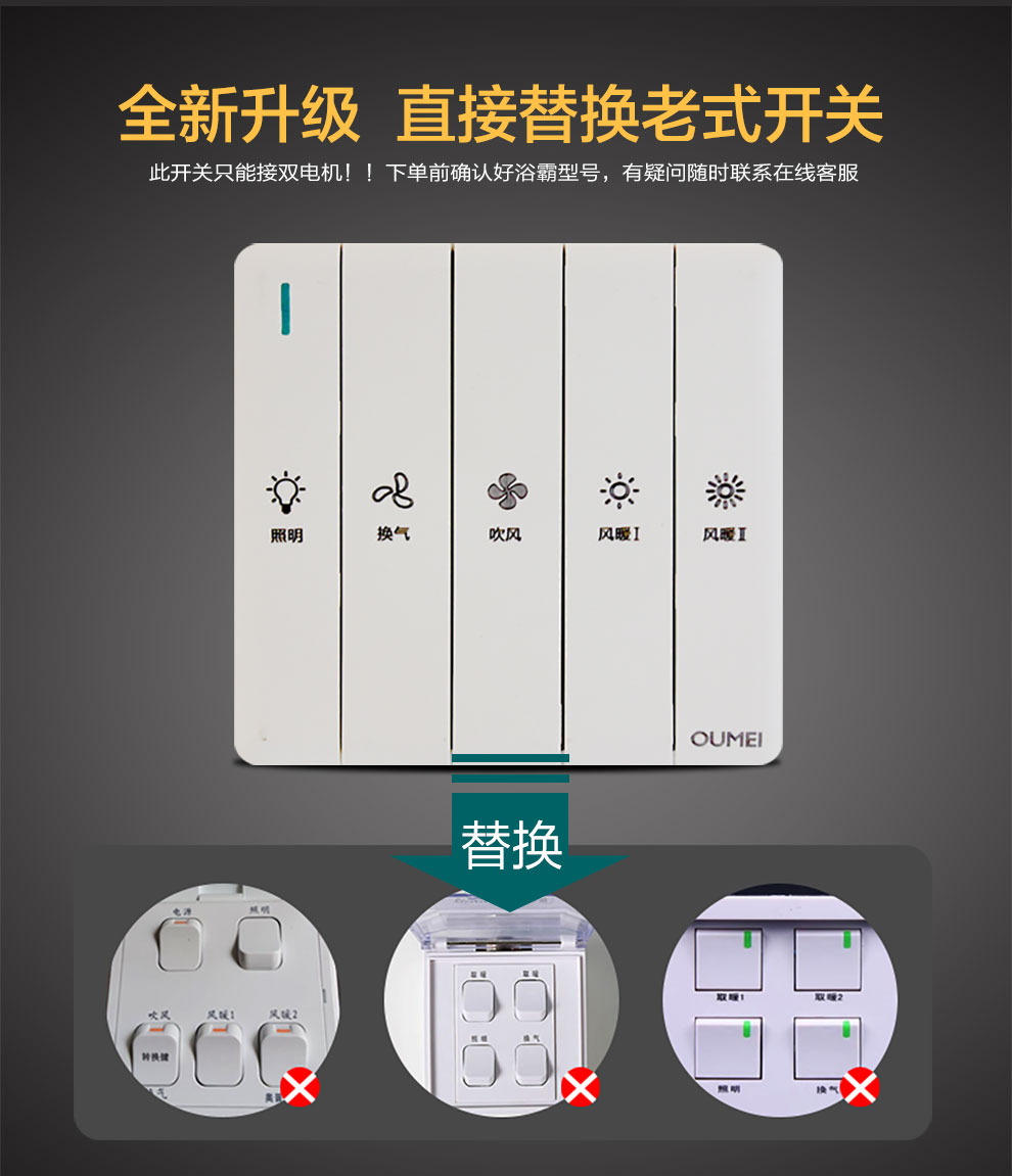 朗格瑞奇 欧美光源 家用 四开/五开五合一双电机 夜光浴霸开关浴室卫生间 金色-浴霸四开