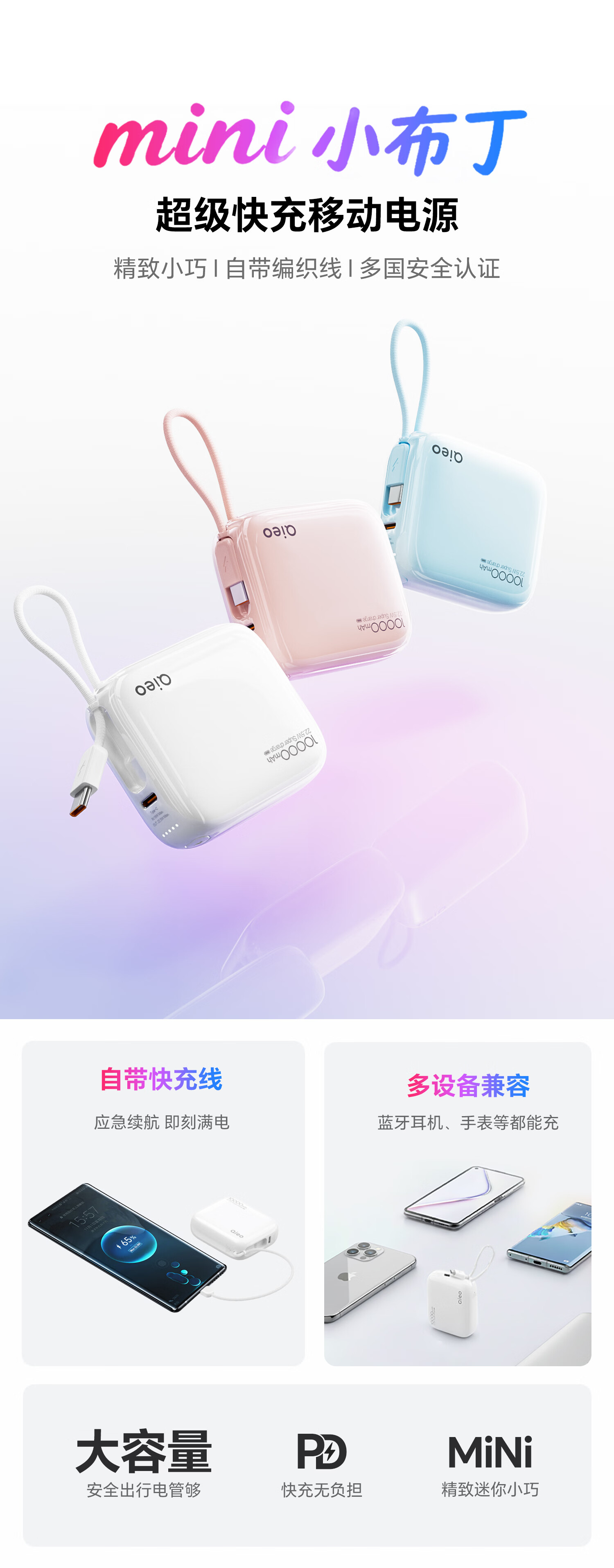 Qieo【新3c认证丨胖东商超爆卖】充电宝20000毫安 可上飞机小巧便携自带线超大容量 快充小米华为苹果 新3C【10000mAh|超小巧】旗舰版 云雾白