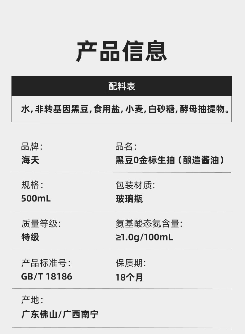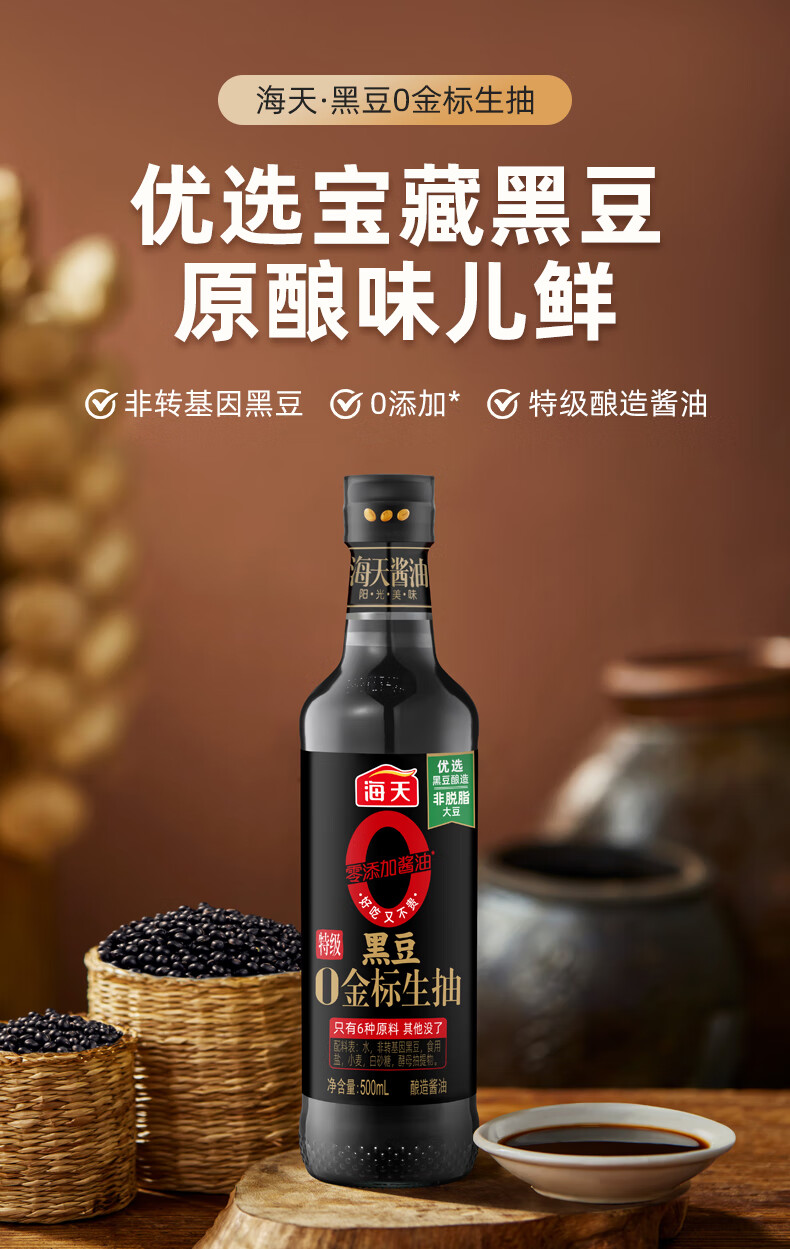 海天 0金标黑豆生抽酱油500ml【黑豆酿造特级酱油】金标系列