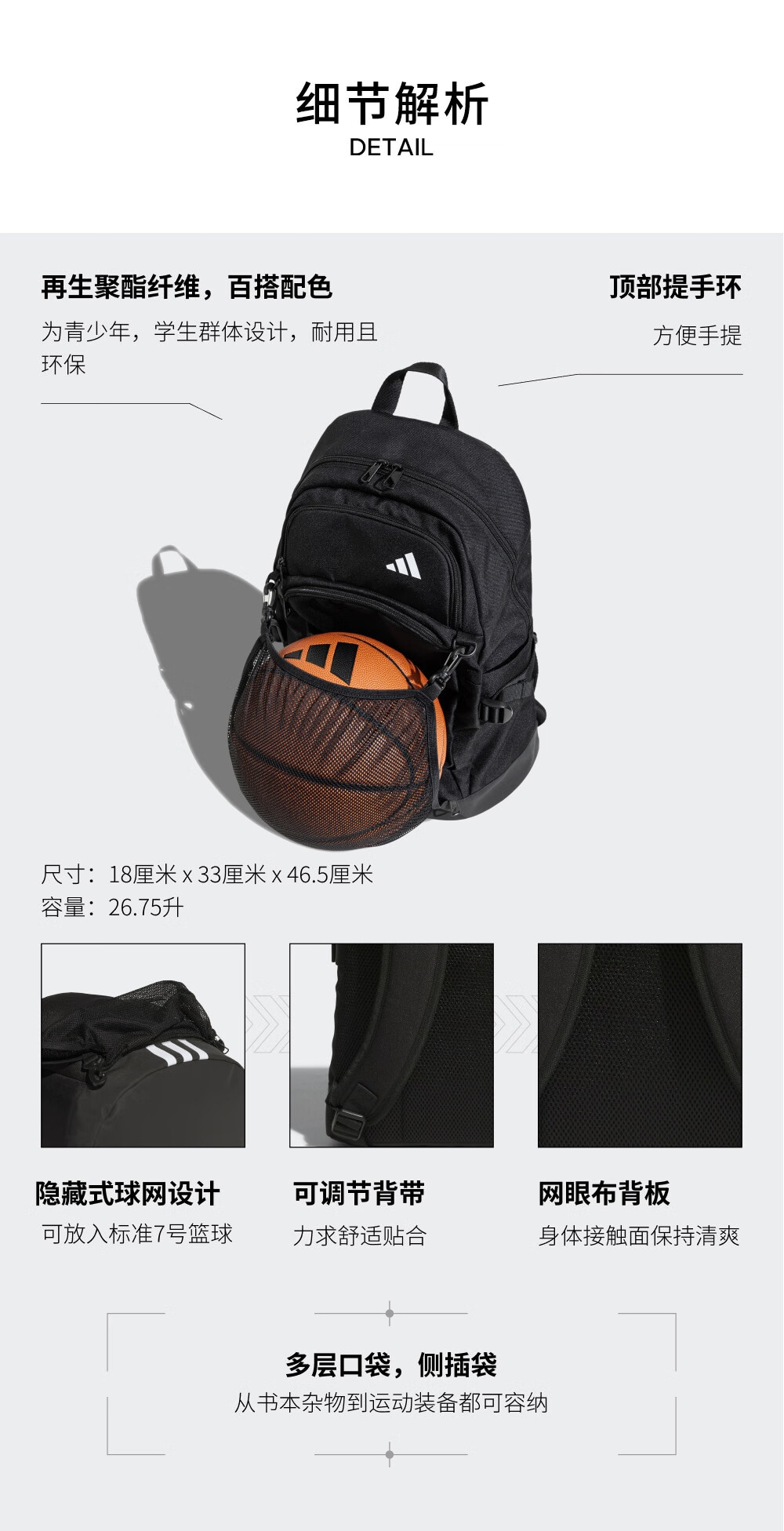 阿迪达斯(adidas)背包男包女包 新款篮球大容量可调节多口袋运动双肩背包 JY3329/制服蓝 NS/以实物为准