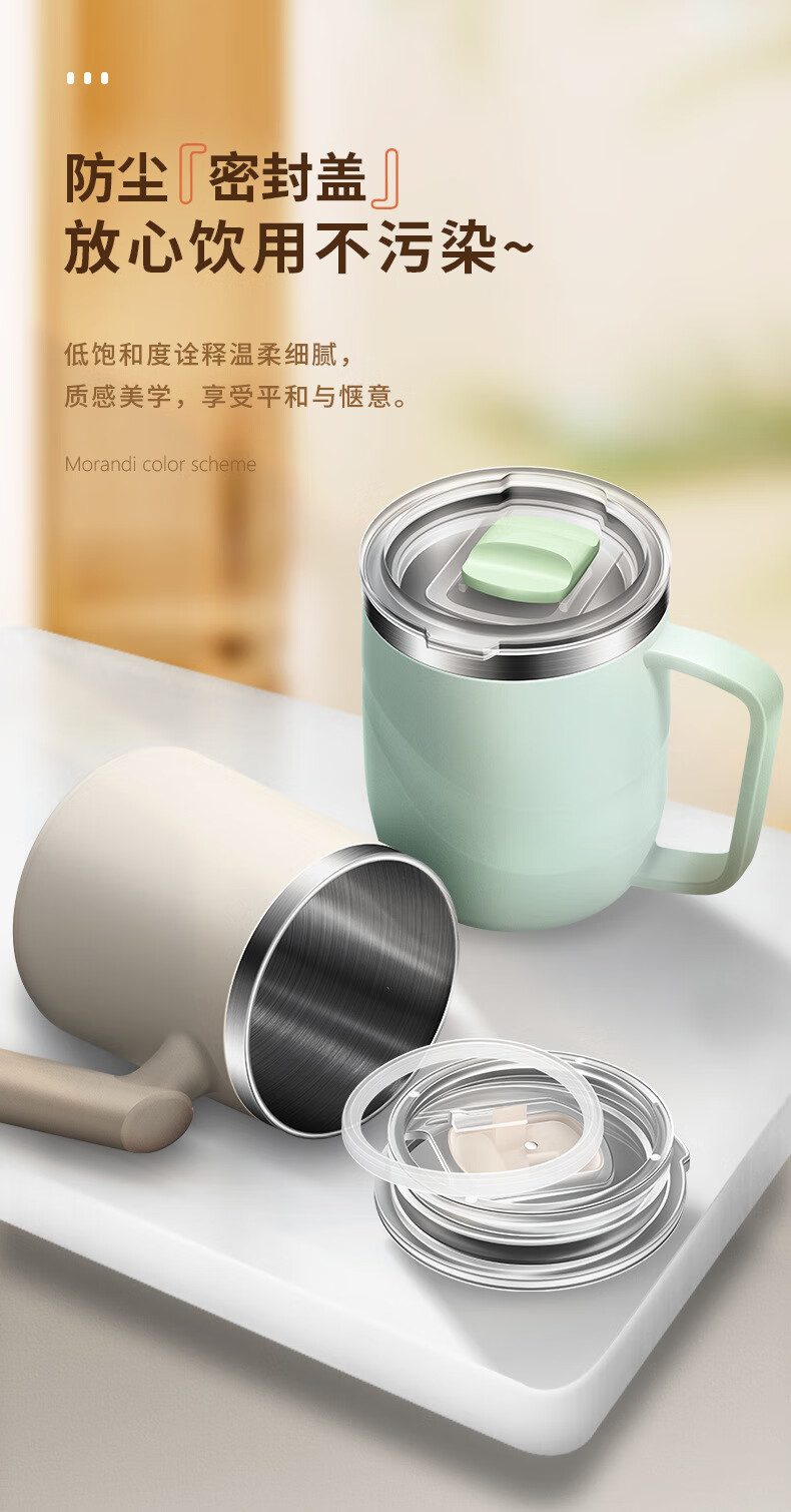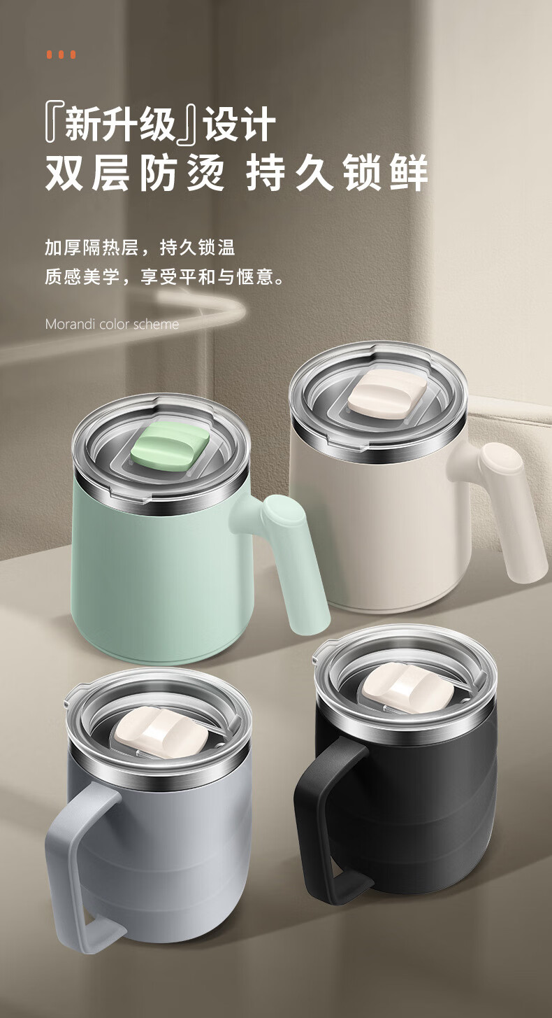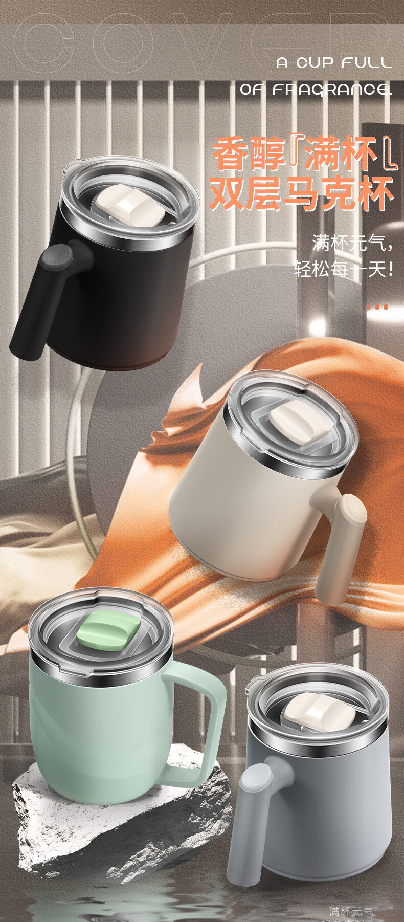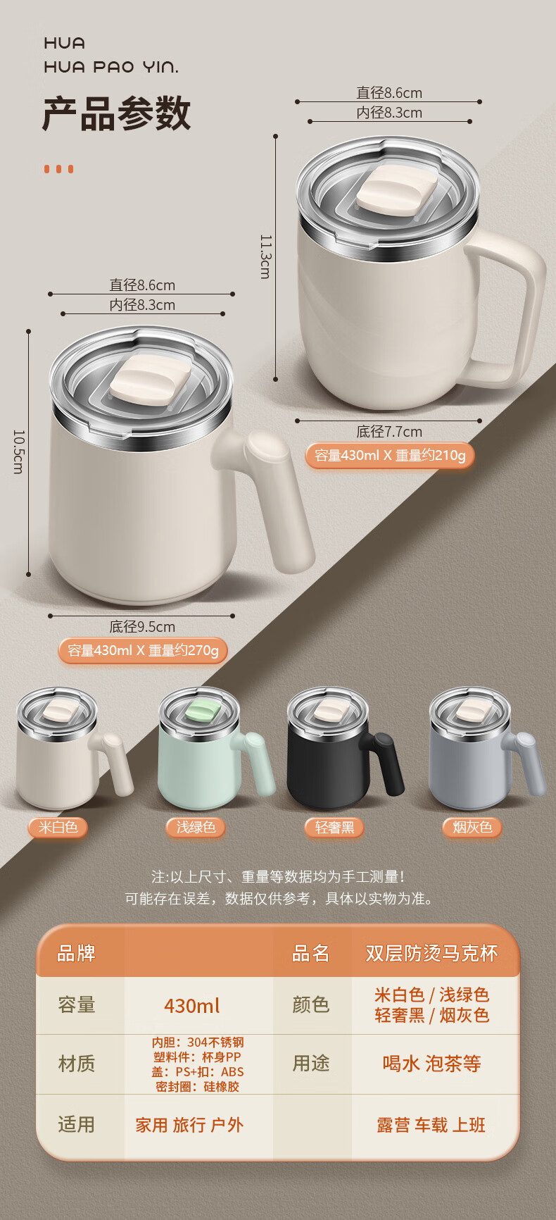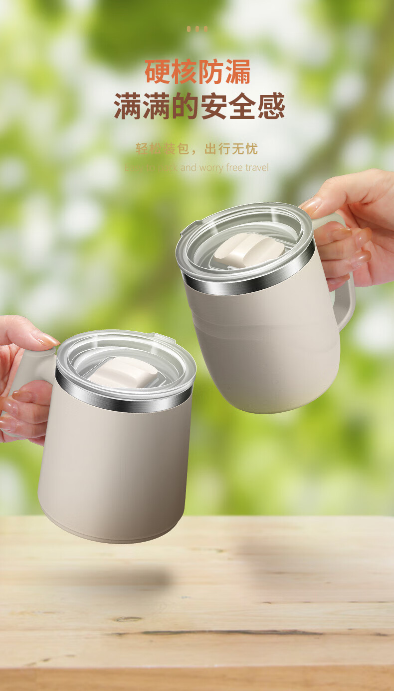 AKL【严选好物】不锈钢西瓜马克杯便携带盖办公室茶杯双层防烫咖啡杯 【米白色-斜身款】双层防烫马克杯 430ml