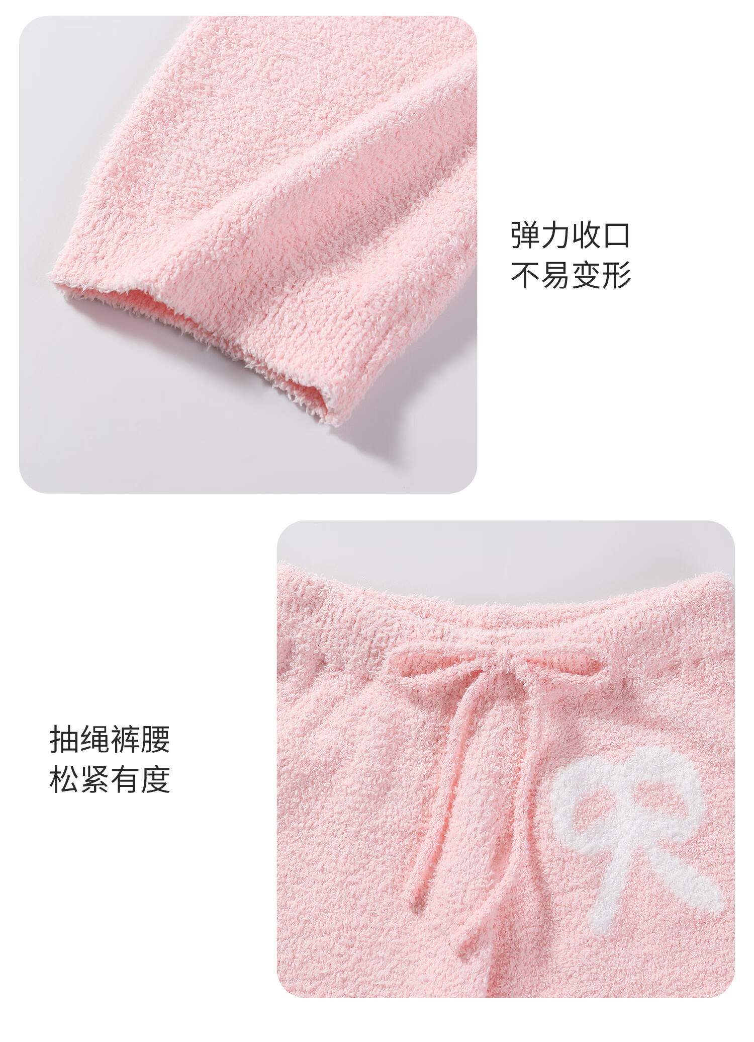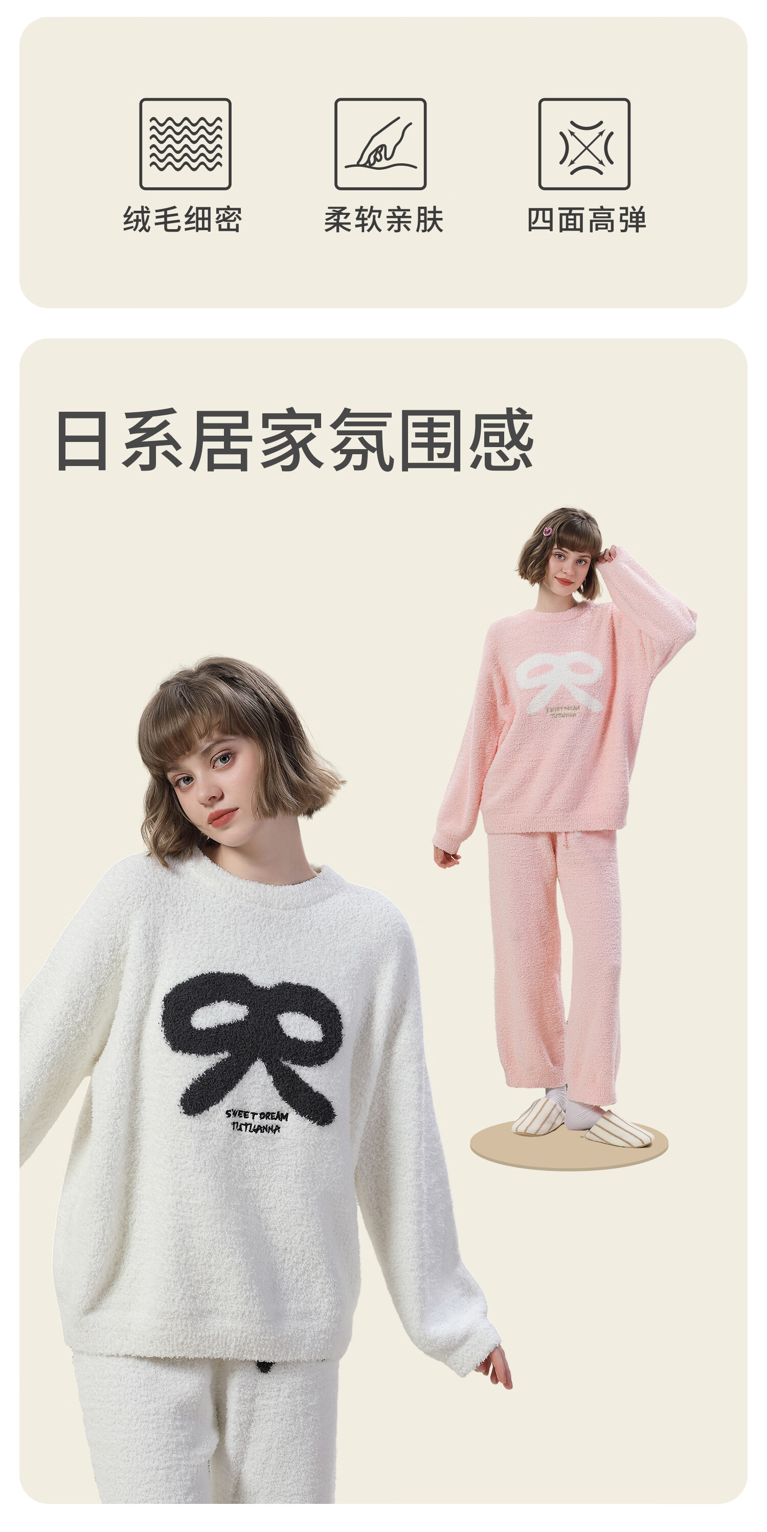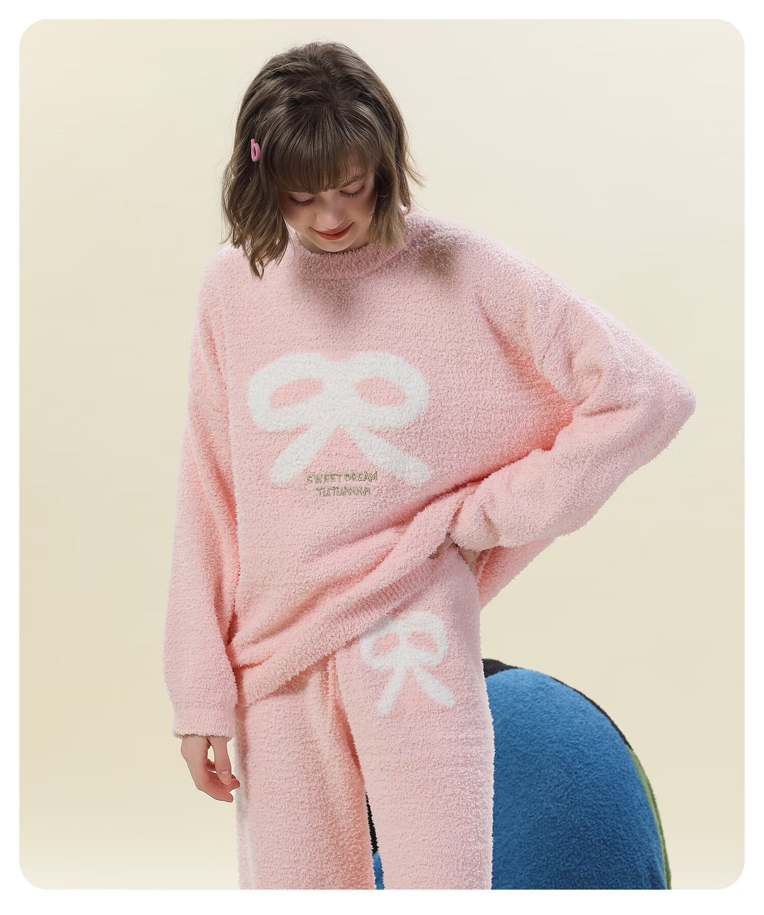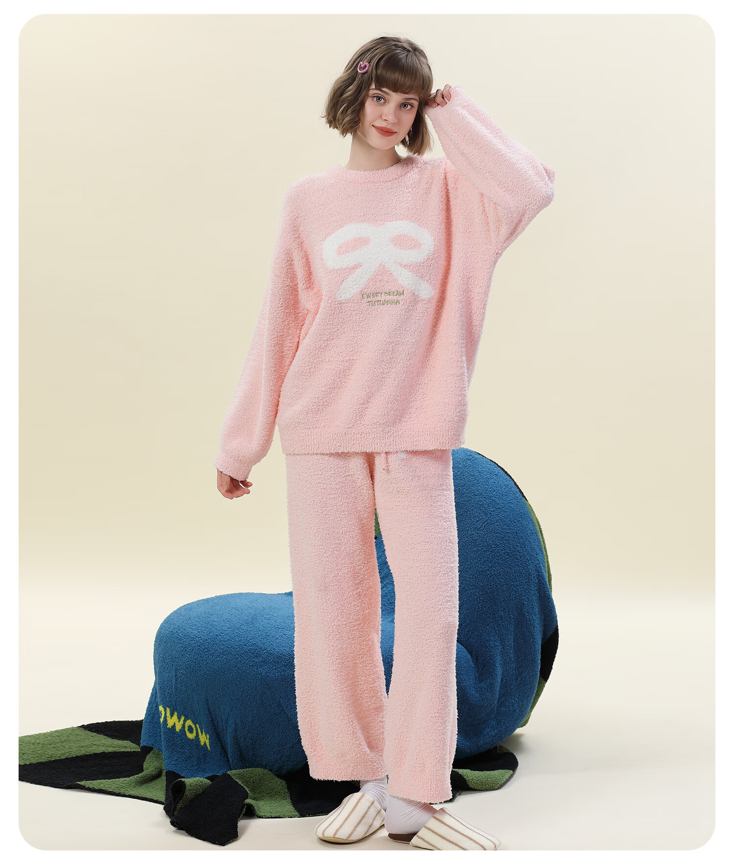 tutuanna半边绒纯色蝴蝶结套头长袖长裤套装睡衣毛毛纱秋冬厚款保暖 粉色 均码 160/84A