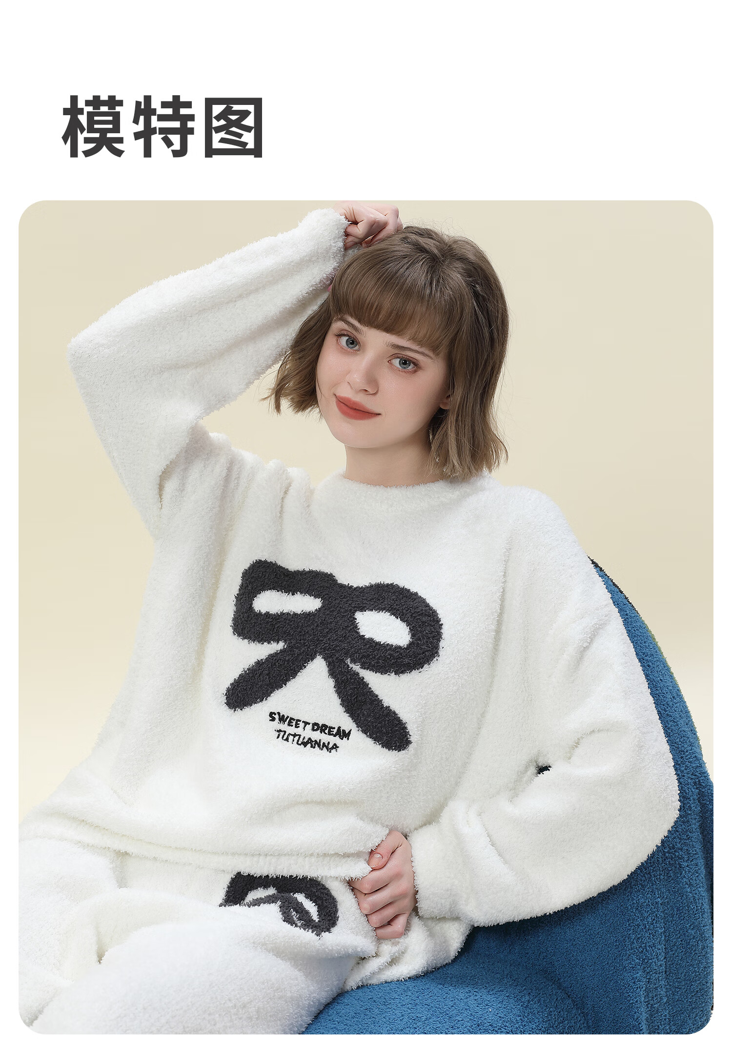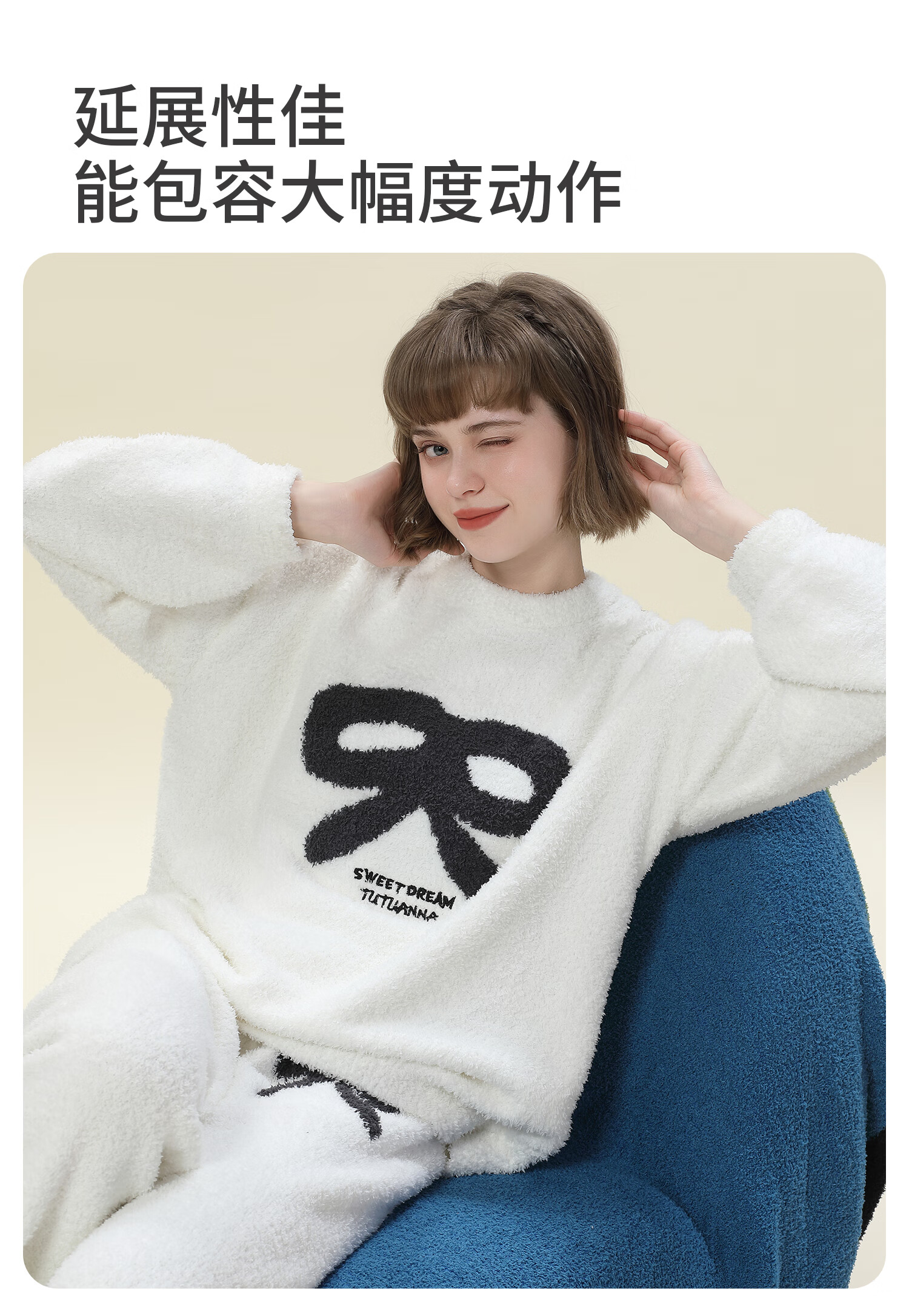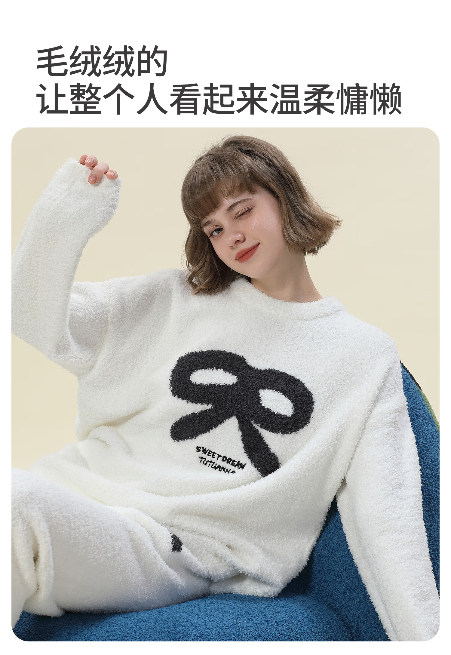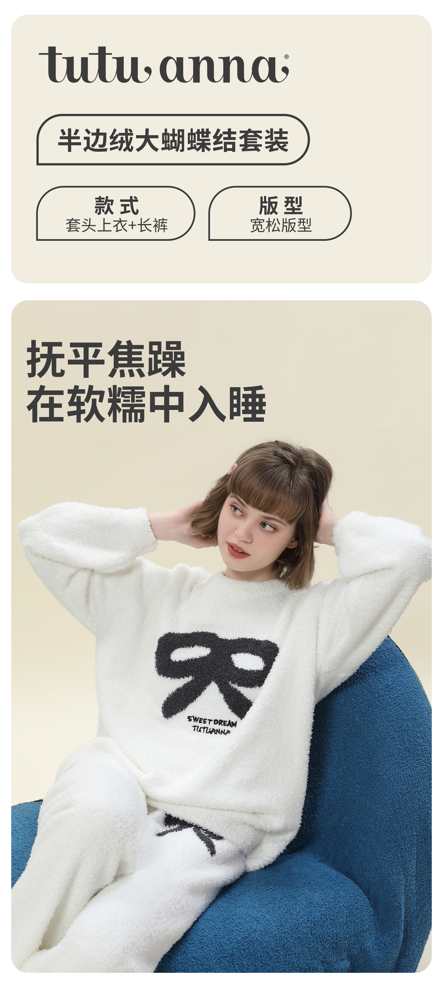 tutuanna半边绒纯色蝴蝶结套头长袖长裤套装睡衣毛毛纱秋冬厚款保暖 粉色 均码 160/84A