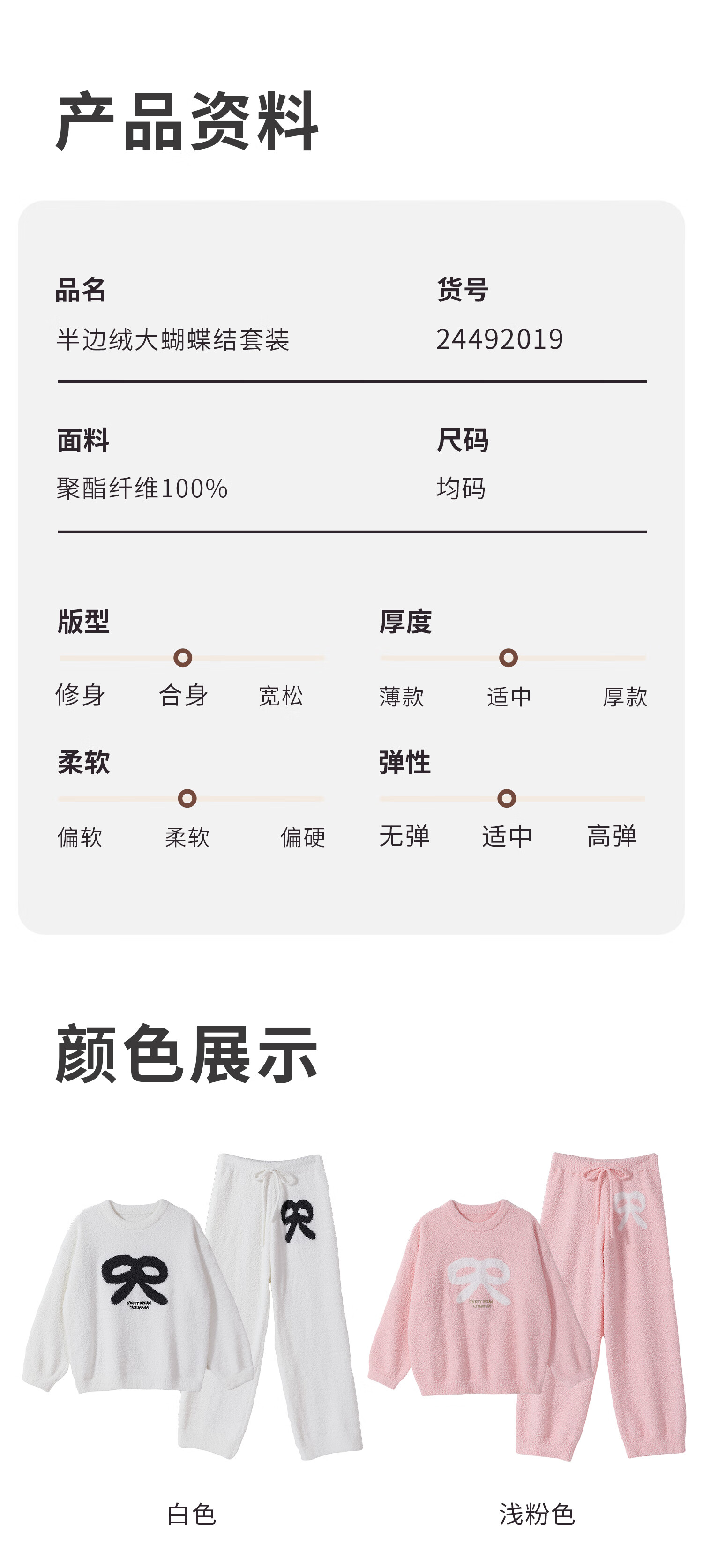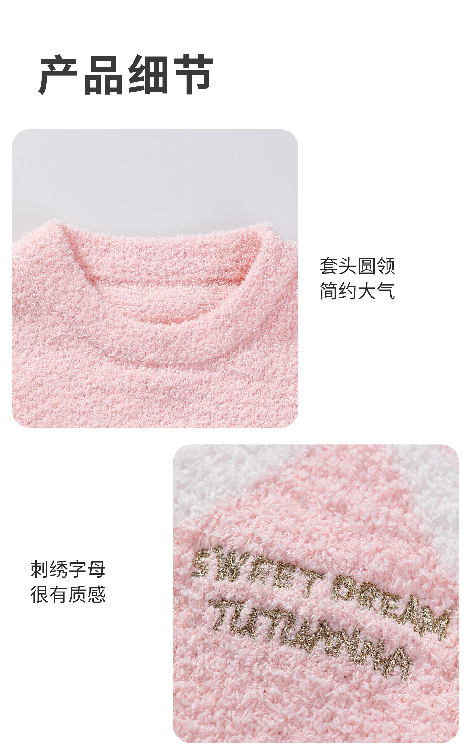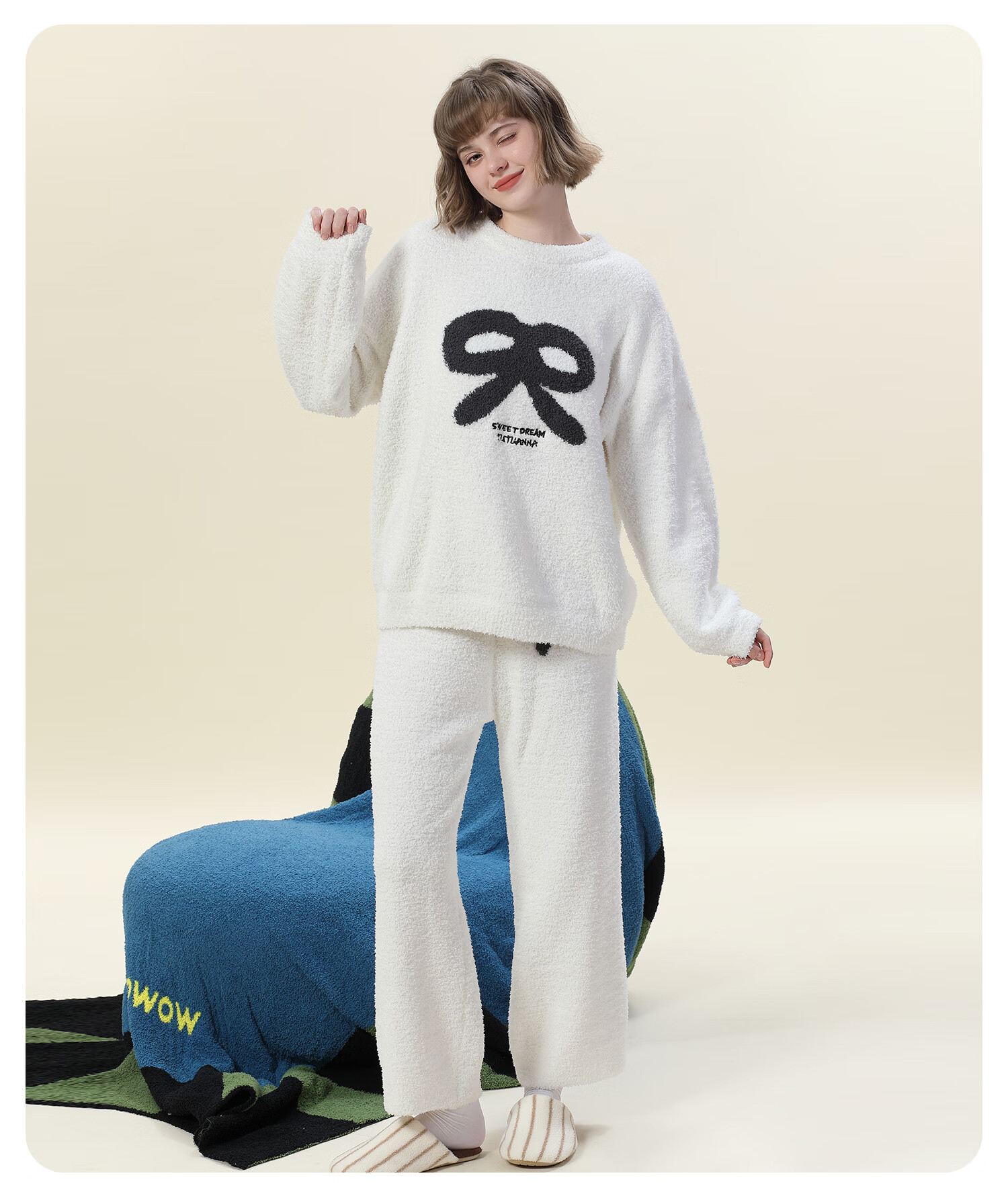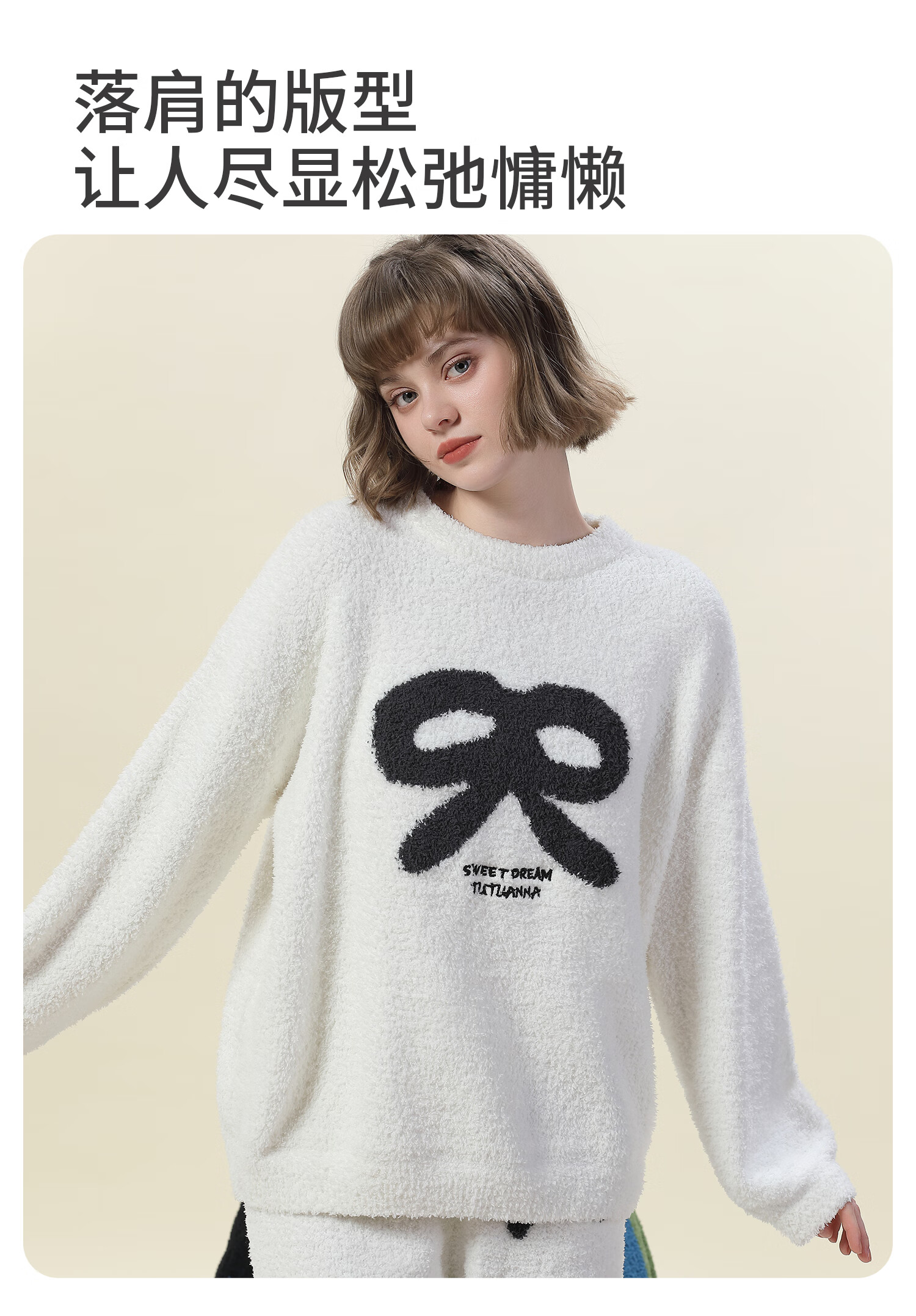 tutuanna半边绒纯色蝴蝶结套头长袖长裤套装睡衣毛毛纱秋冬厚款保暖 粉色 均码 160/84A
