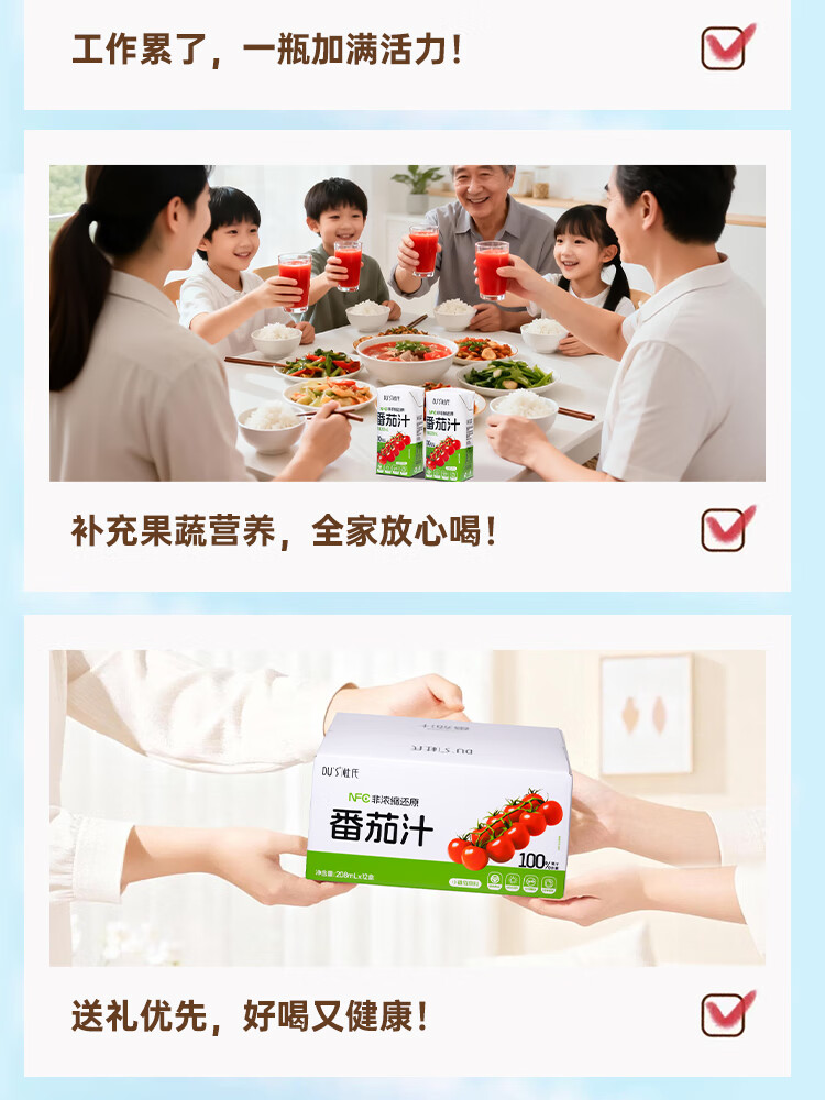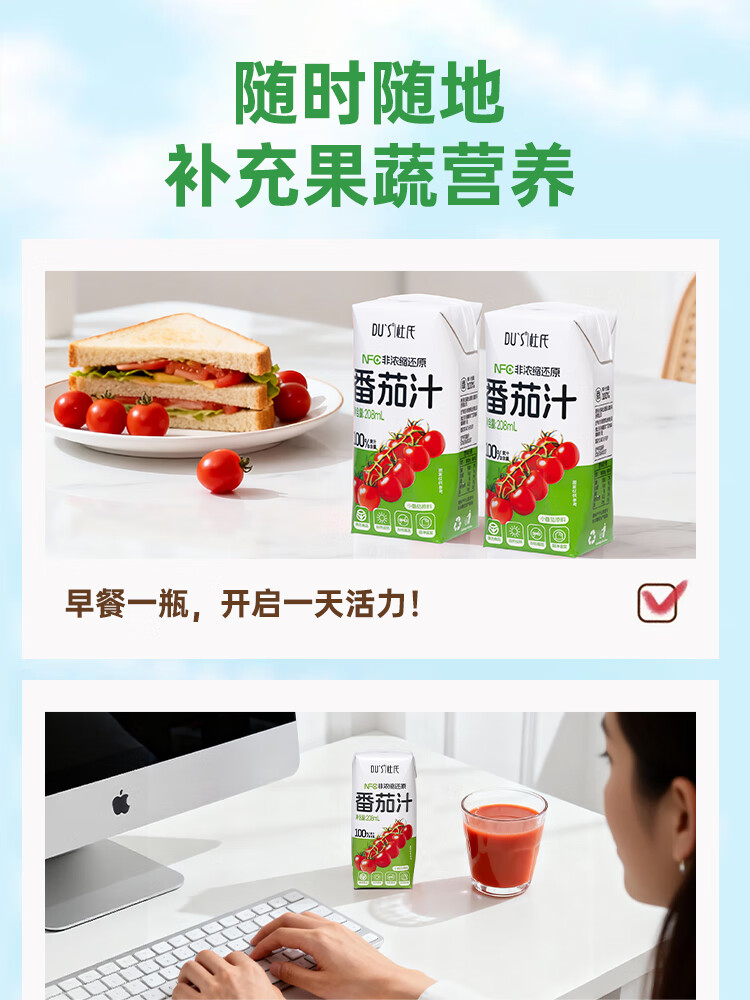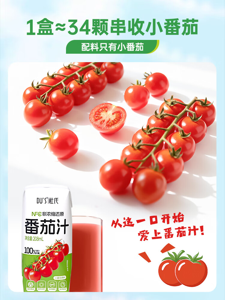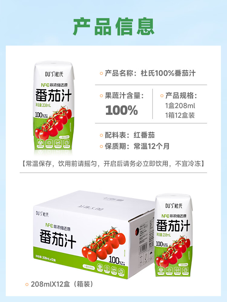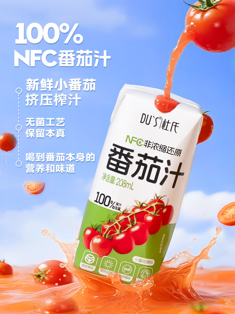 DU'S杜氏NFC番茄汁100%果蔬汁纯果汁饮料整箱 208ml*12盒/箱 年货节 单箱-12盒