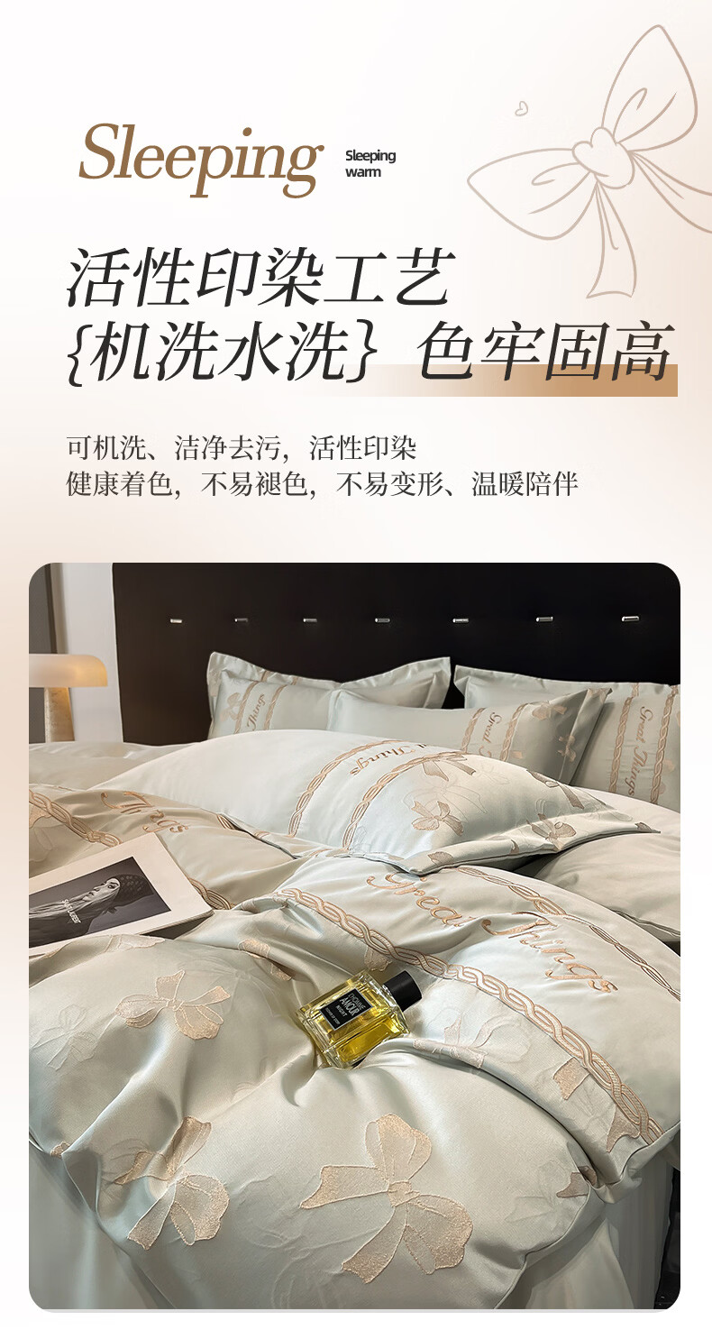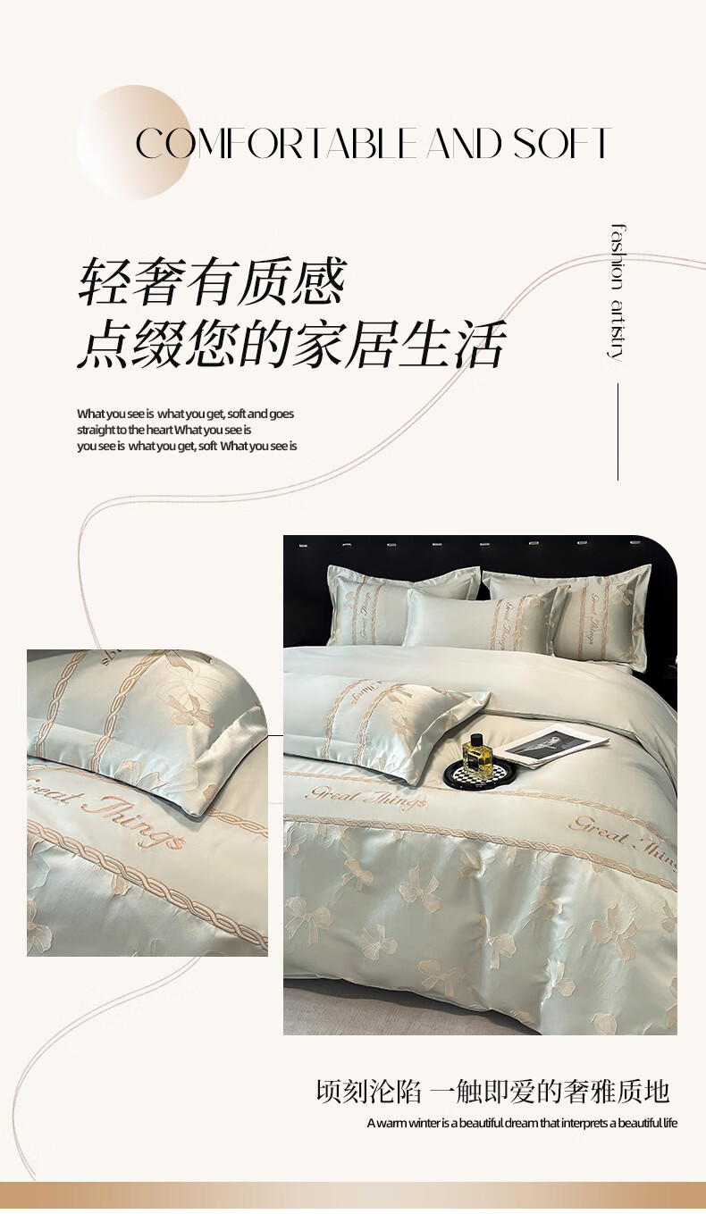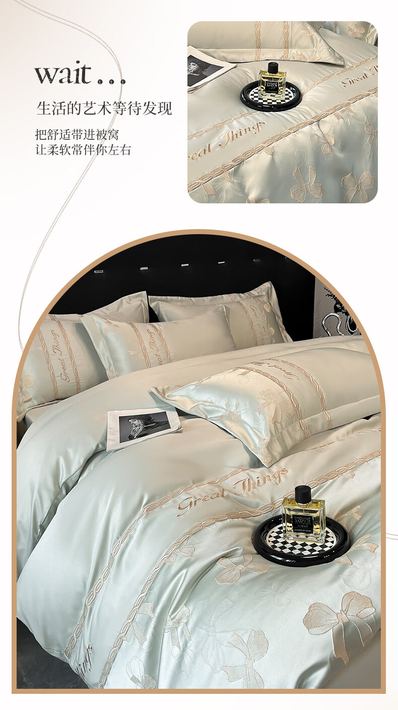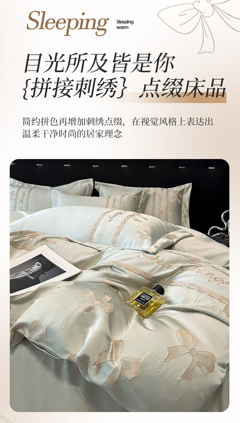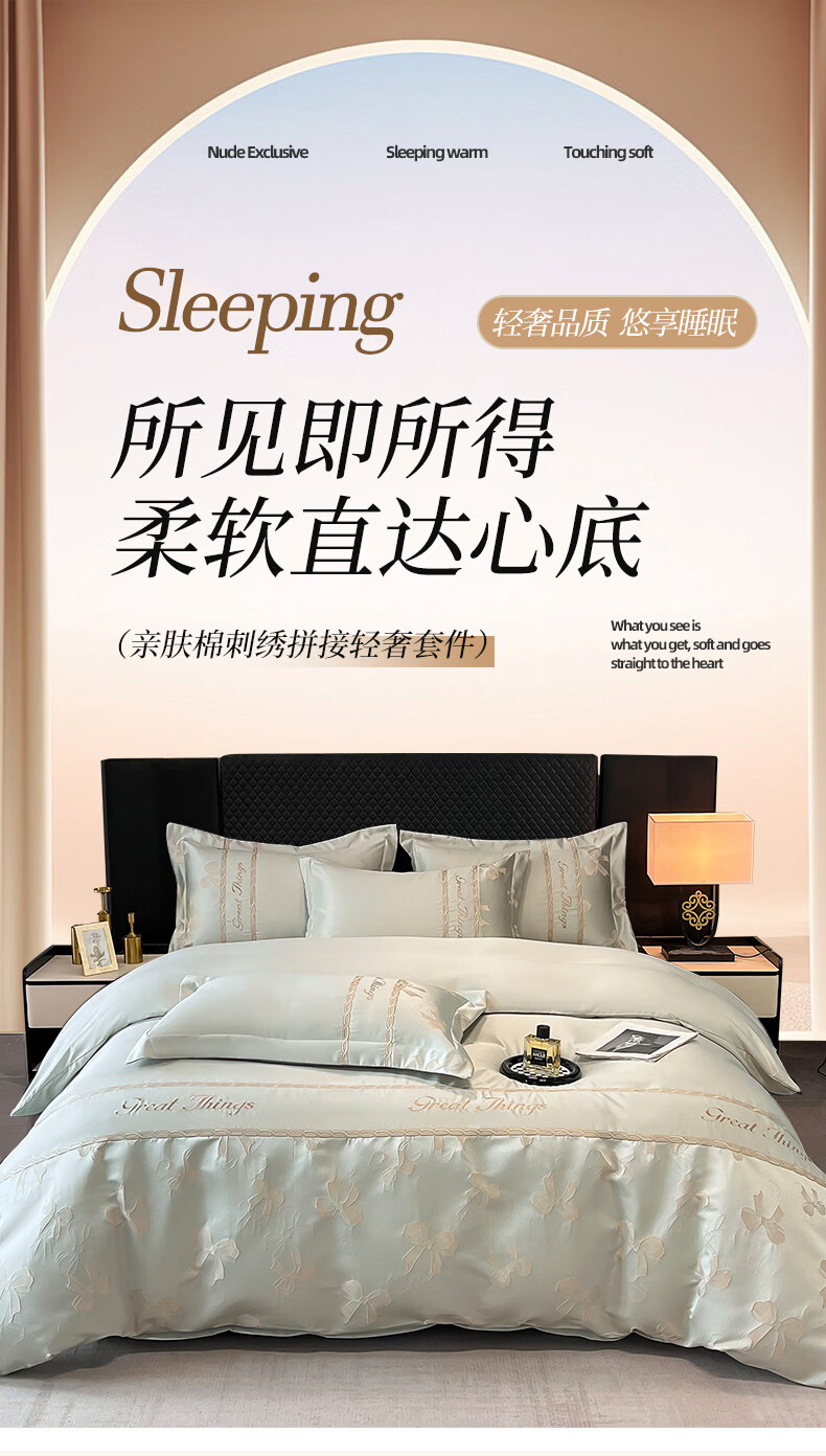 VJE轻奢裸睡床上四件套亲肤棉刺绣拼接床单被套金丝提花床上用品4件 情结-繁星蓝 四件套1.5m 床单款 (被套200*230cm)