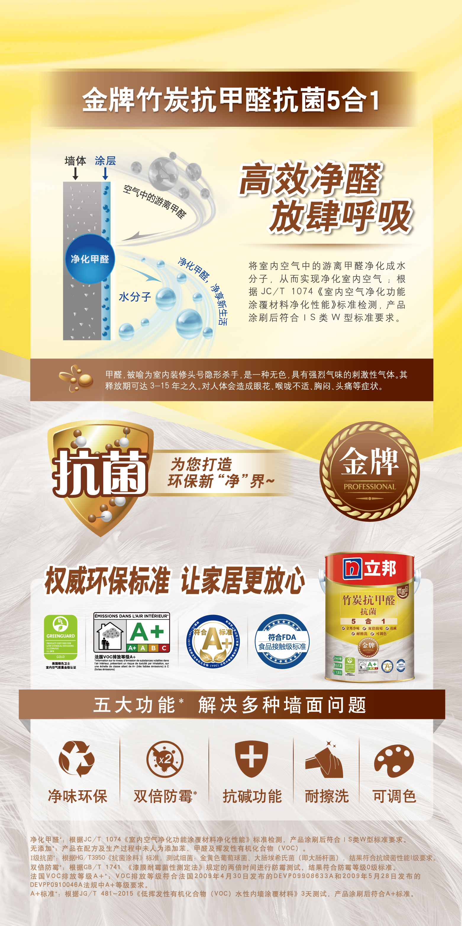 立邦【同城购】金牌竹炭抗甲醛抗菌5合1内墙乳胶漆 5L【单桶装】