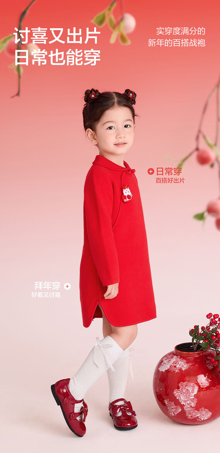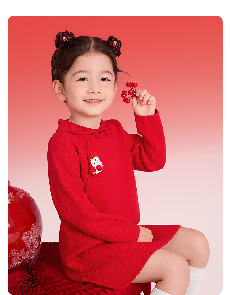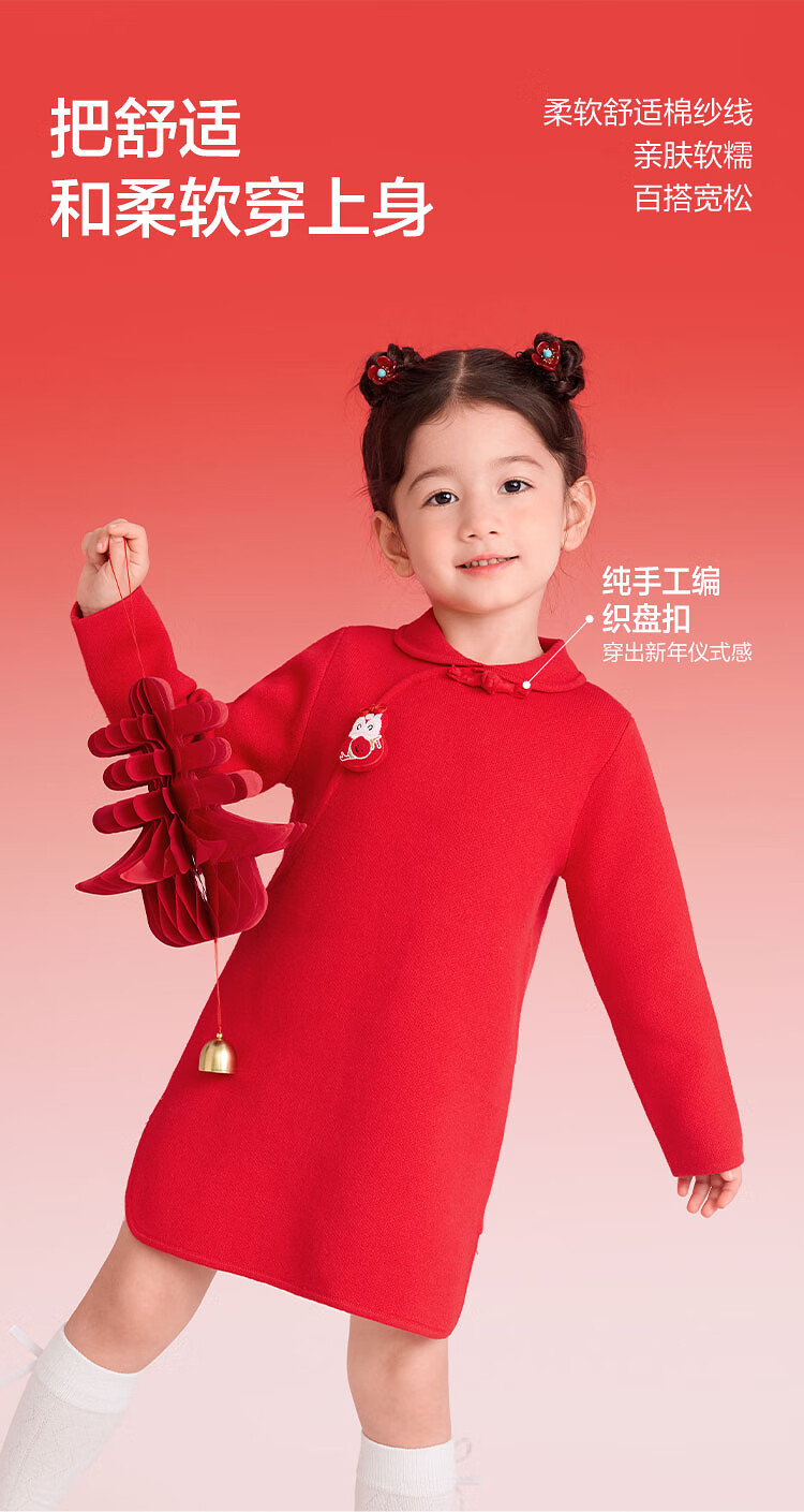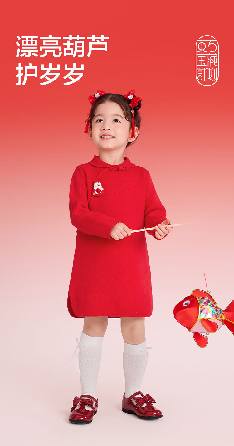 巴拉巴拉童装儿童连衣裙女童新中式红色新年拜年服吉祥好运裙 中国红60611 130