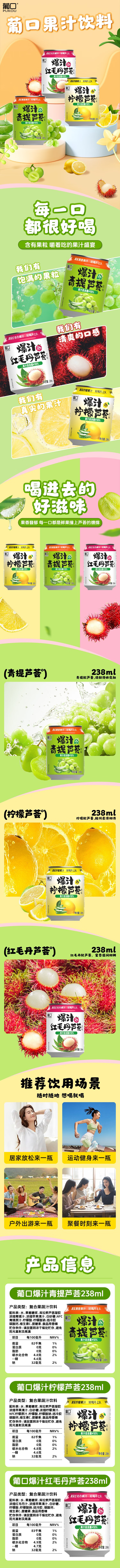 葡口果肉果汁饮料柠檬青提红毛丹芦荟复合爆汁饮料原料新鲜果粒饱满 【青提4柠檬3红毛丹3】238ml*10罐/箱 【破损包赔】