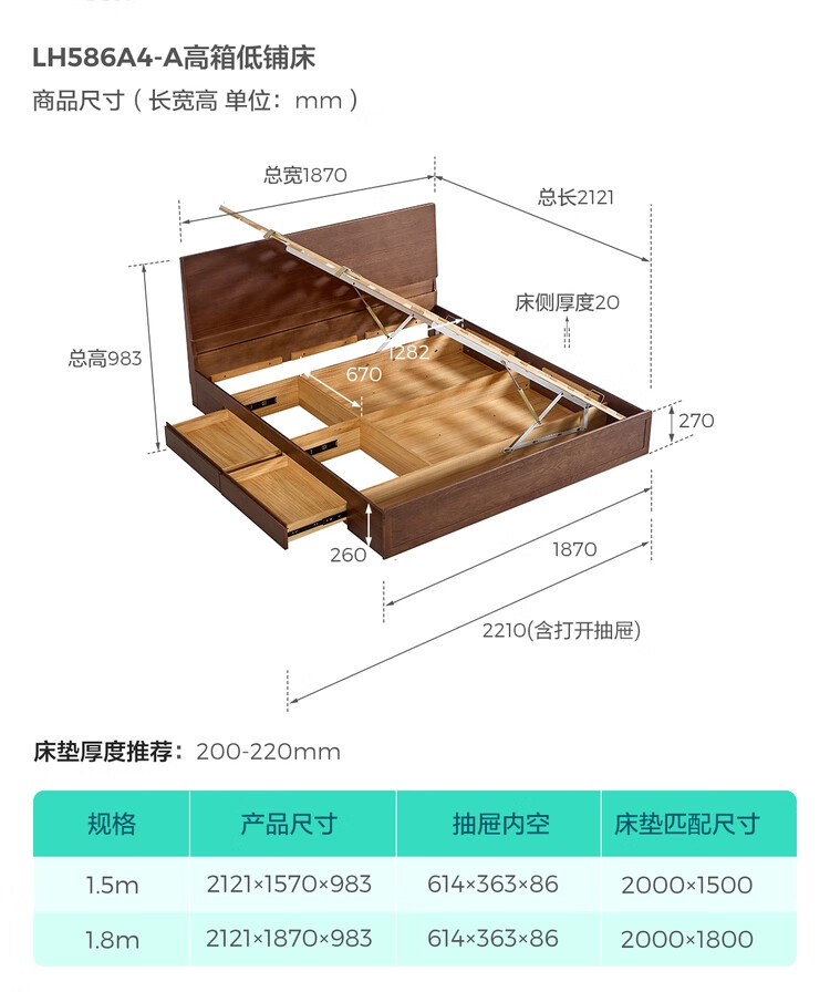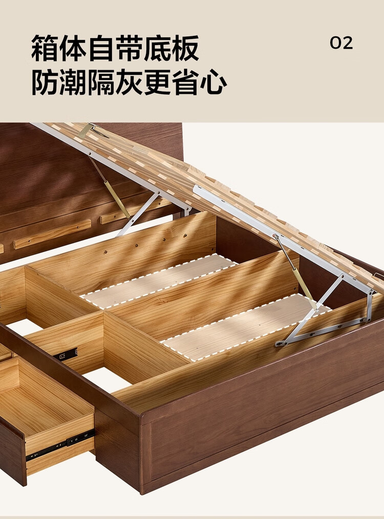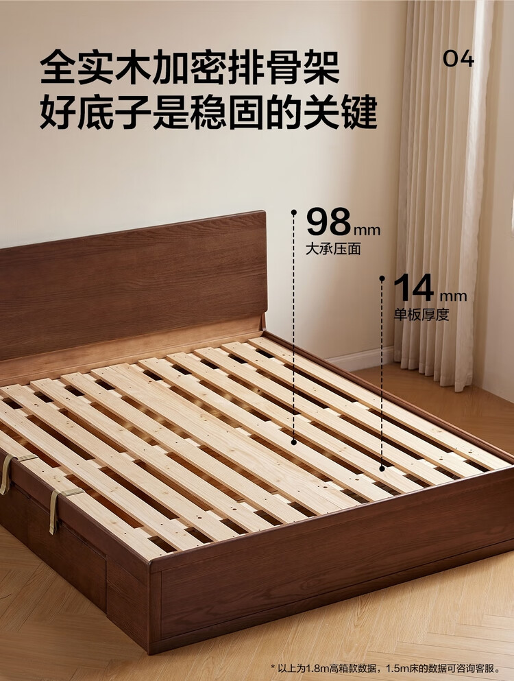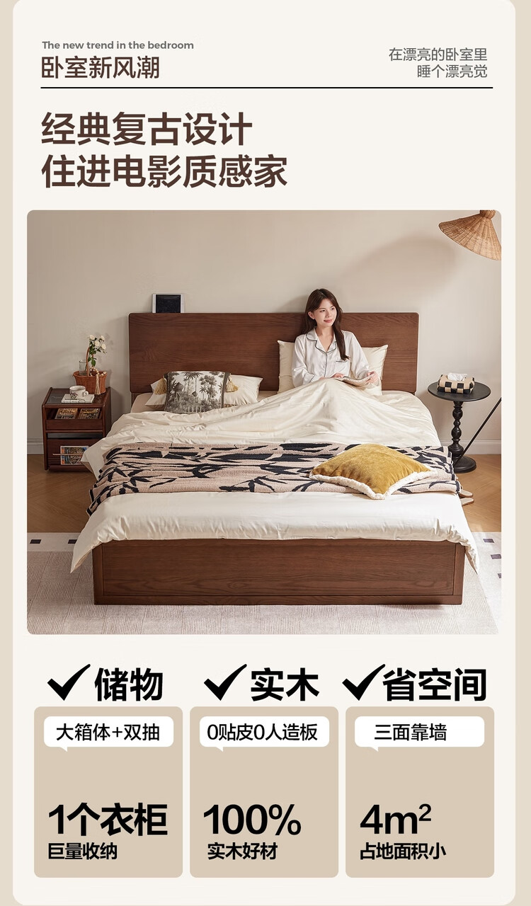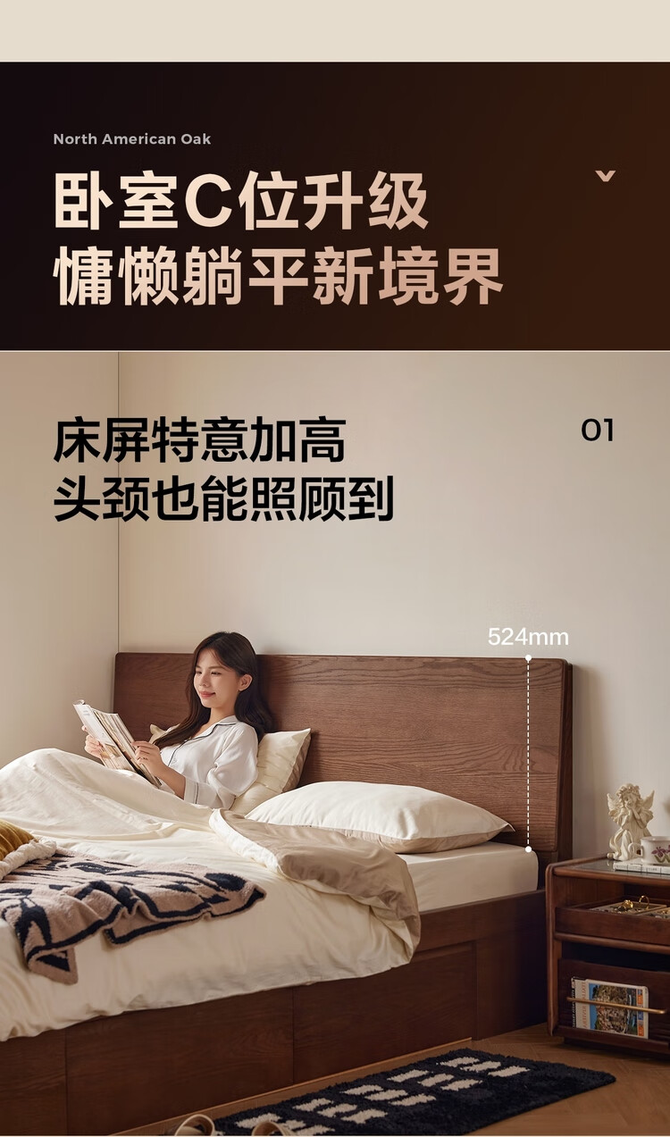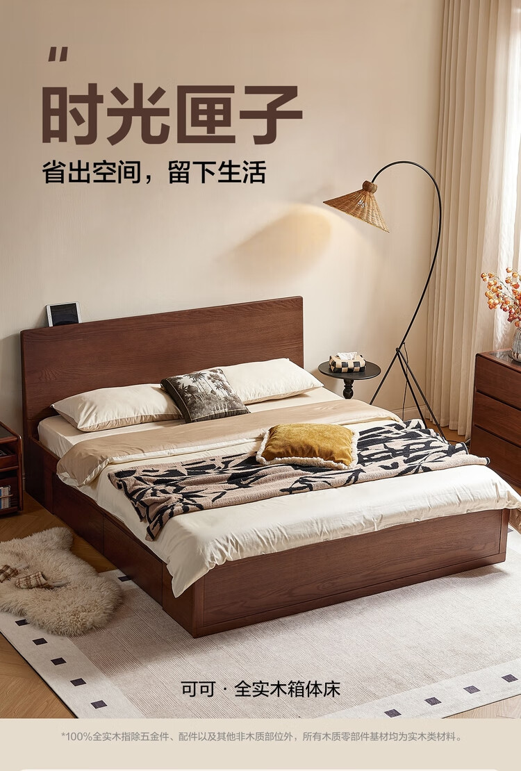 林氏家居复古全实木床1米8双人床橡木高箱储物箱体床木业可可系列LH586A4 【高铺款】储物实木床 1.5x2米