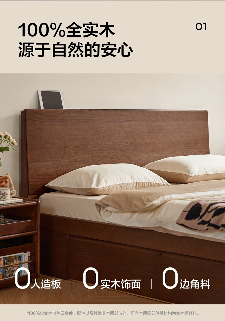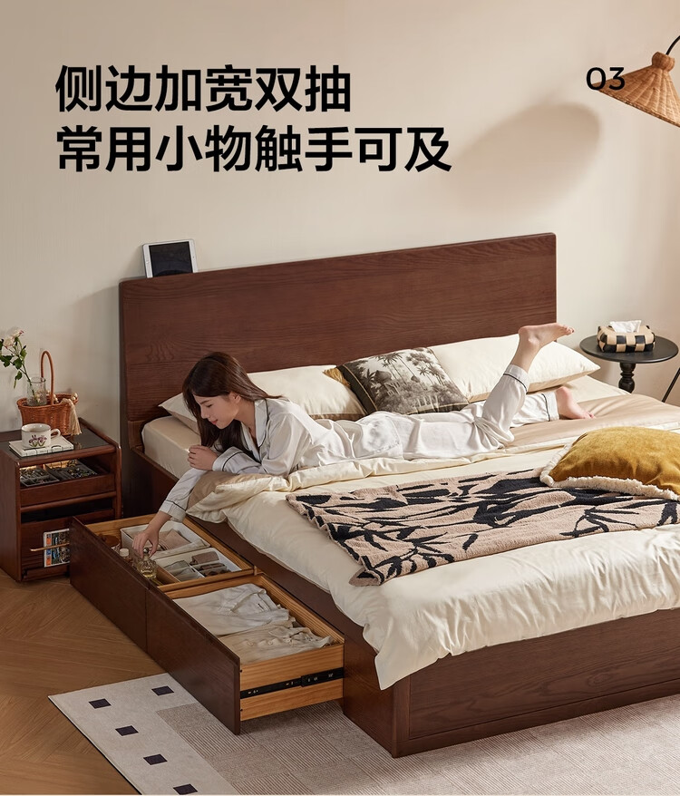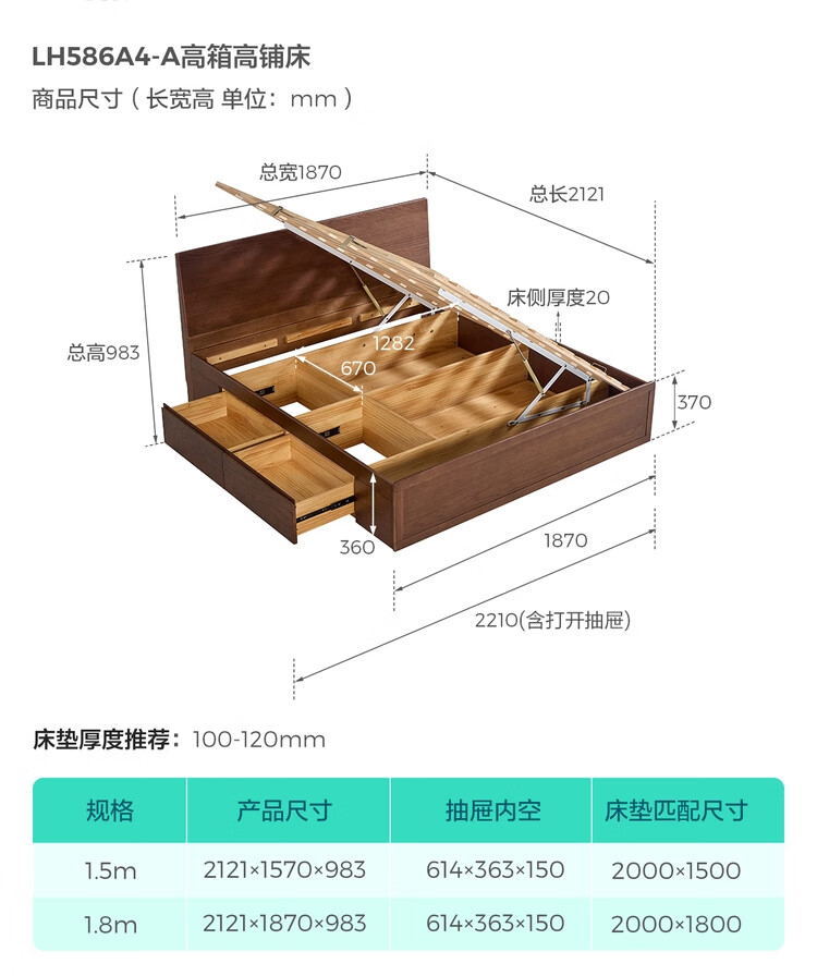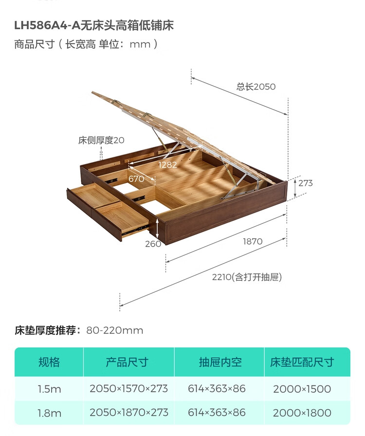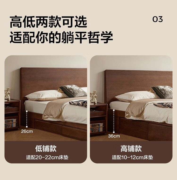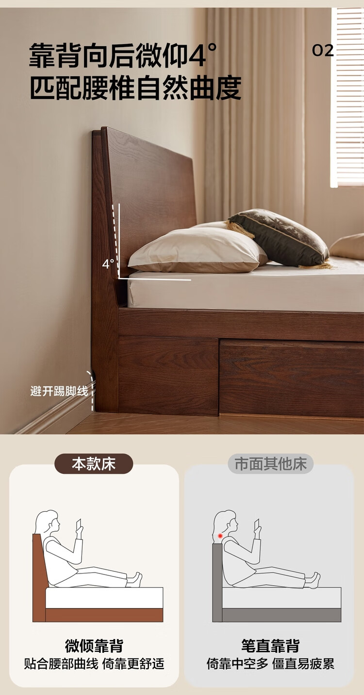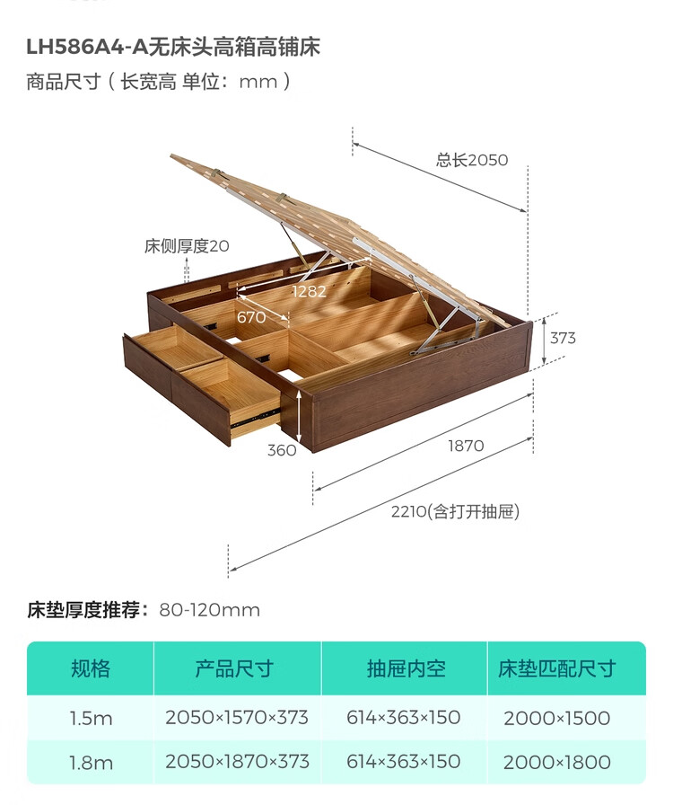 林氏家居复古全实木床1米8双人床橡木高箱储物箱体床木业可可系列LH586A4 【高铺款】储物实木床 1.5x2米