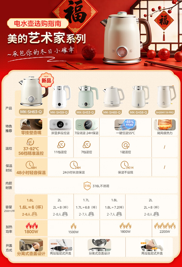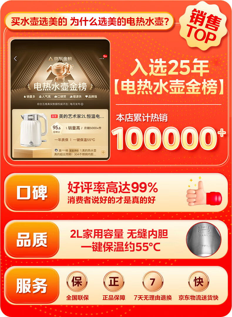美的(Midea)电热水壶恒温烧水壶自动断电保温一体2L大容量母婴级316L不锈钢无缝一体内胆 SH58-Q
