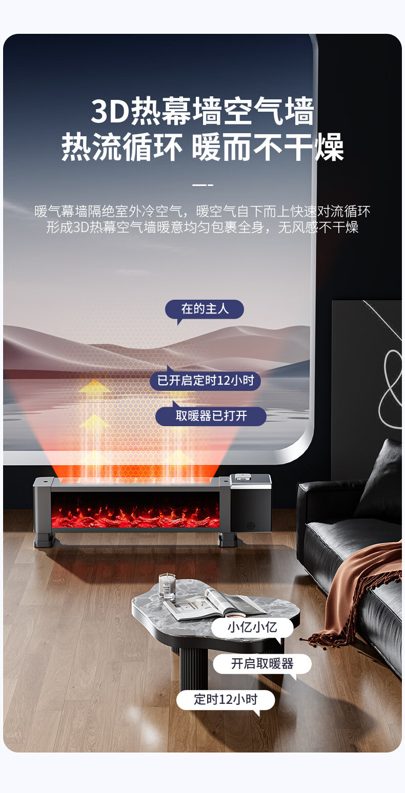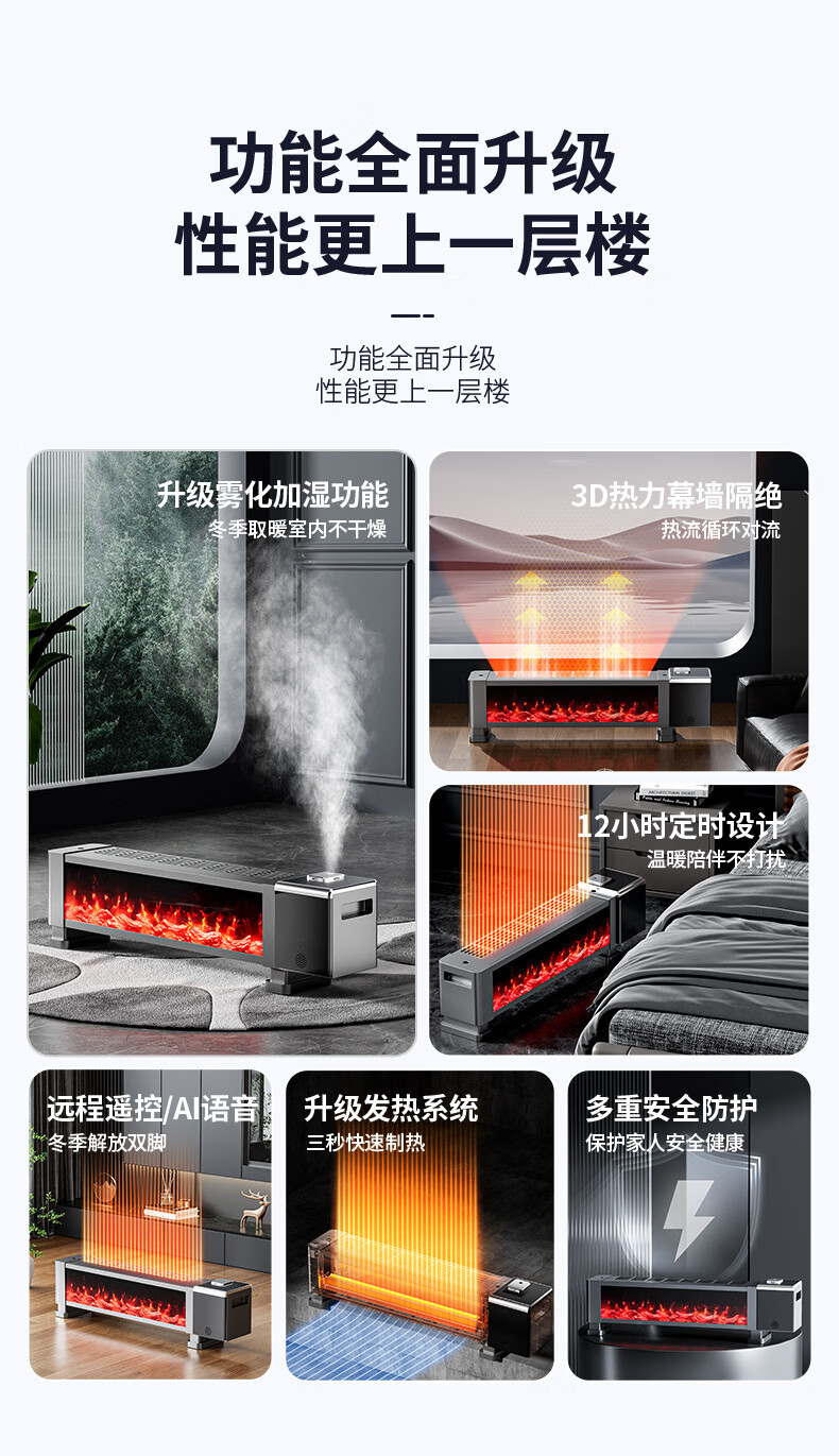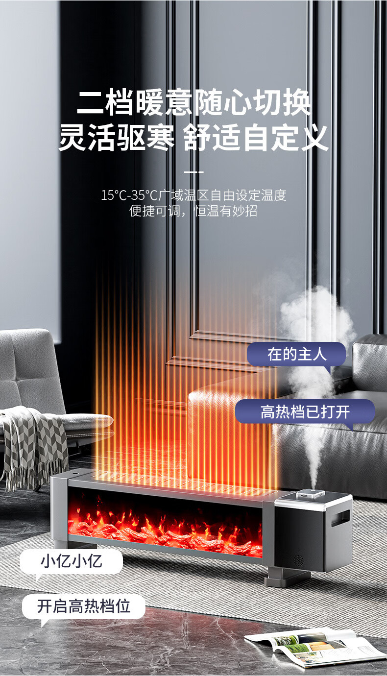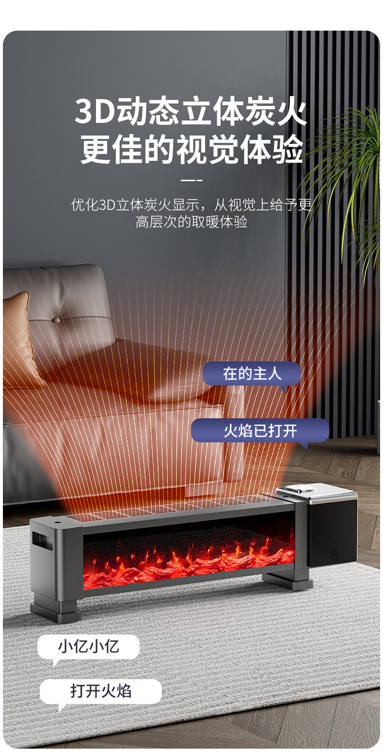 新款德国速热石墨烯踢脚线家用节能仿真火焰暖风机智能语音电暖气 语音取暖器+加湿器 重磅升级