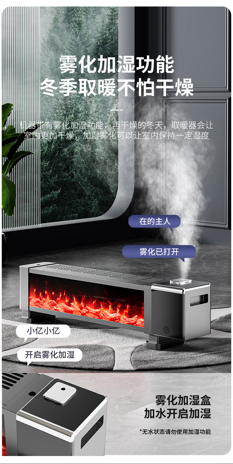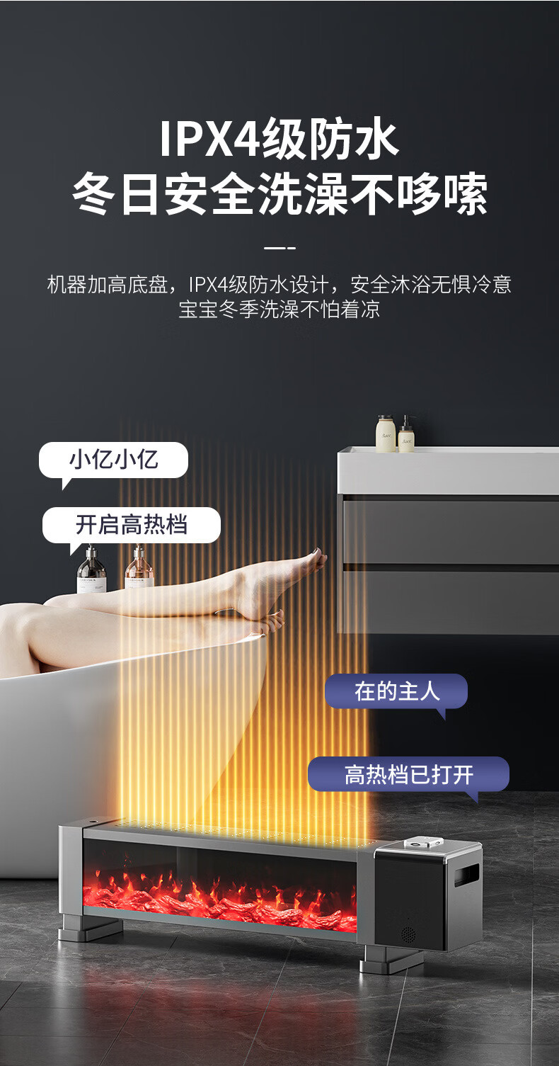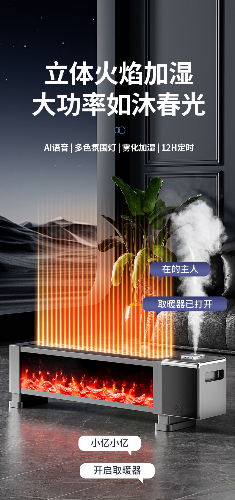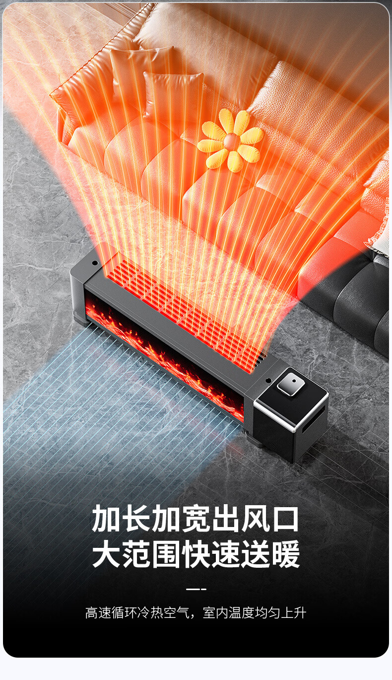 新款德国速热石墨烯踢脚线家用节能仿真火焰暖风机智能语音电暖气 语音取暖器+加湿器 重磅升级