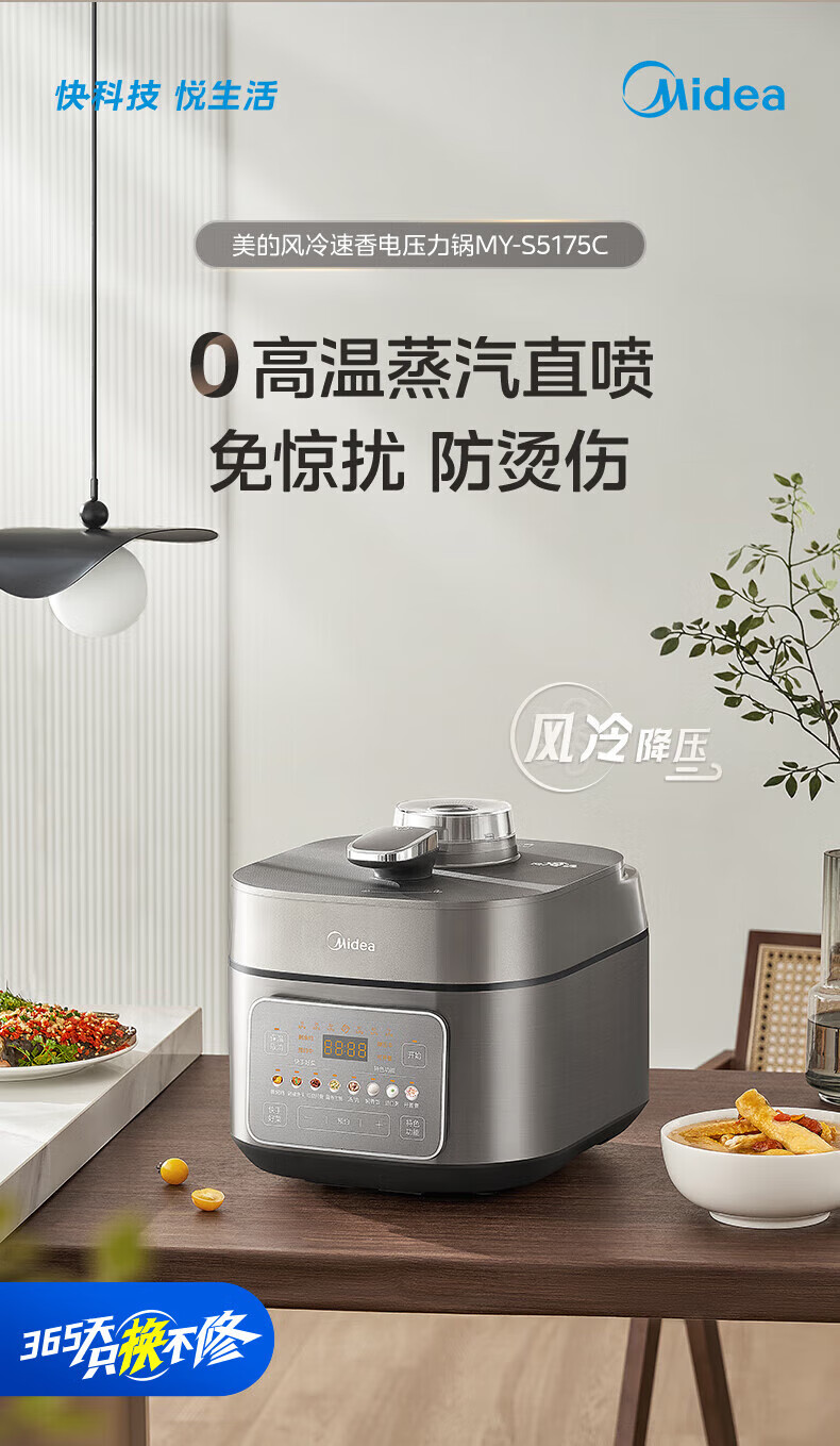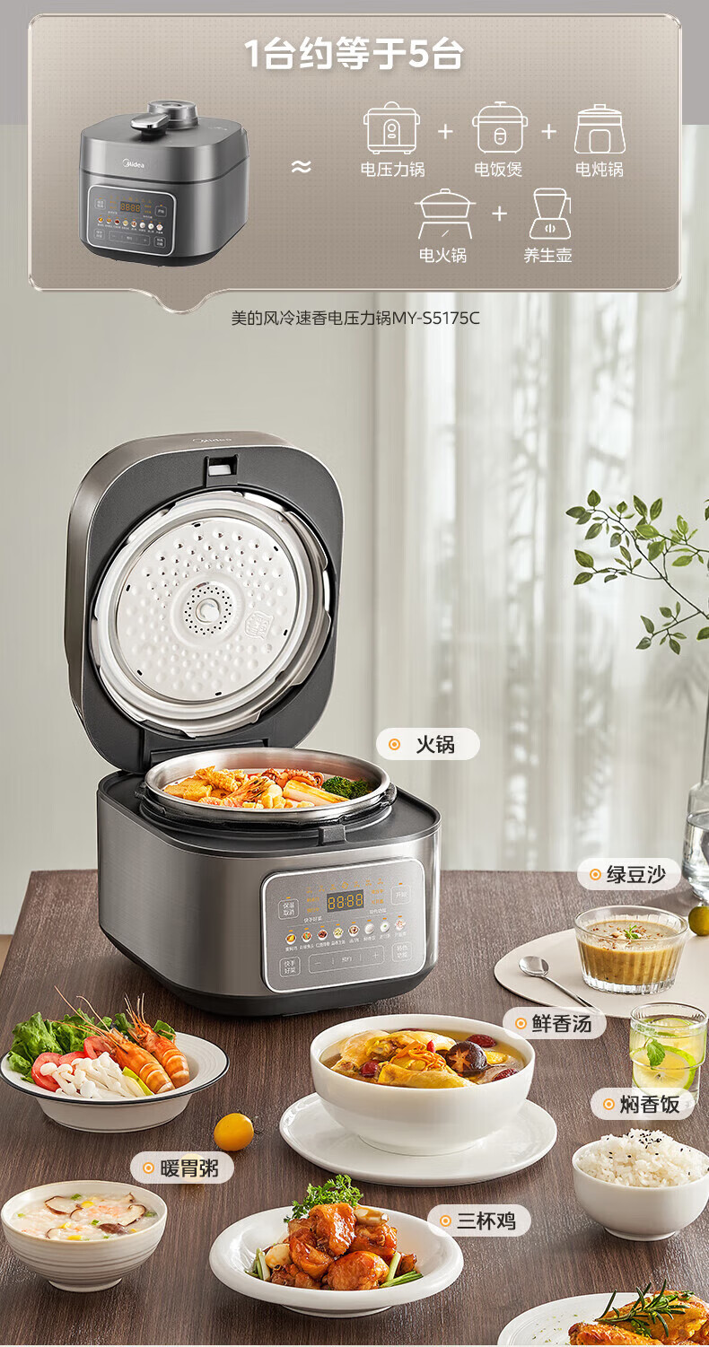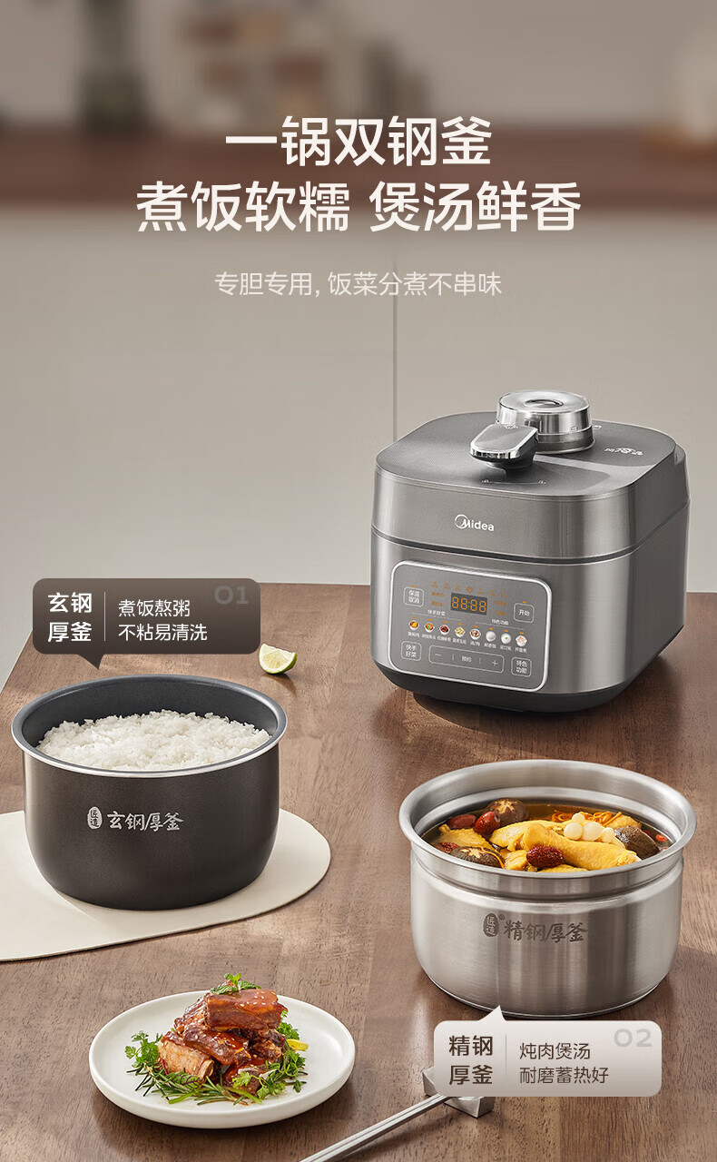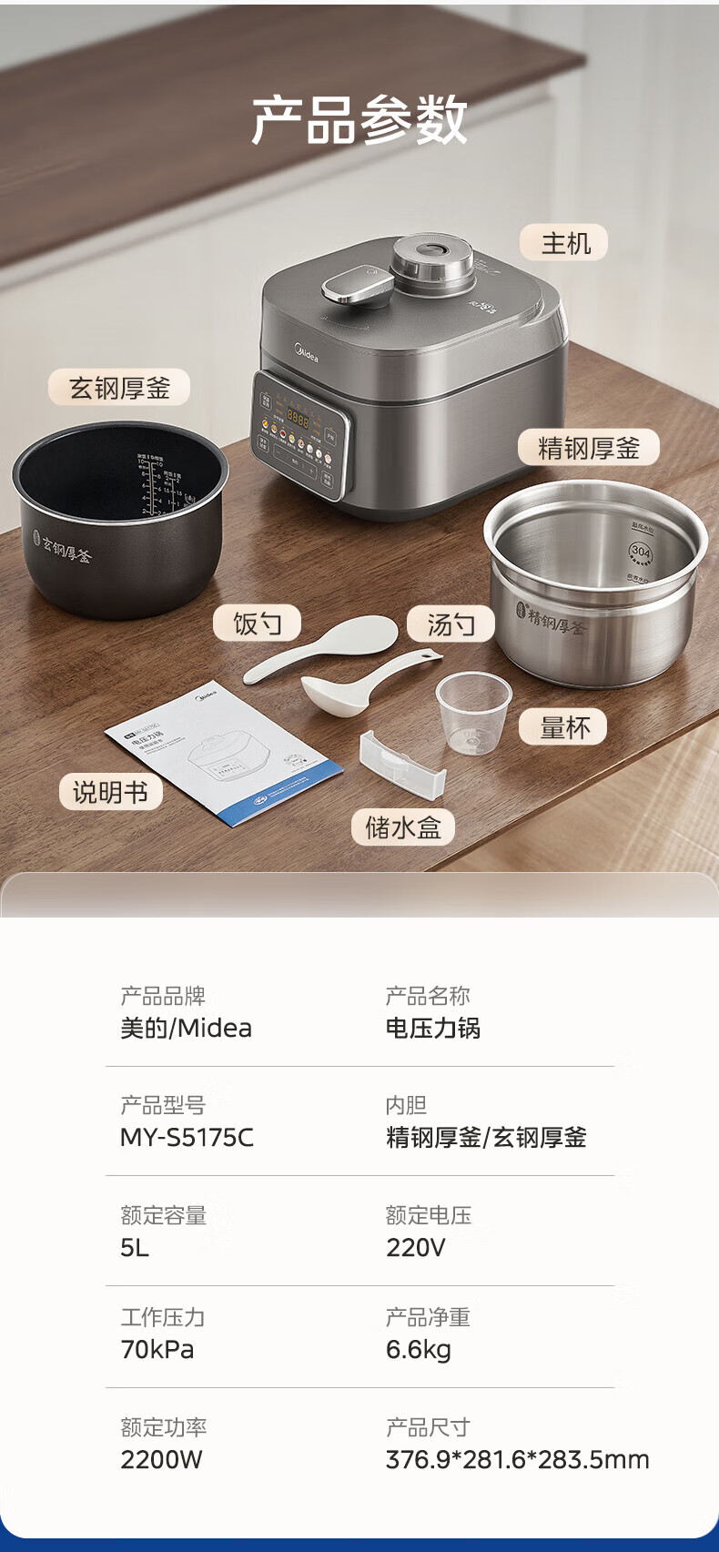 美的(Midea)IH电压力锅2200W风冷5L双胆家用智能预约无感降压0涂层高压锅4-6人电饭煲 MY-S5175C IH电压力锅 MY-S5175C 5L