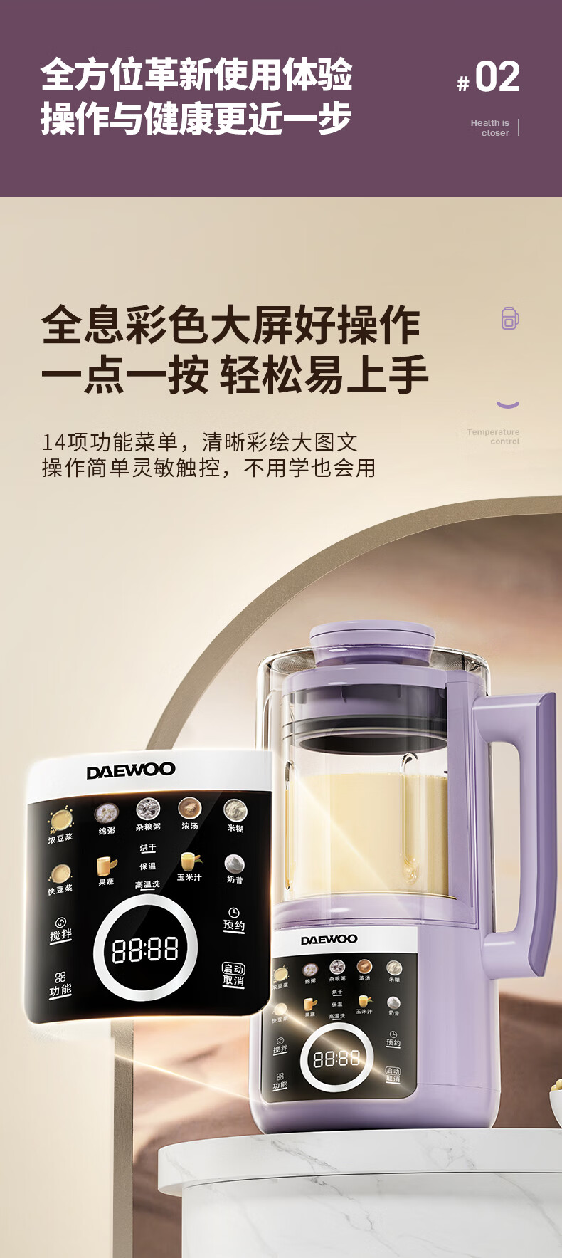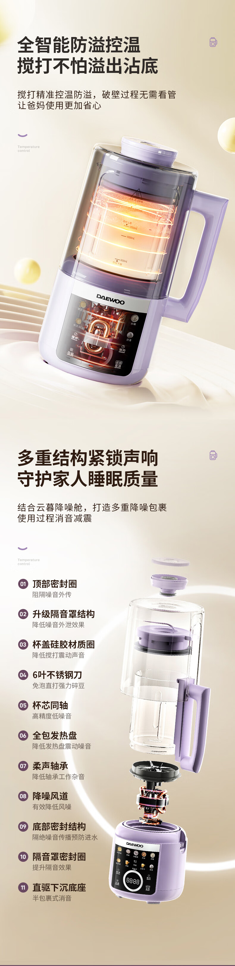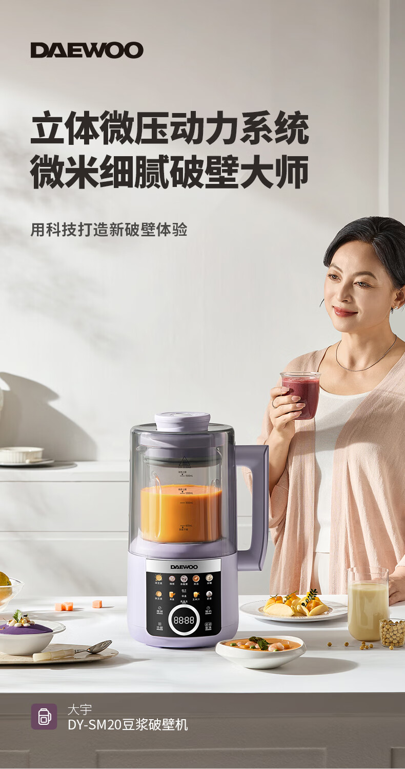 大宇(DAEWOO)破壁机隔音罩轻音降噪家用豆浆机料理机全自动免煮免滤五谷杂粮大容量早餐机SM20【2025新款】 25年新款玻璃大屏1.5L(紫色)
