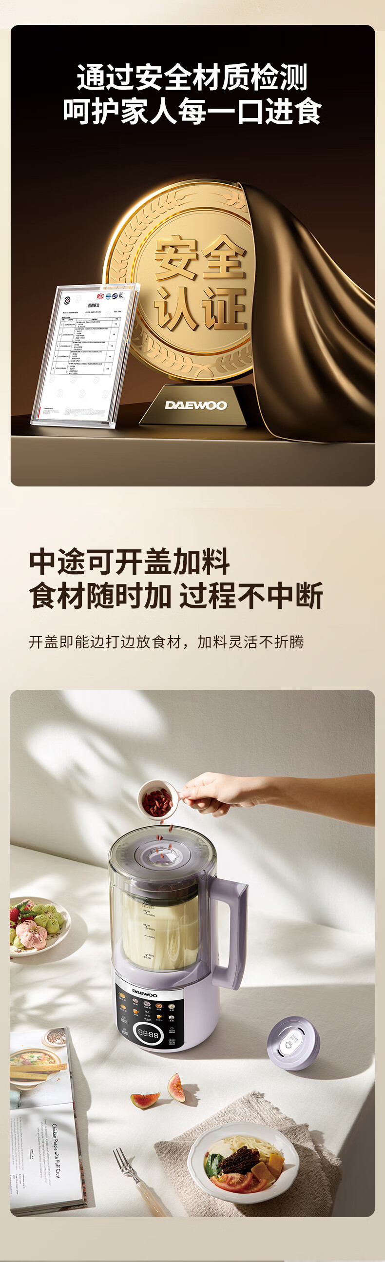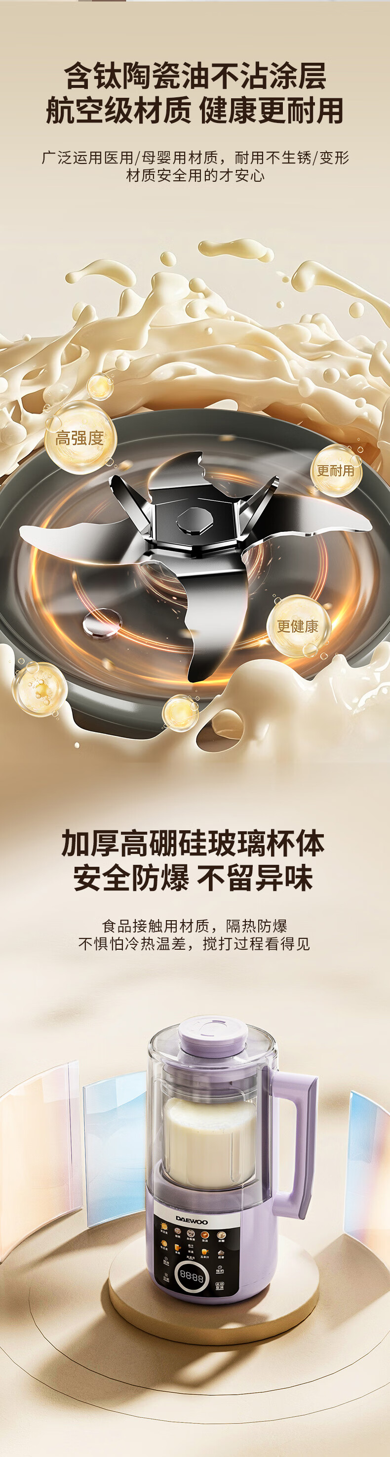 大宇(DAEWOO)破壁机家用免煮全自动1.5L豆浆机5-6人无刷变频轻音防糊底辅食料理机2025新品云境DY-SM18 米色