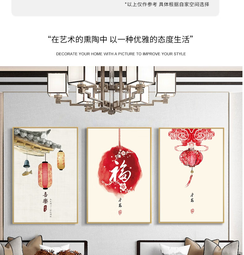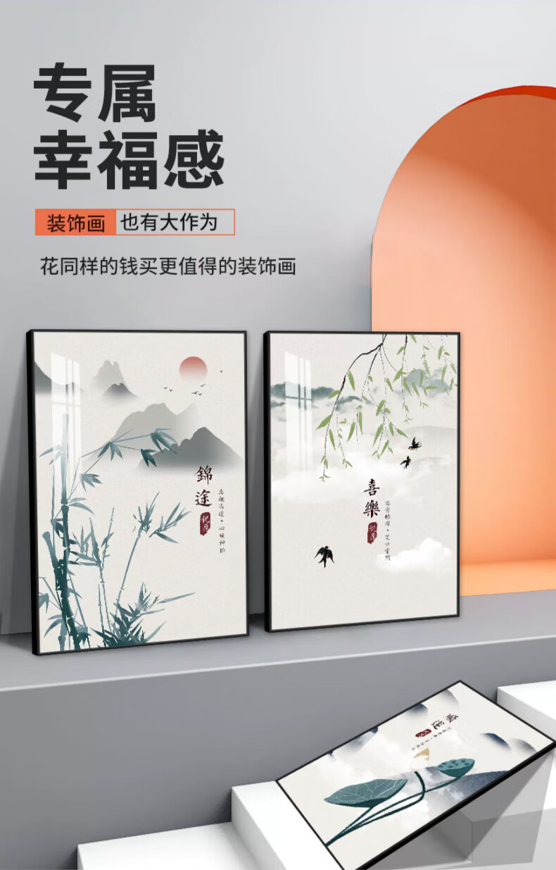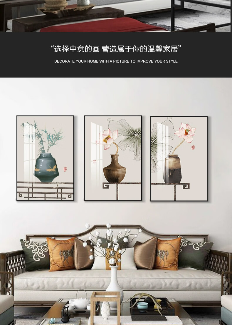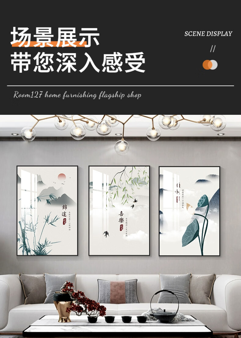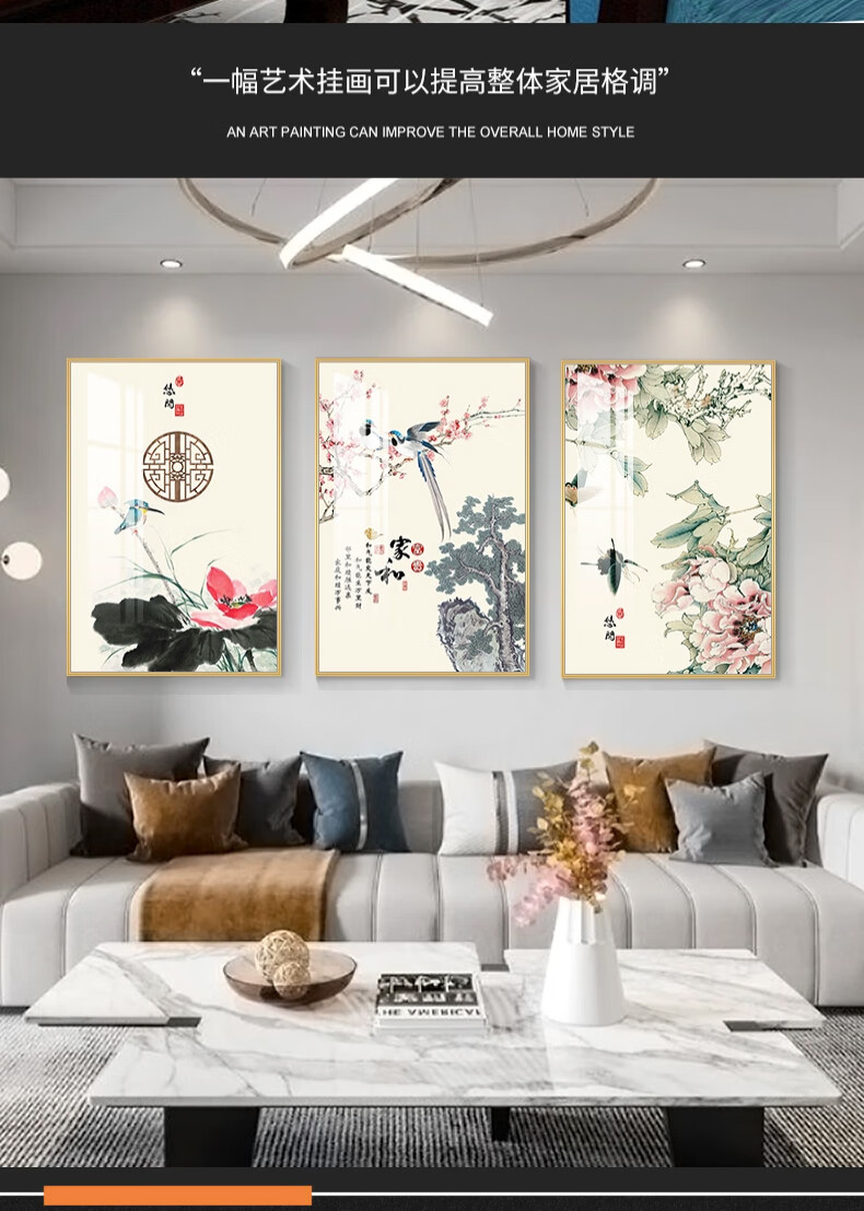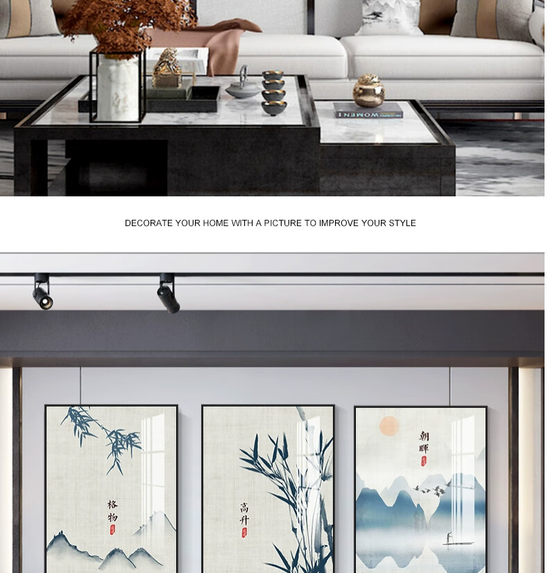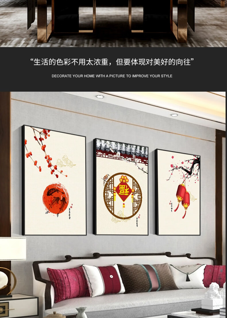柳莺花燕新中式客厅装饰画寓意好挂画高档山水三联画茶室壁画沙发背景墙画 RY-石来运转 60X80(荐3米左右沙发)黑框