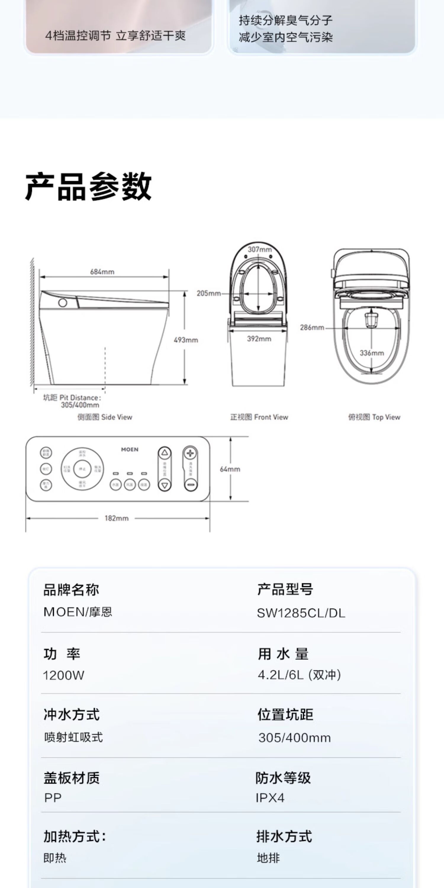 摩恩(MOEN)云朵智能马桶泡沫盾低水压家用电动一体坐便器1285 云朵Pro 进阶升级((升级脚感智控)) 305/300mm