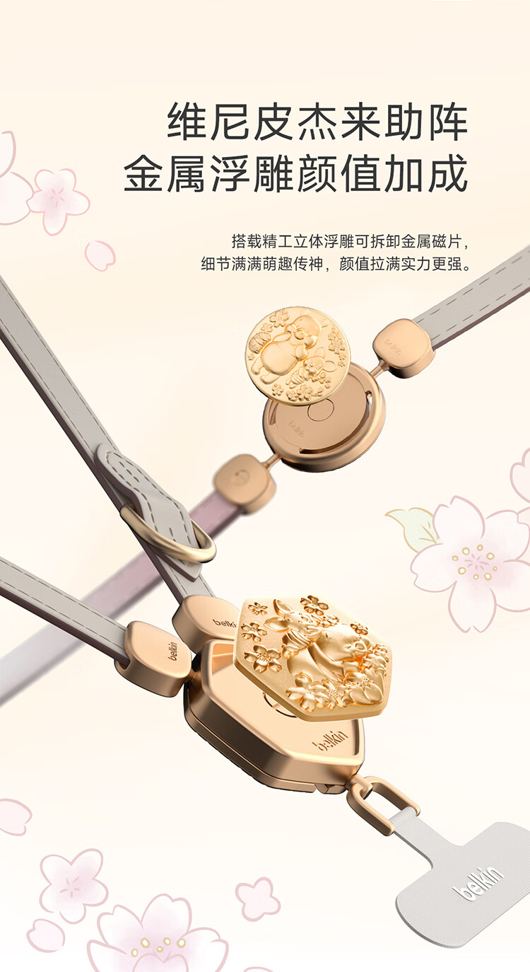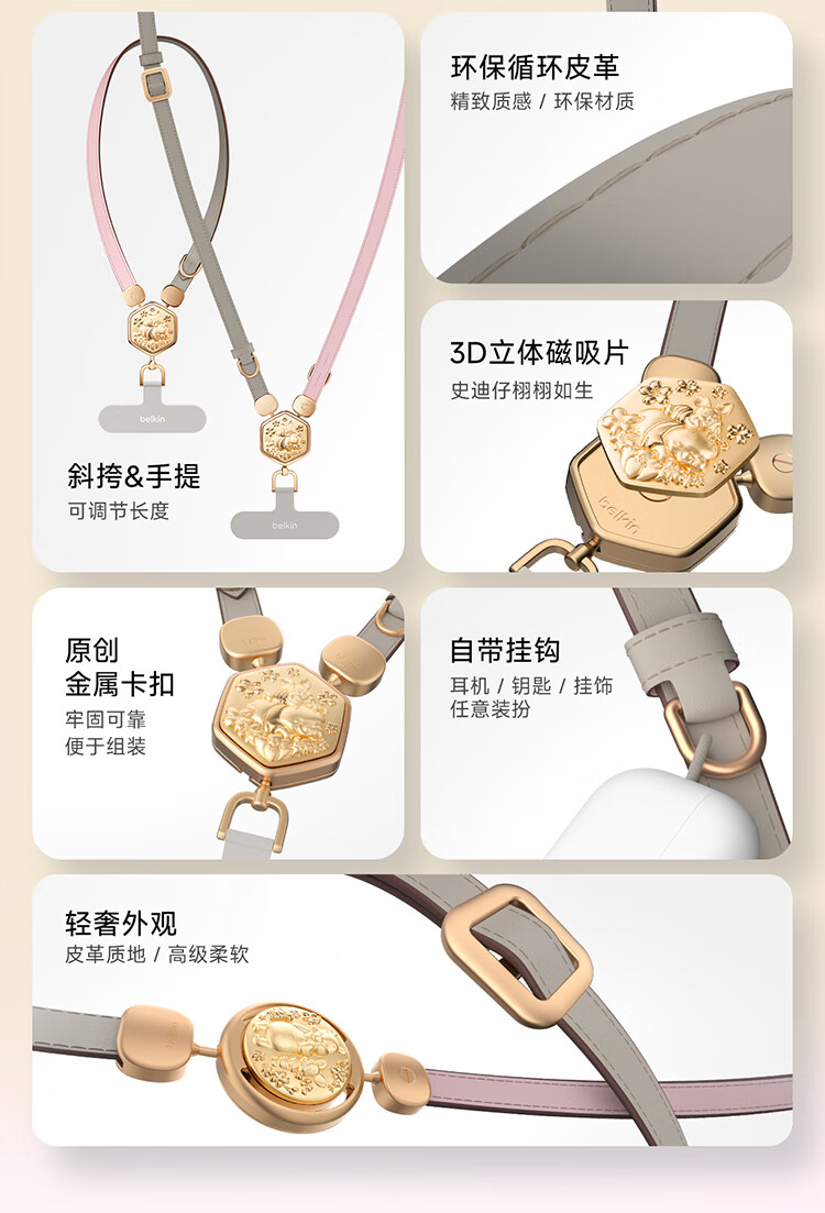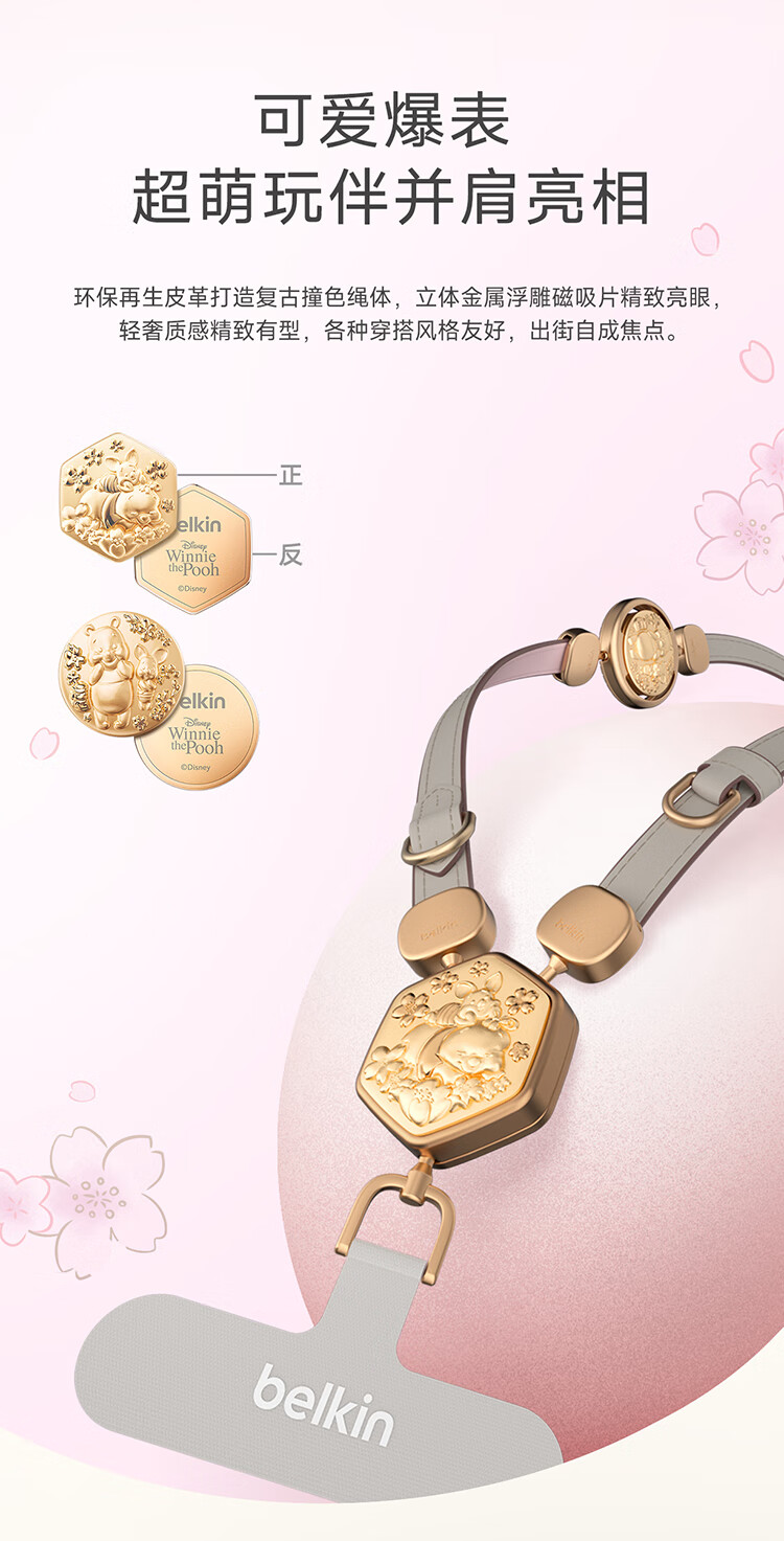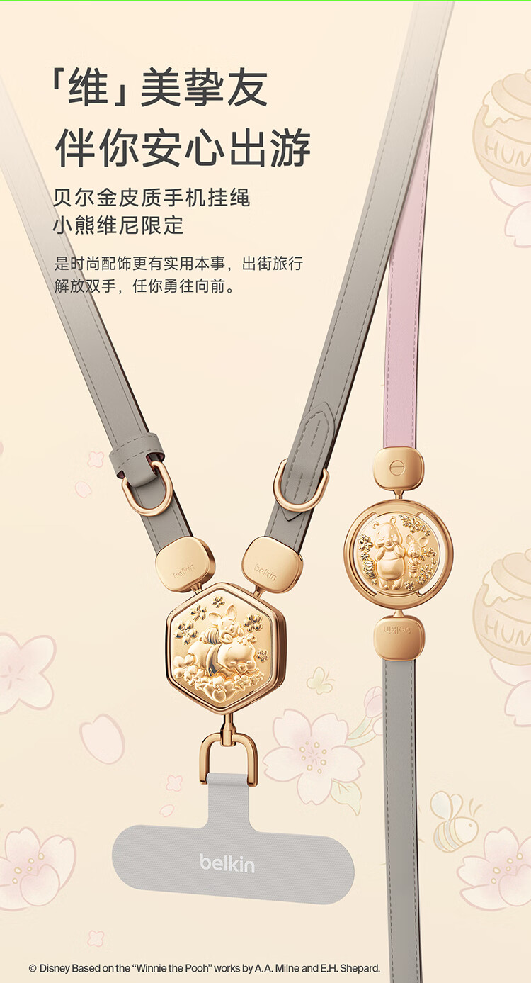 贝尔金(BELKIN)手机挂绳手腕 手机链手机绳高级感挂脖斜跨手机防丢绳带手机垫片 皮革二合一 小熊维尼