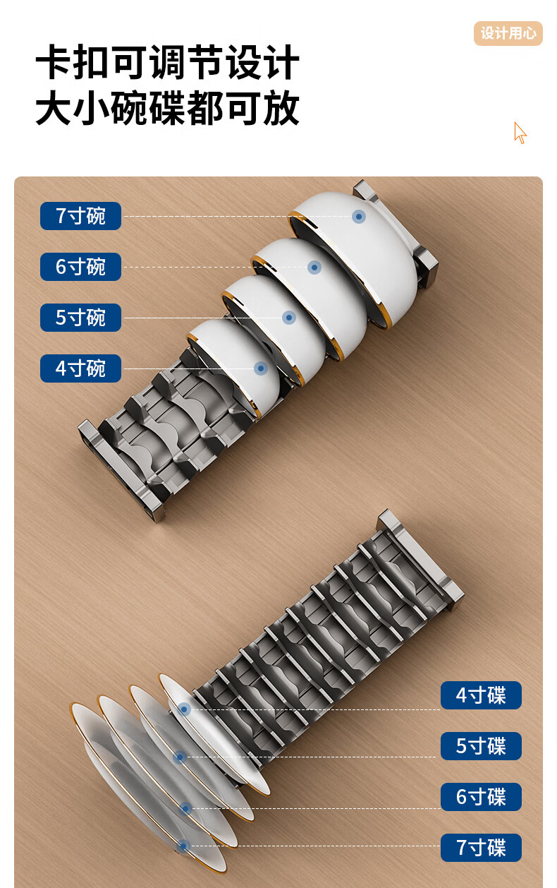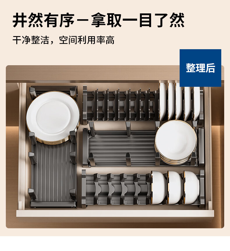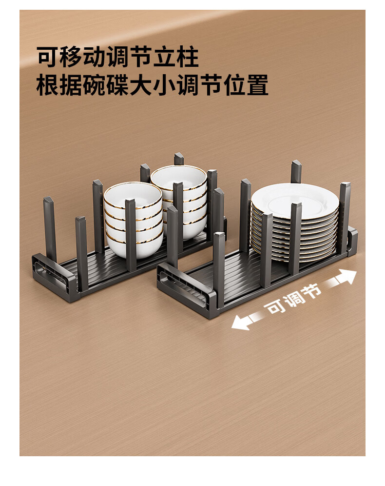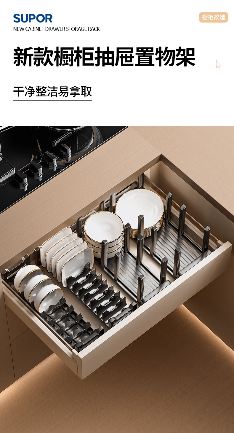 苏泊尔厨房碗碟置物架抽屉收纳盒分隔内置橱柜沥水碗架碗筷盘子拉篮配件 枪灰堆碟架41CM