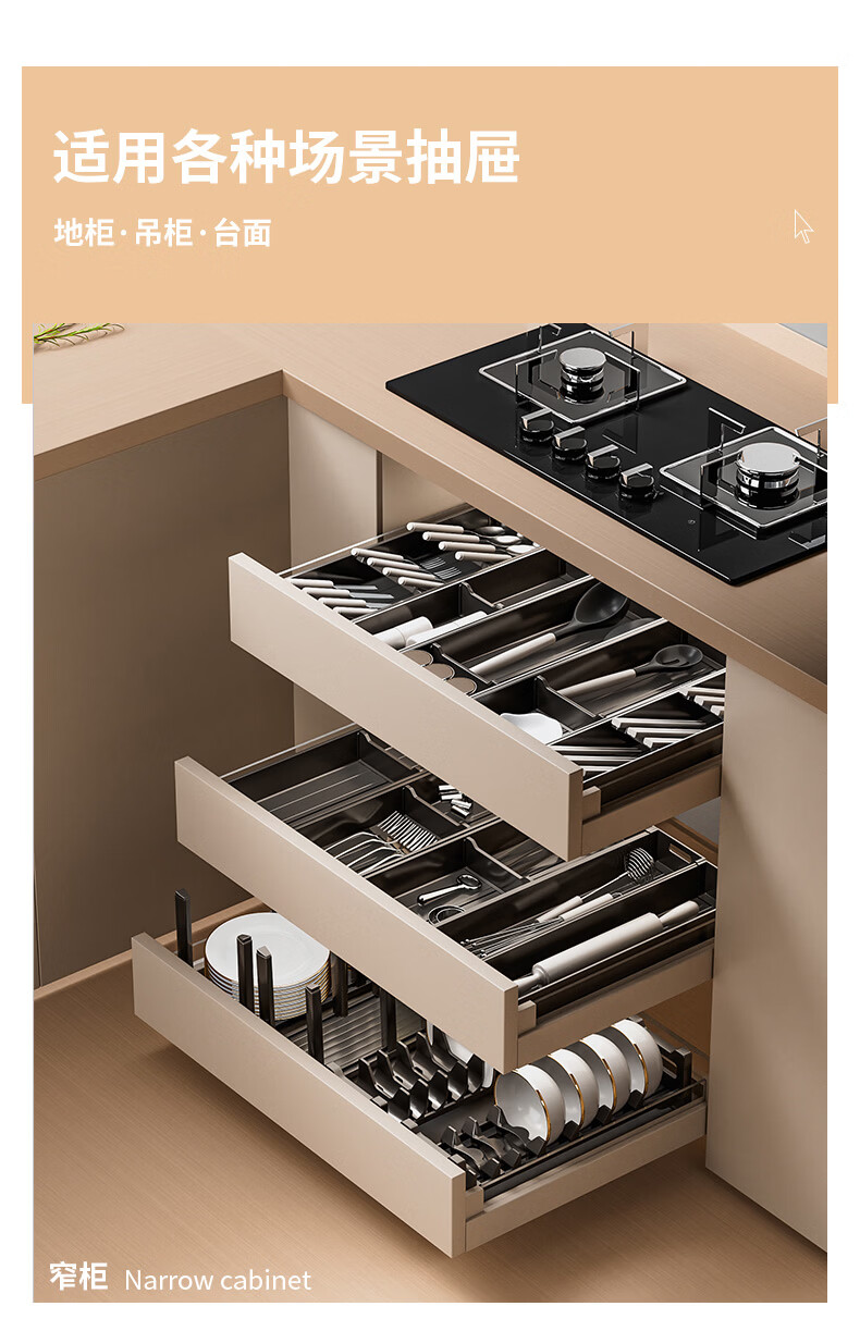 苏泊尔厨房碗碟置物架抽屉收纳盒分隔内置橱柜沥水碗架碗筷盘子拉篮配件 枪灰餐具盒15*46CM