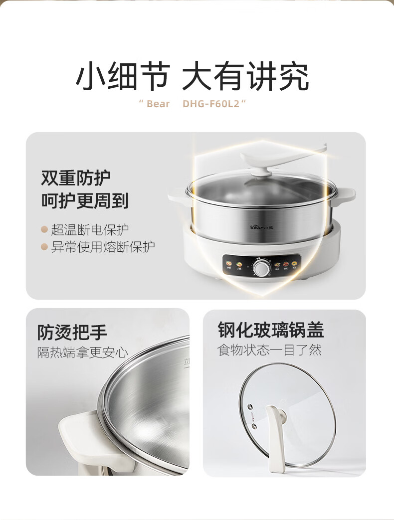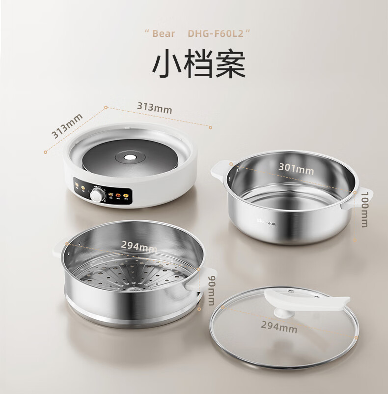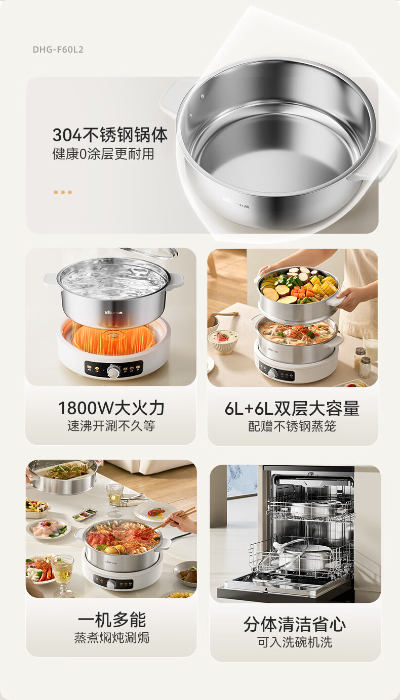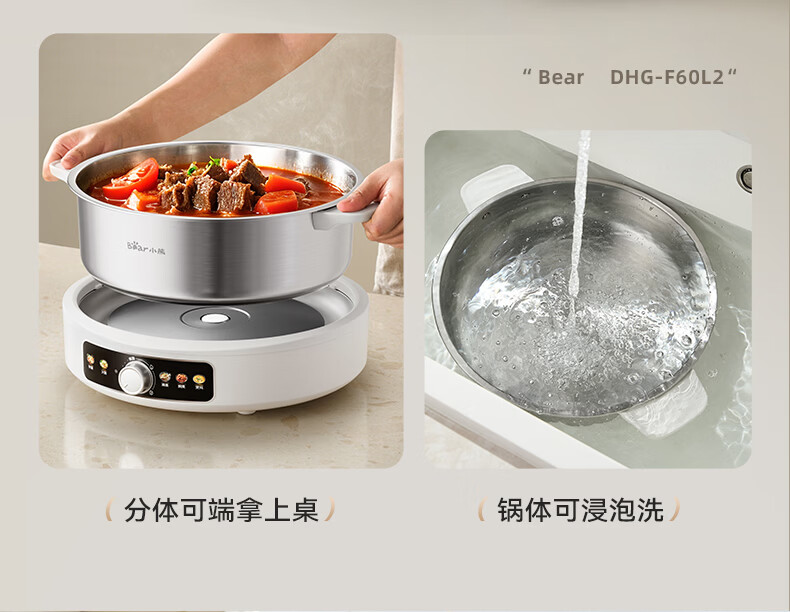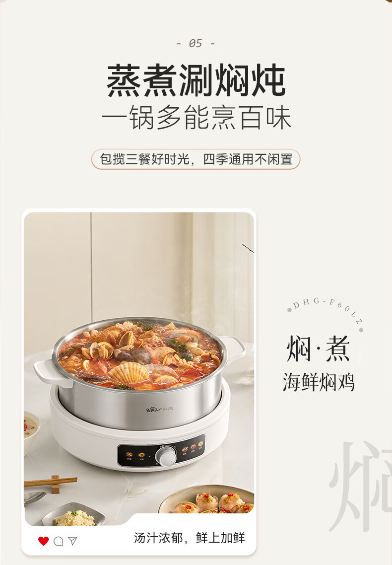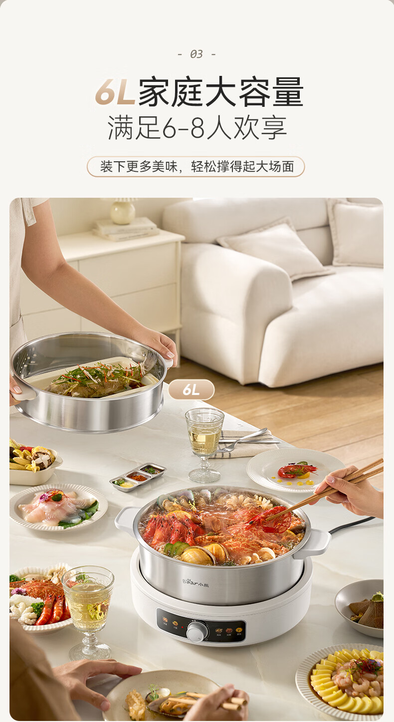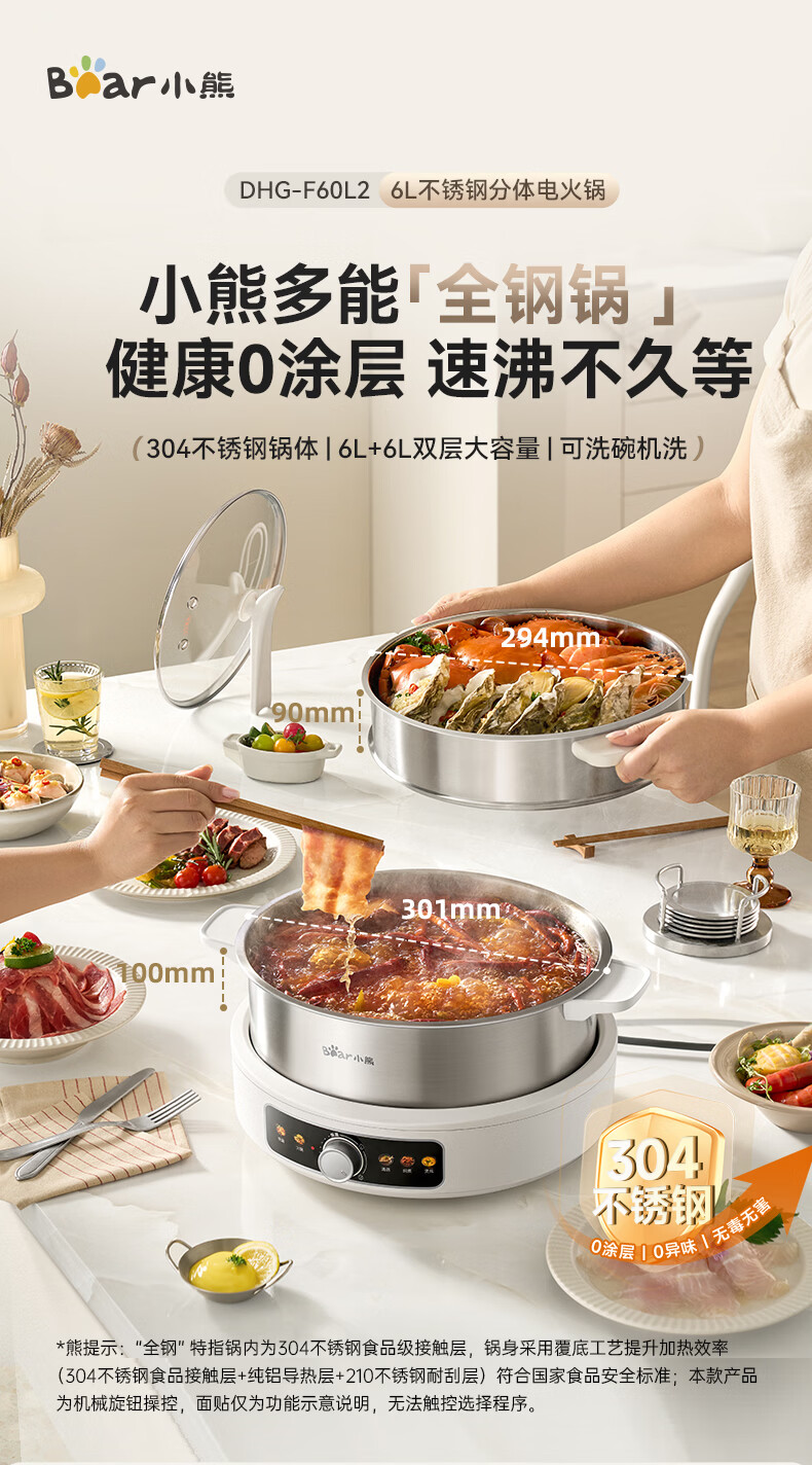 小熊(Bear)0涂层电火锅火锅专用锅电锅家用5-8个人不粘分体式可拆洗多功能蒸煮一体不锈钢电煮锅6L火锅锅60L2