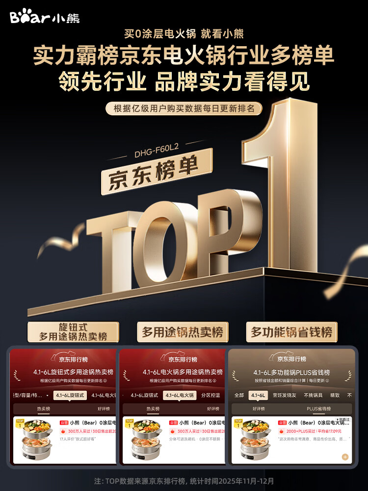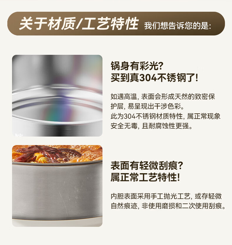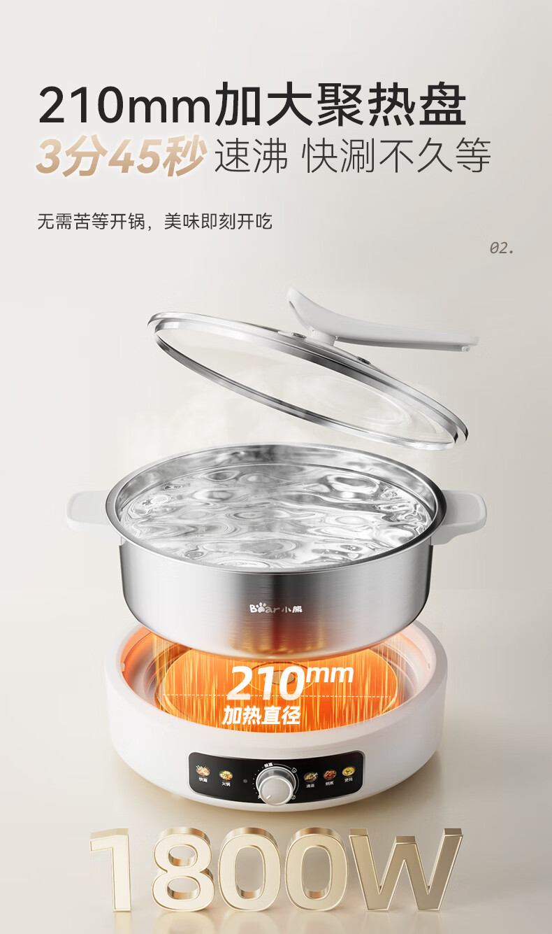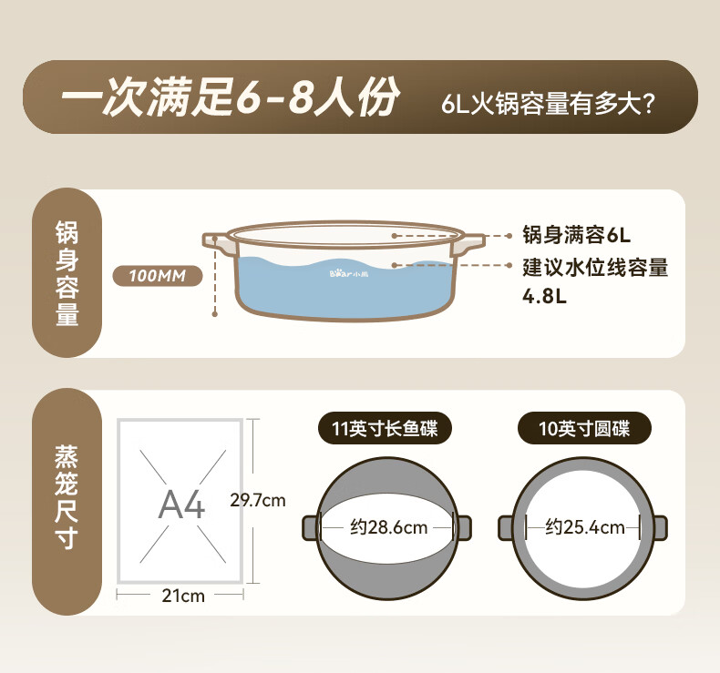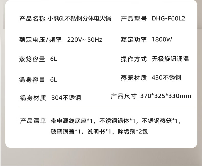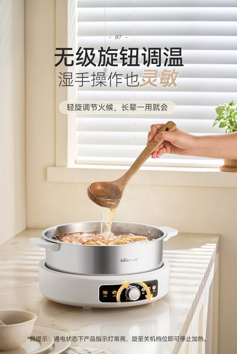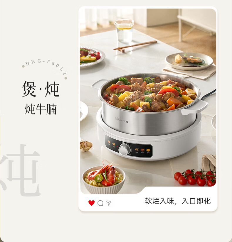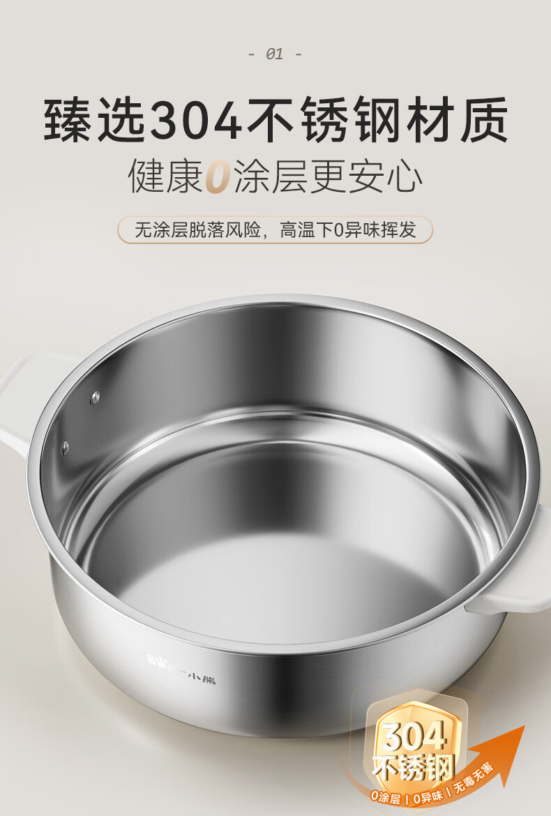小熊(Bear)0涂层电火锅火锅专用锅电锅家用5-8个人不粘分体式可拆洗多功能蒸煮一体不锈钢电煮锅6L火锅锅60L2
