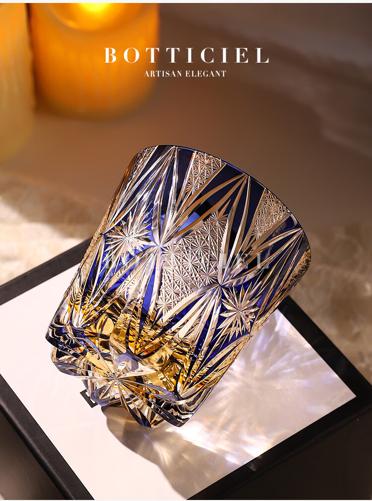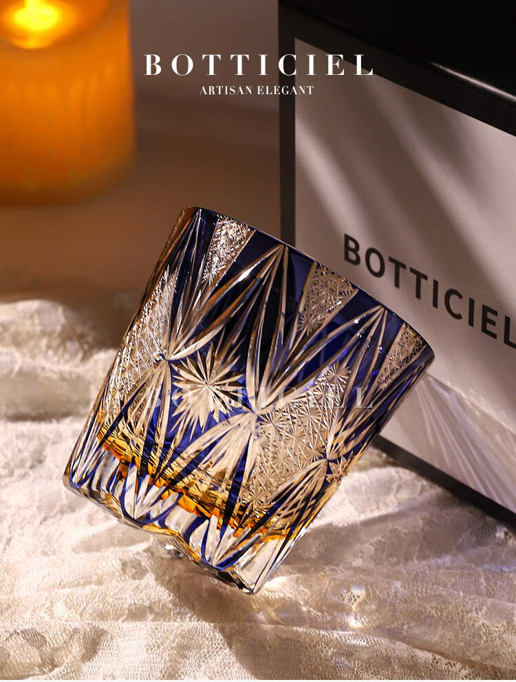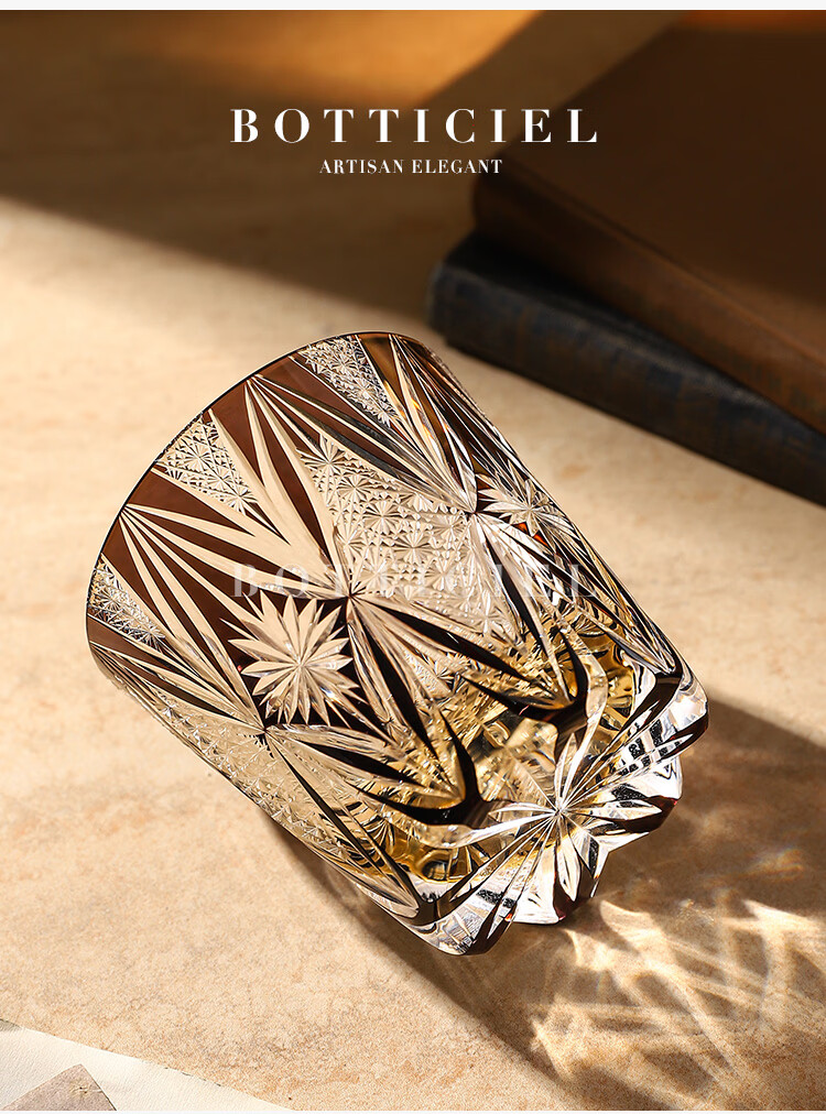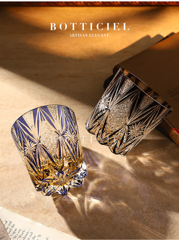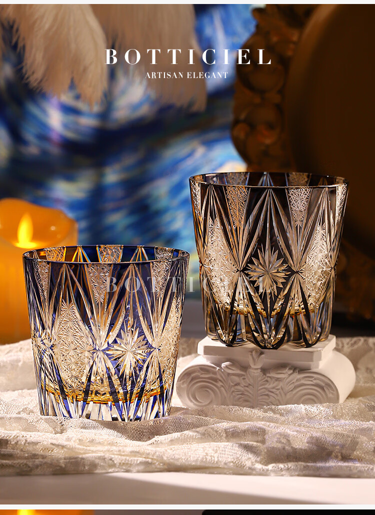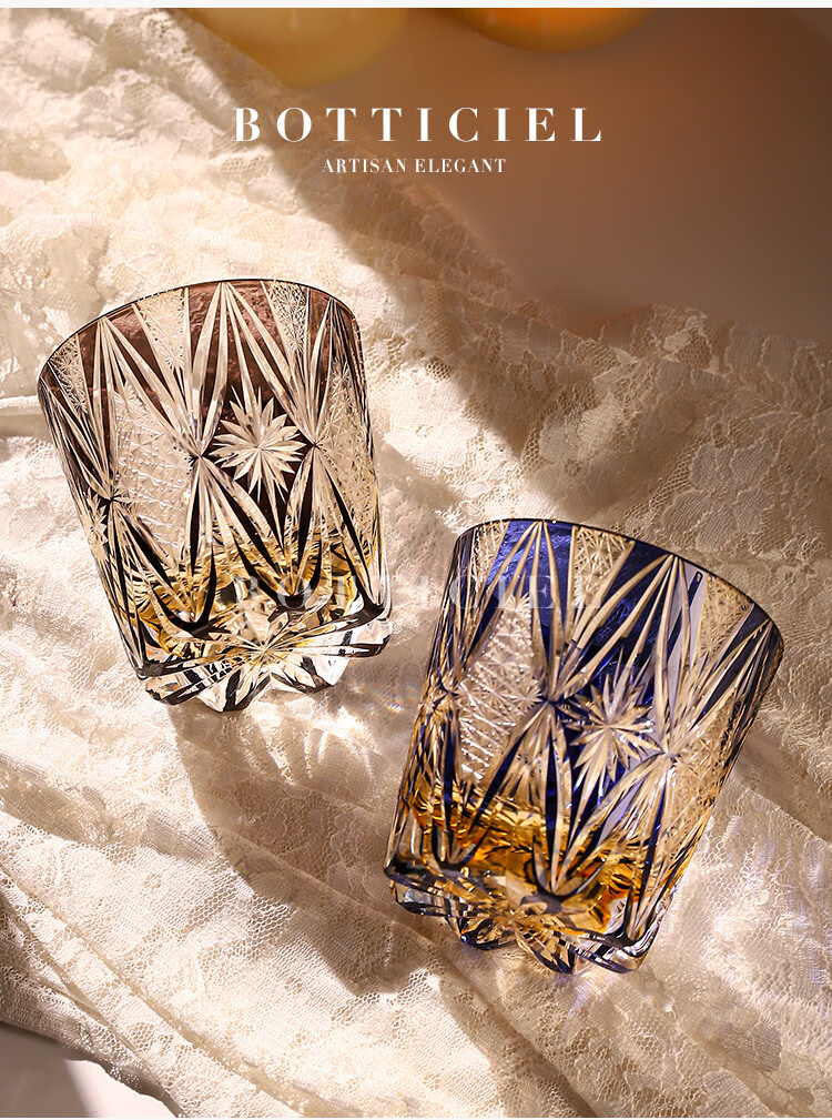 BOTTICIEL万华绮罗江户切子手工雕刻威士忌杯水晶玻璃洋酒杯生日婚礼礼物 万华绮罗-琥珀黑【双只礼盒装】 320ml 2只