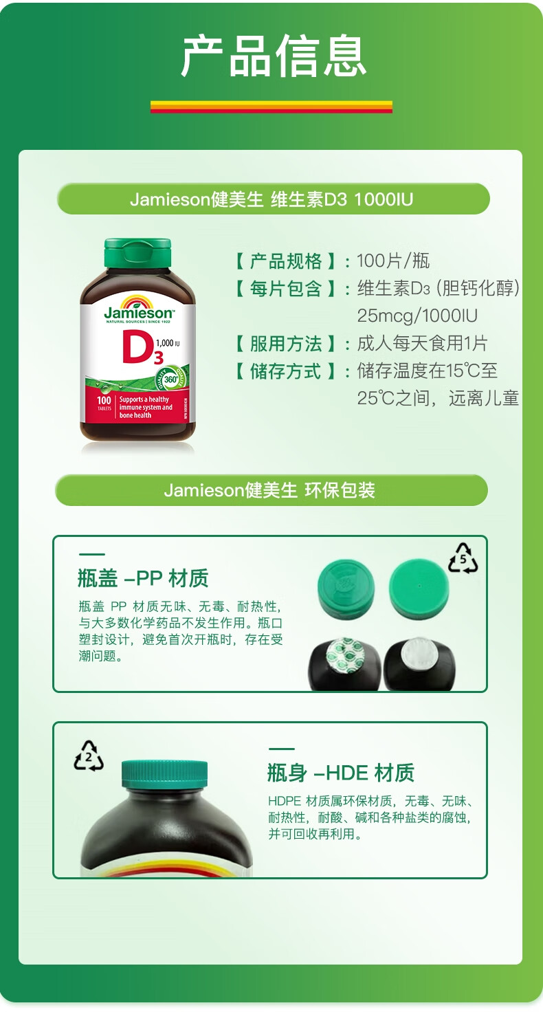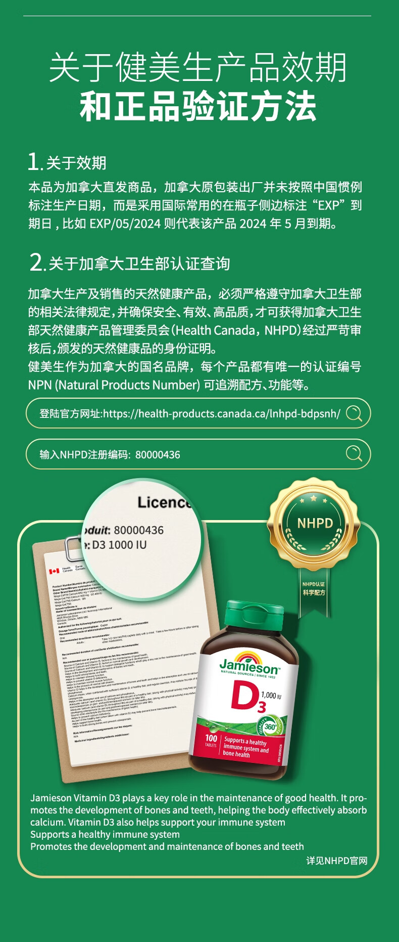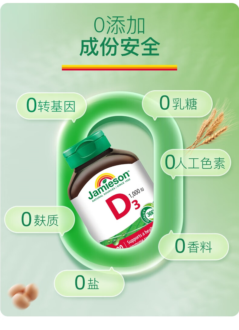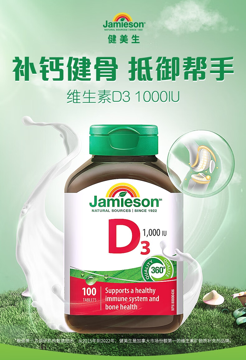 健美生(Jamieson)维生素D3 1000IU*100片/瓶 促进钙吸收阳光瓶d3成年上班日常补充