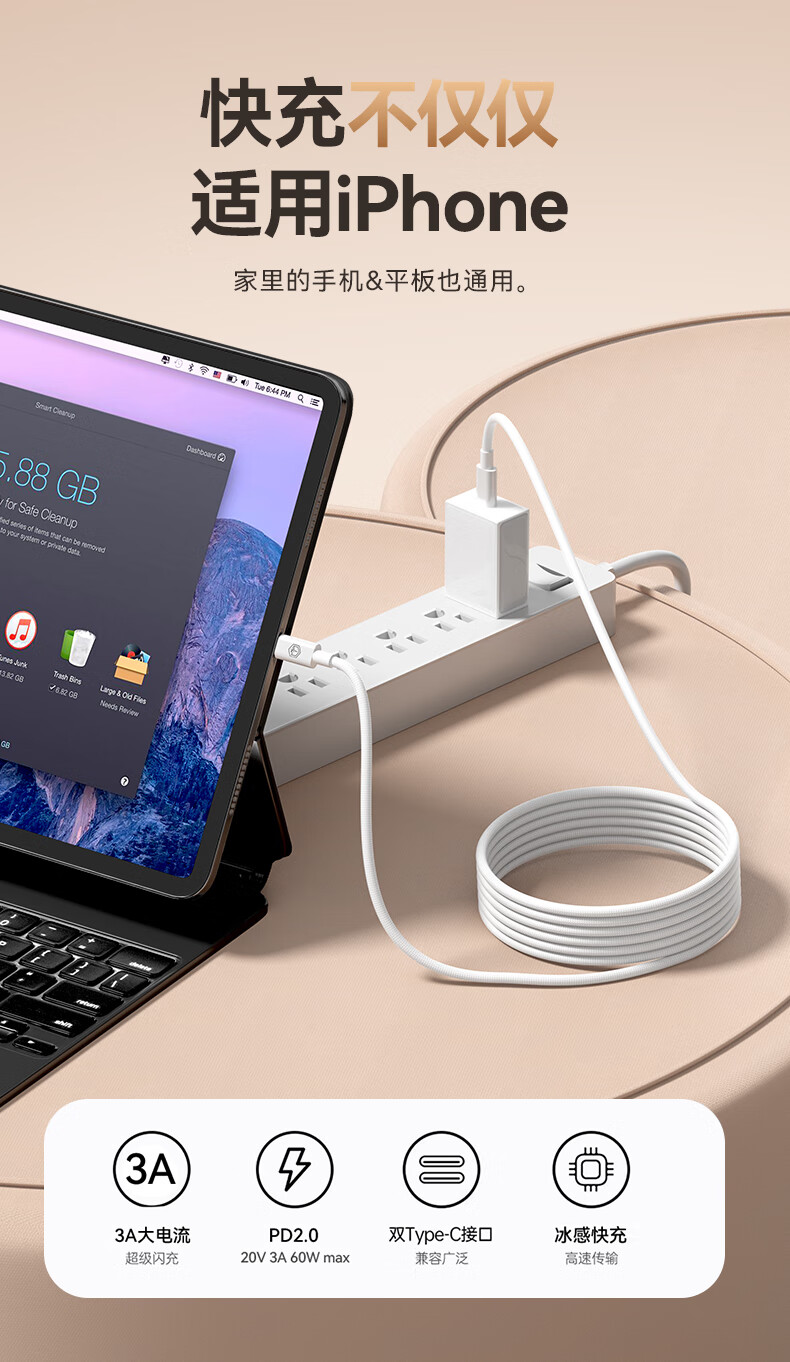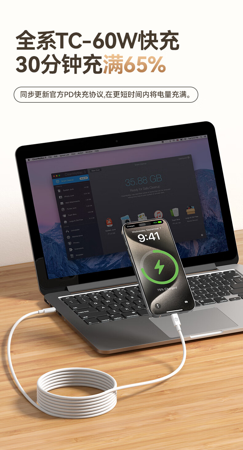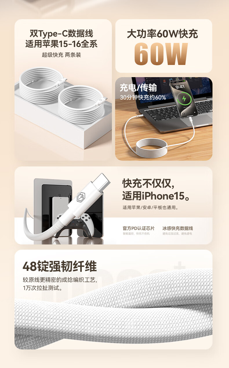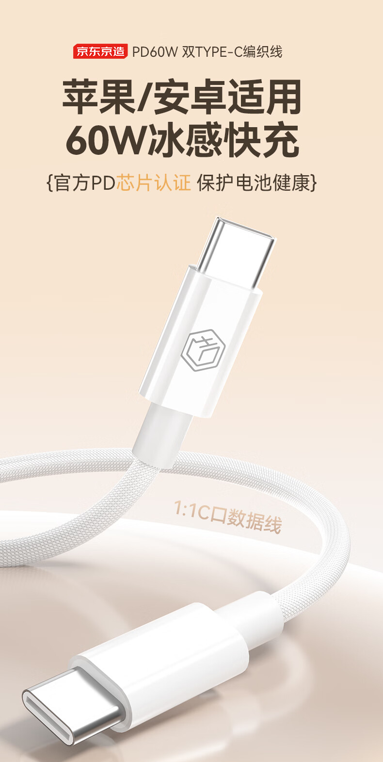 京东京造【两条装】PD60W快充线苹果17/16充电线Type-C数据线双头车载适用iPhone安卓手机平板笔记本 1.5米