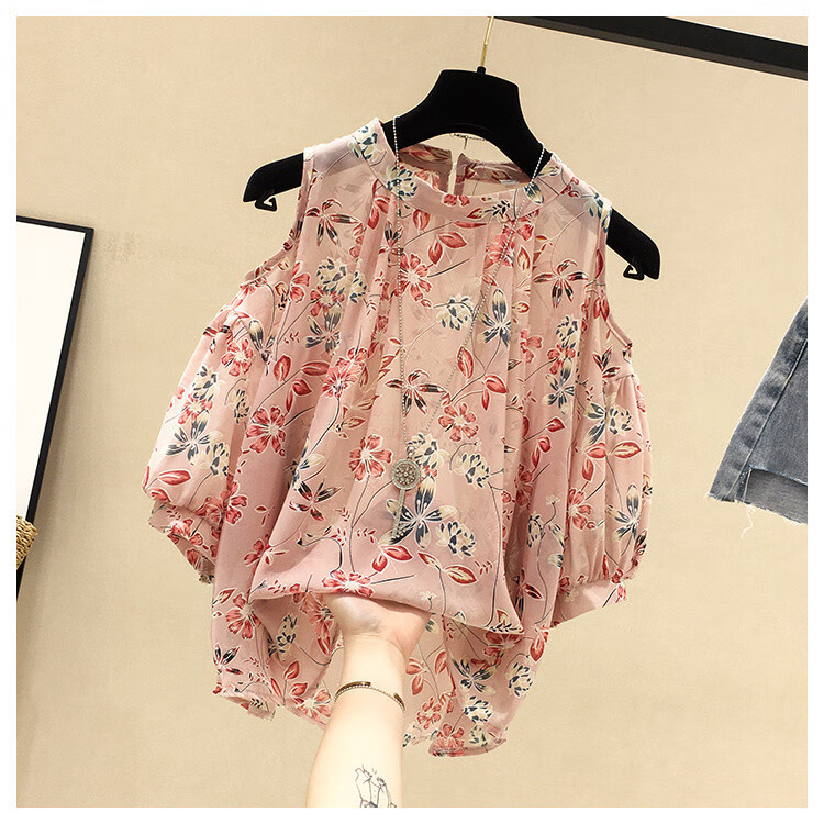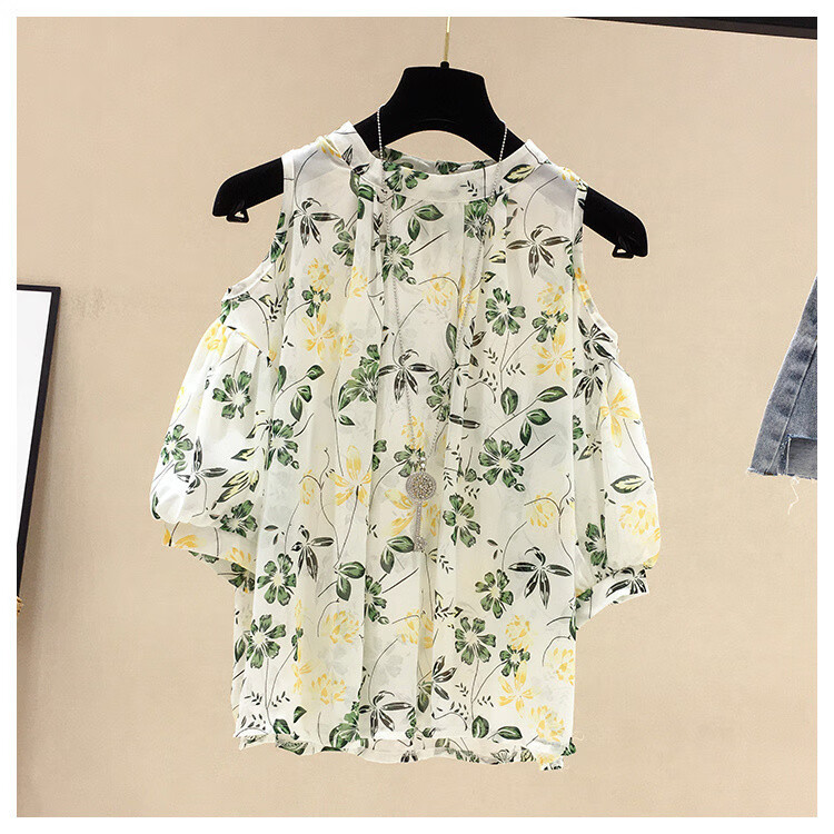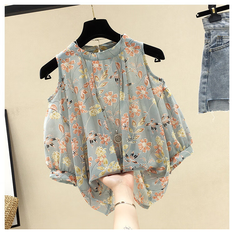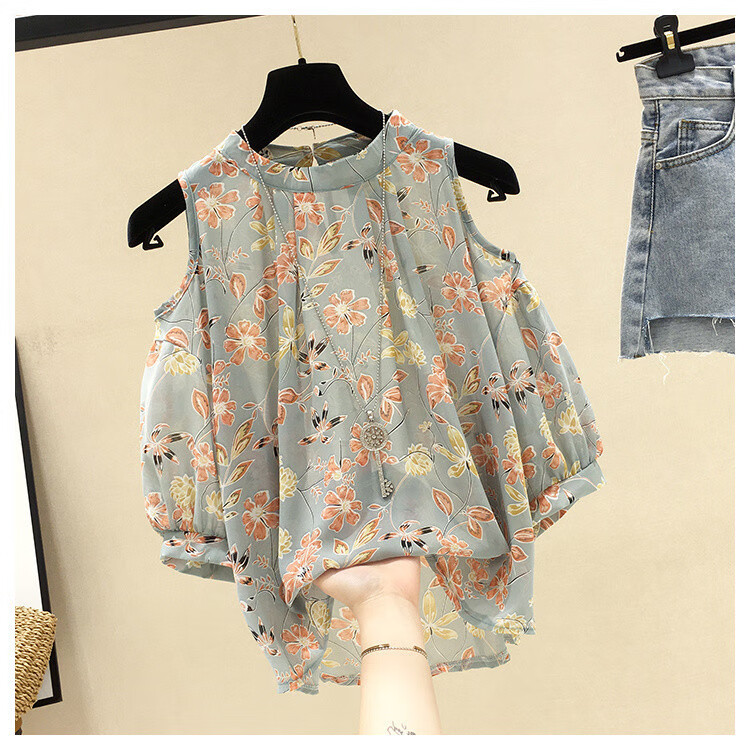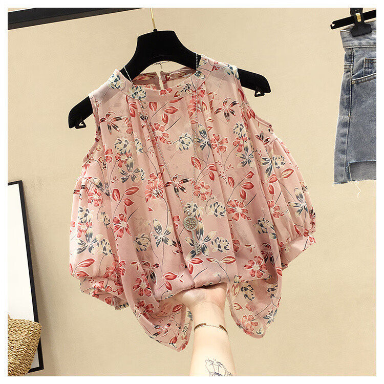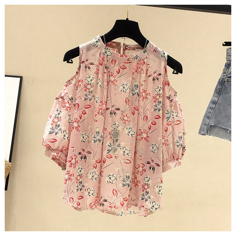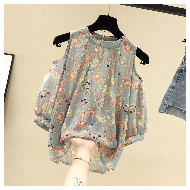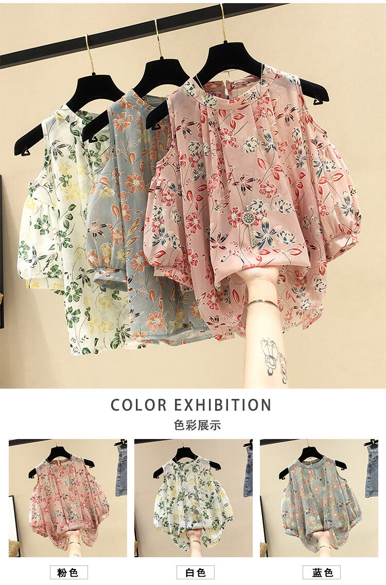 【现货现发】胖妹妹夏季短袖雪纺衬衫碎花露肩上衣显瘦遮肚子洋气 蓝色 M 80-105斤