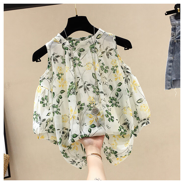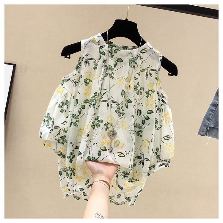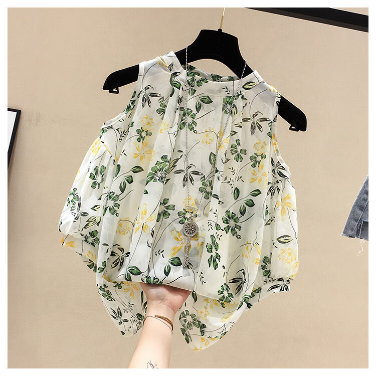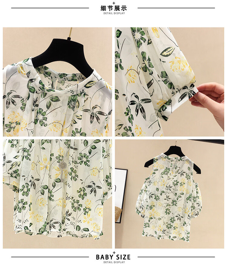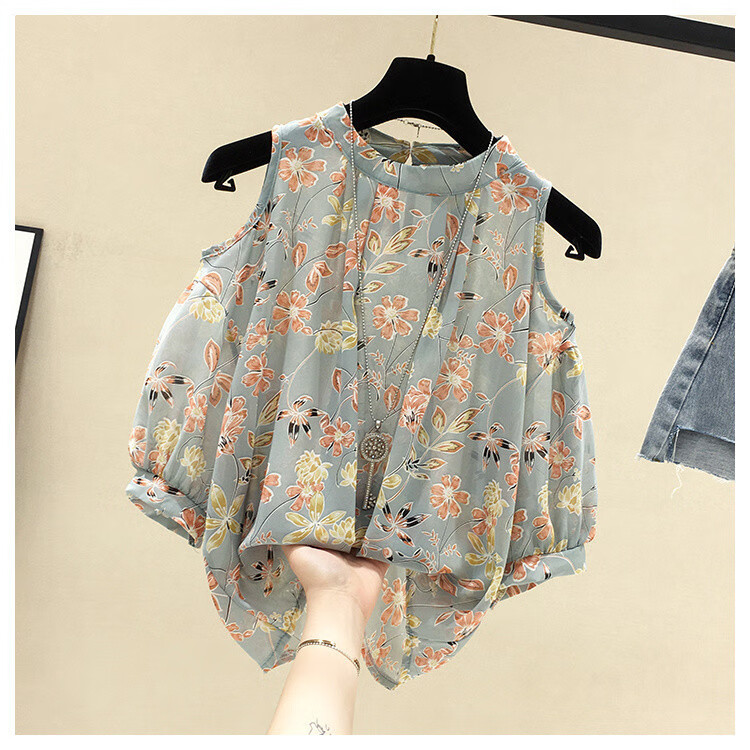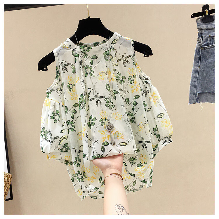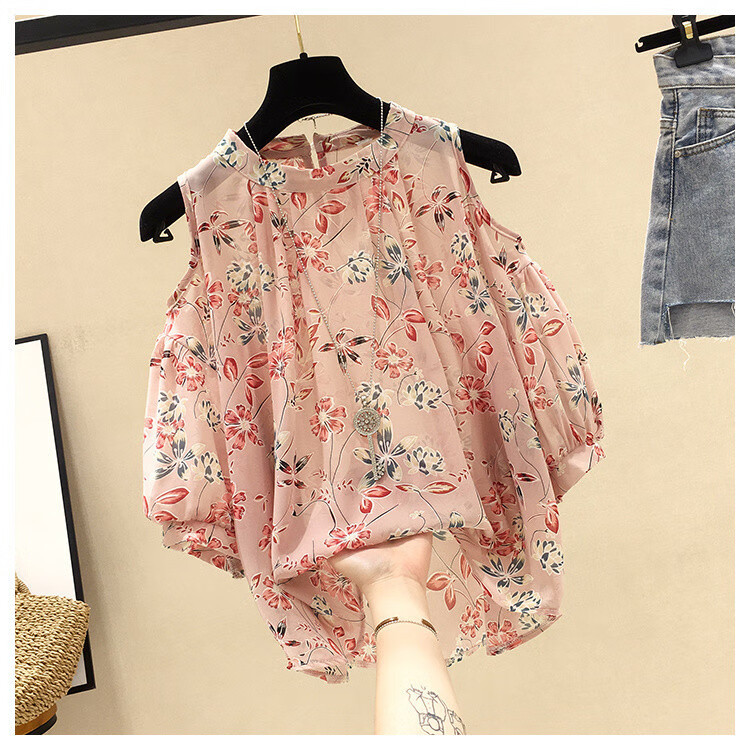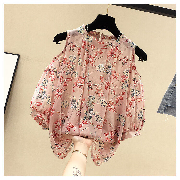 【现货现发】胖妹妹夏季短袖雪纺衬衫碎花露肩上衣显瘦遮肚子洋气 蓝色 M 80-105斤