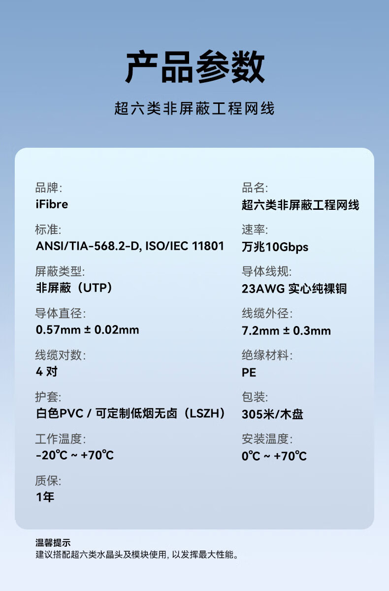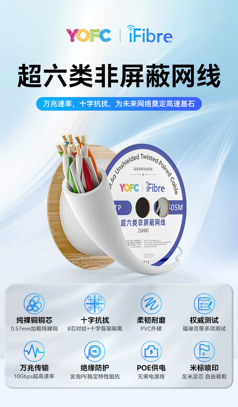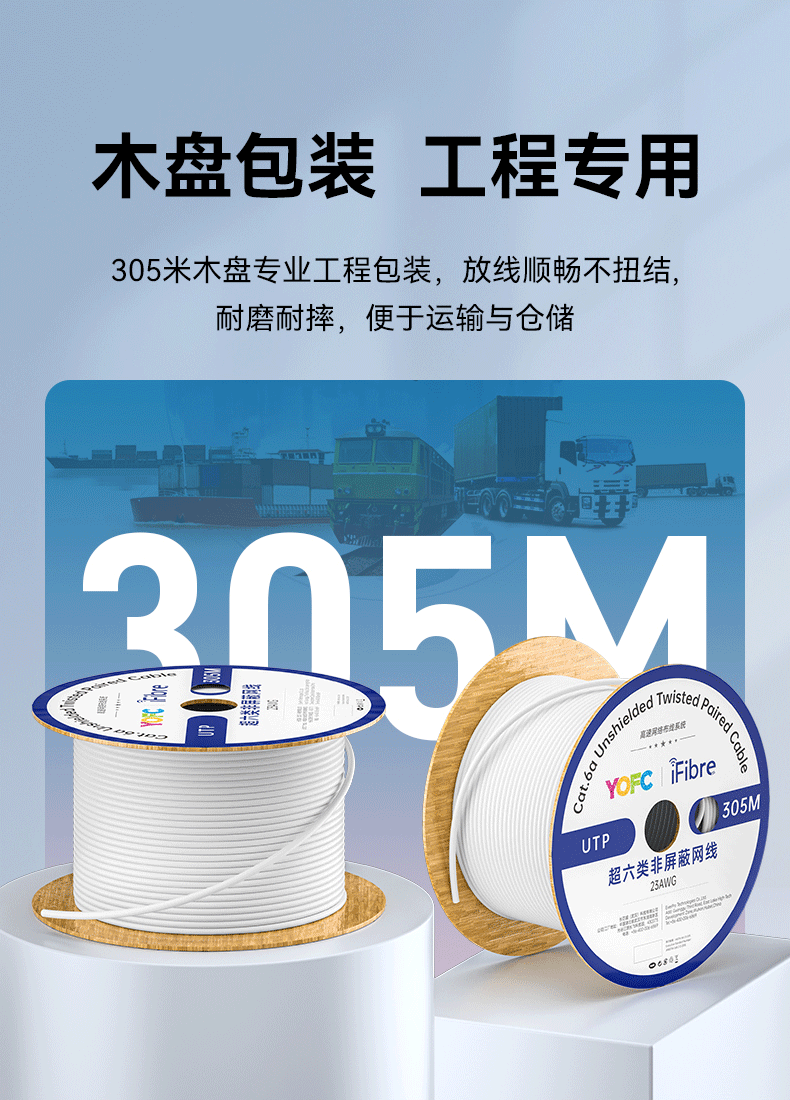长飞YOFC丨iFibre超六类非屏蔽网线万兆高速网络跳线 八芯双绞成品网线电脑宽带工程家用监控宿舍网线 白色 305米