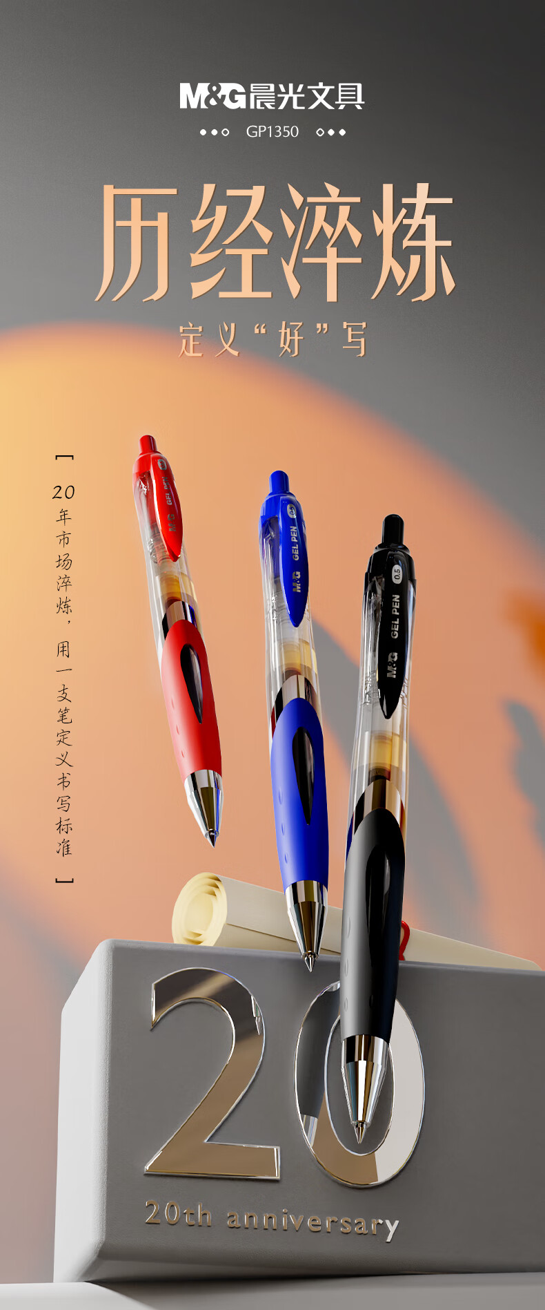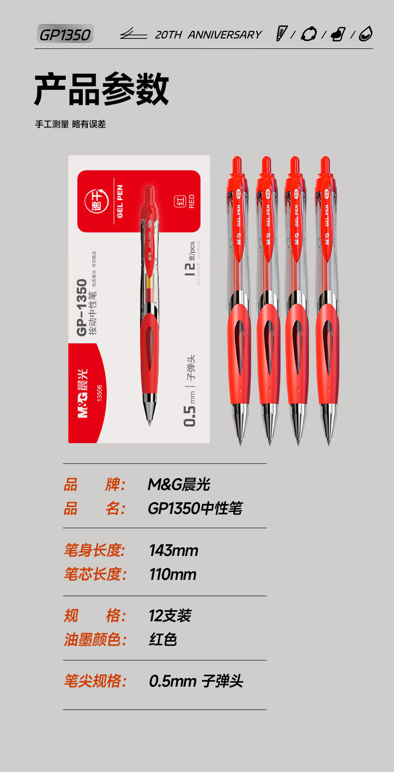 晨光(M&G)文具GP1350按动中性笔学生0.5签字笔批改作业商务子弹头水笔办公用品 红色12支/盒