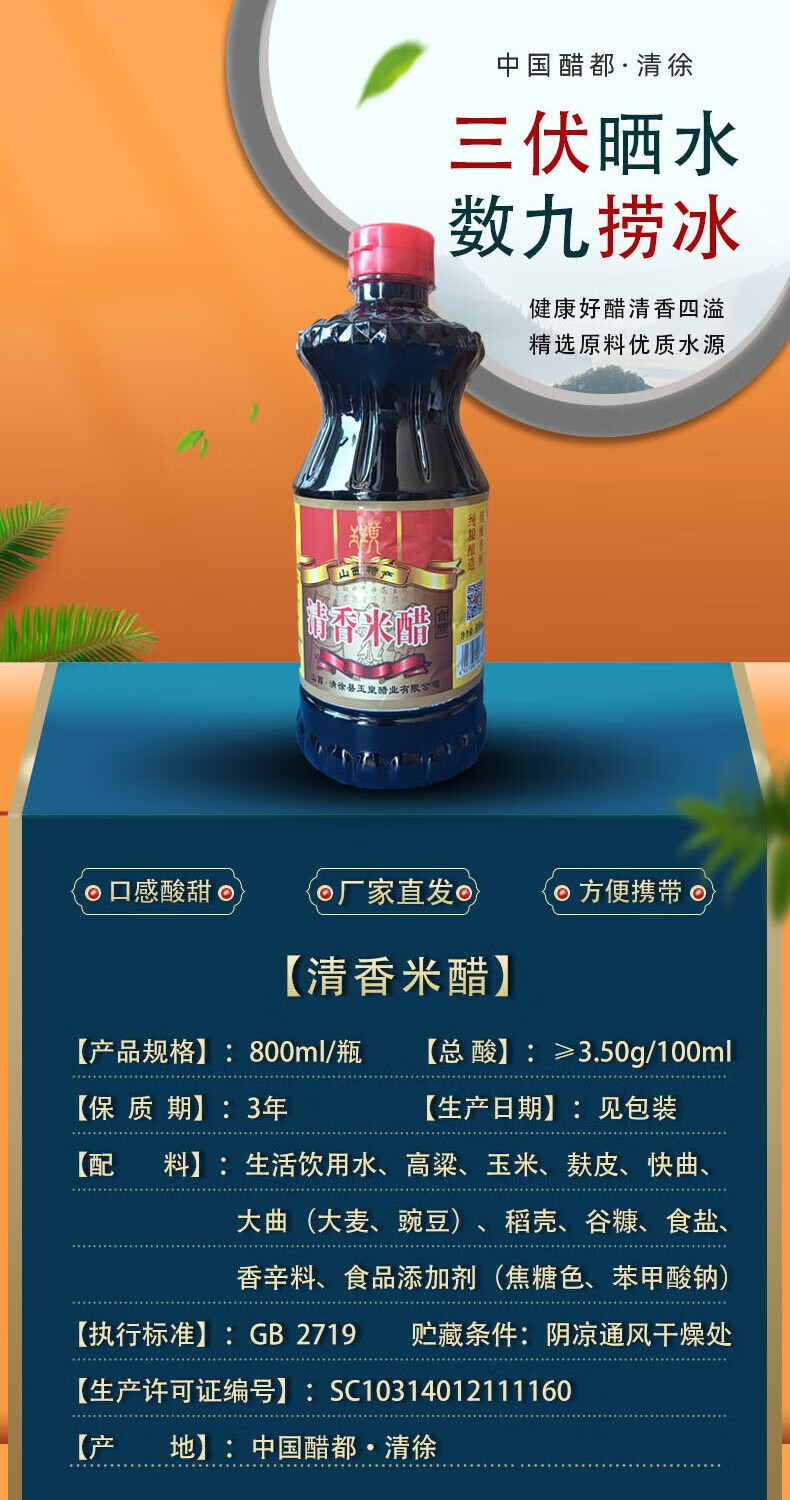 山西醋都 清徐玉璜清香米醋 食醋 清香米醋800ml*1瓶