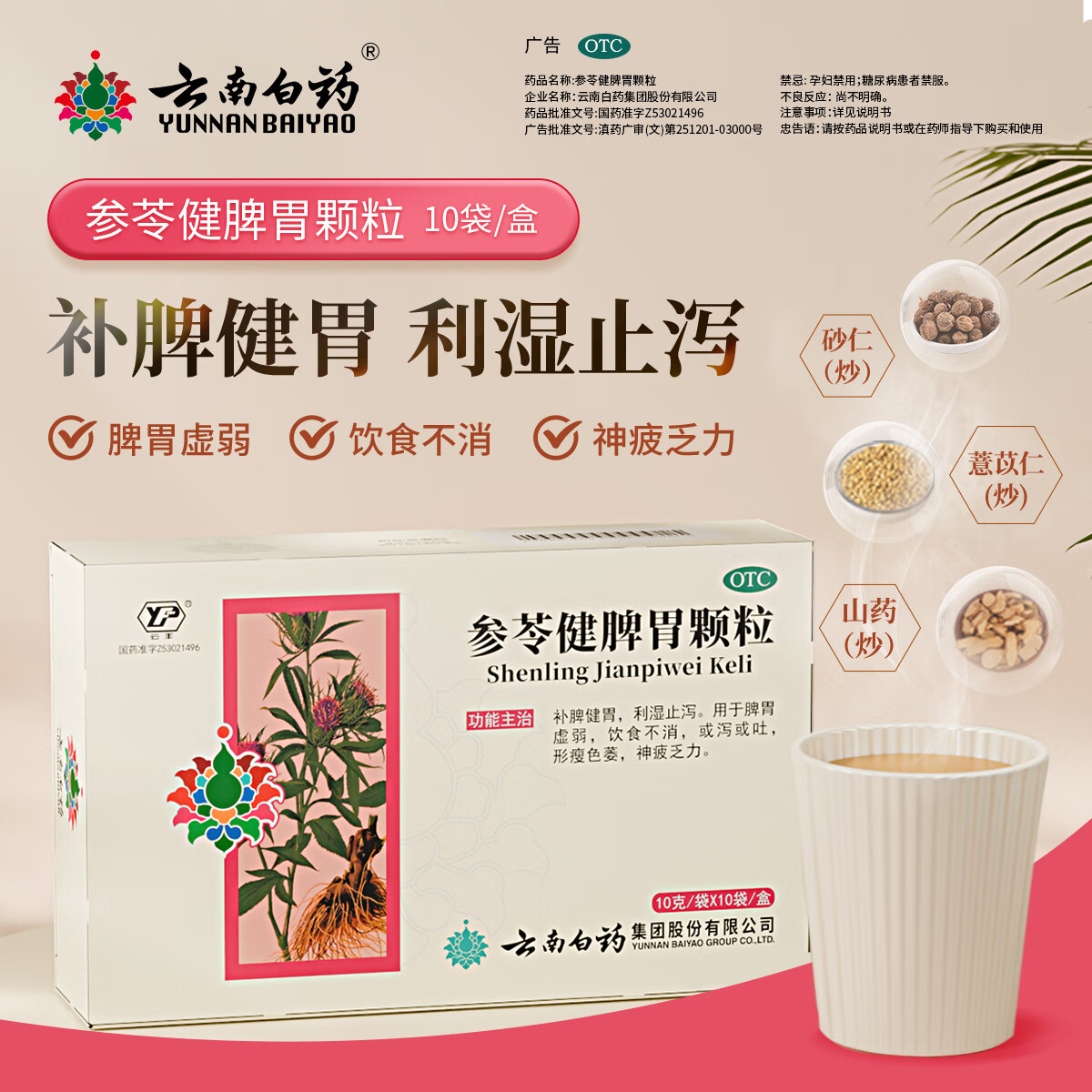 云南白药 参苓健脾胃颗粒10g*10袋 补脾健胃 利湿止泻 用于脾胃虚弱饮食不消形瘦色萎神疲乏力或泻或吐