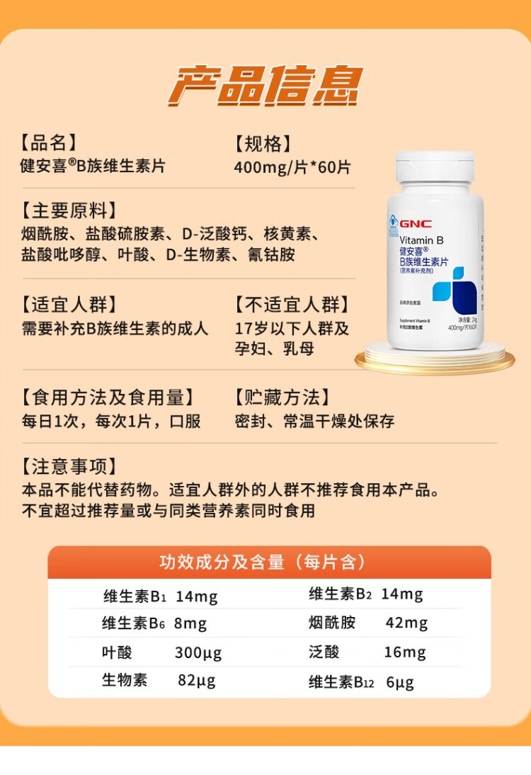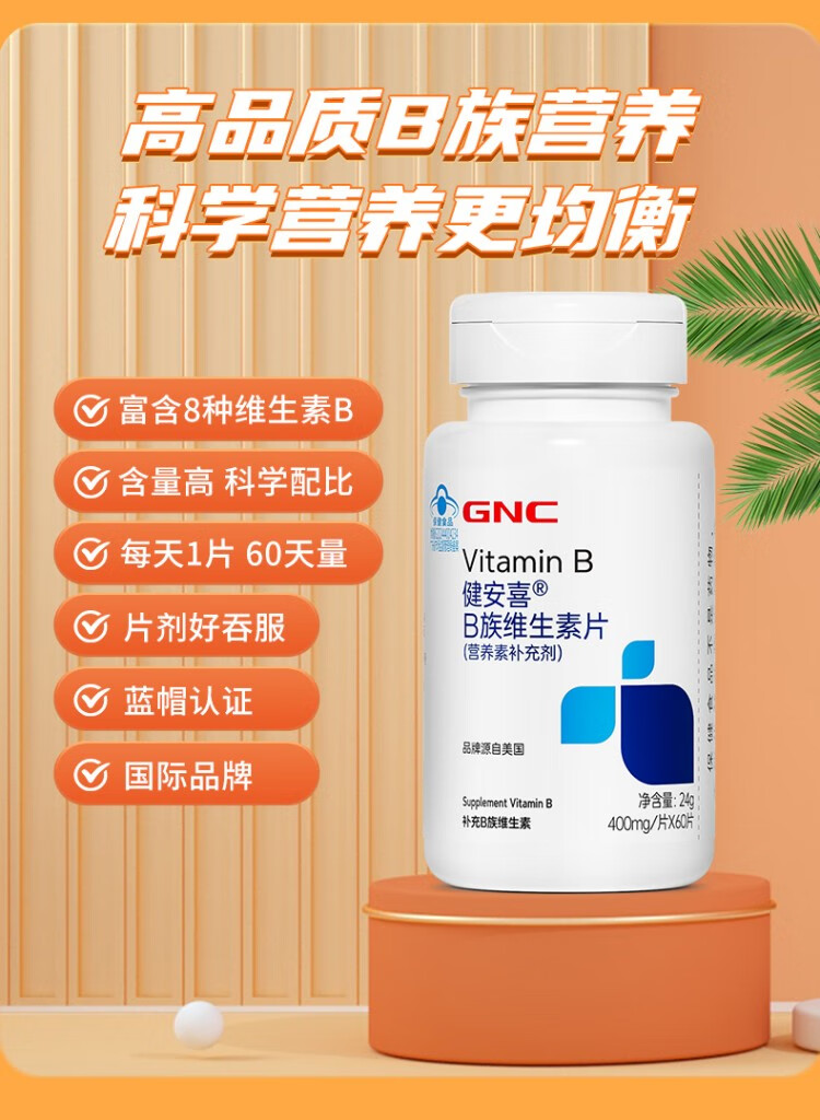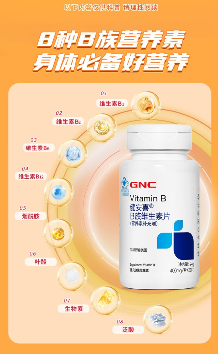 GNC健安喜维生素B族胶囊60粒复合维生素b族含b1b2b6b12叶酸烟酰胺/vc 【双瓶超值装】vb 60粒*2瓶