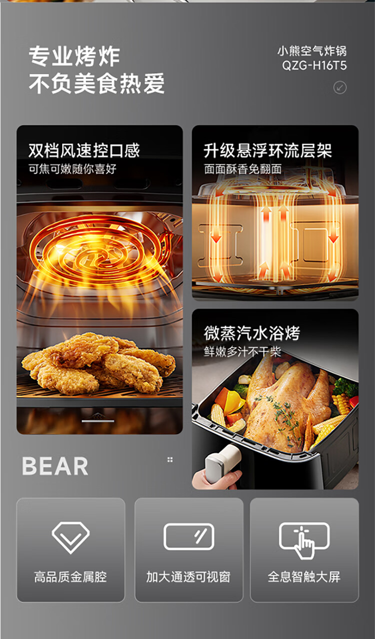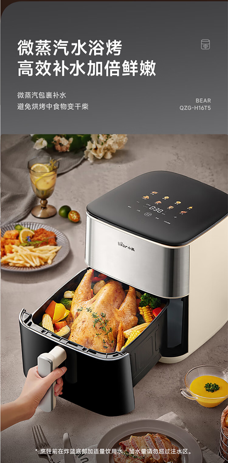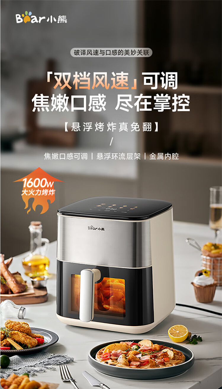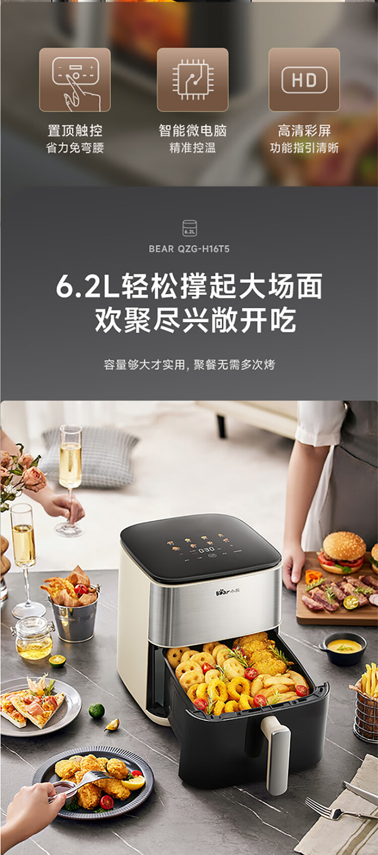 小熊(Bear)空气炸锅 不用翻面 双档风速金属内腔 6.2L家用大容量蒸汽嫩炸 易操作可视炸烤一体机 QZG-H16T5