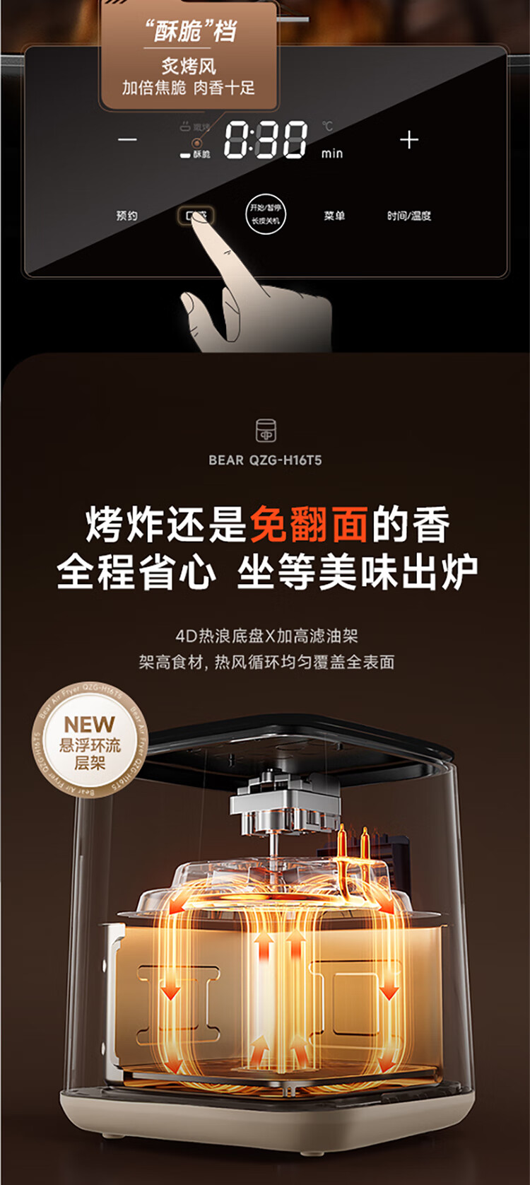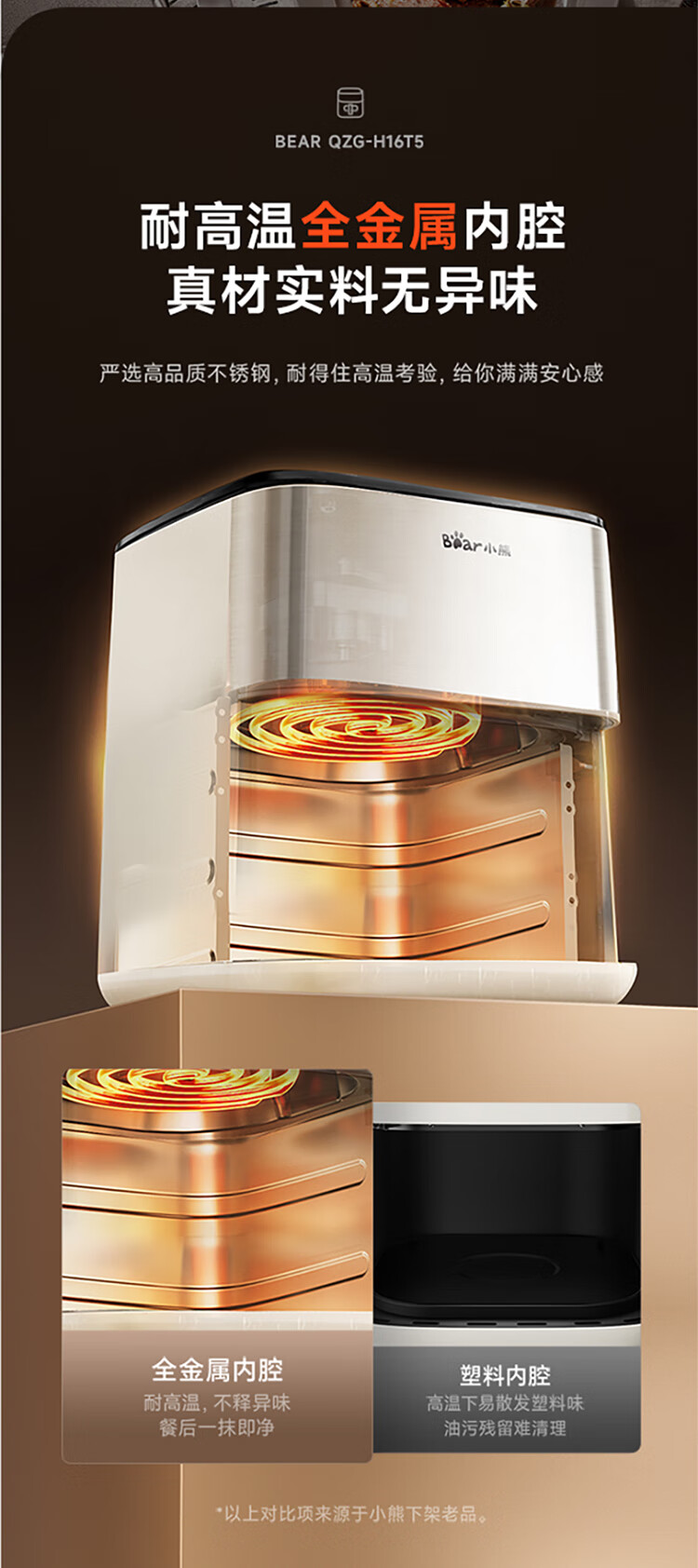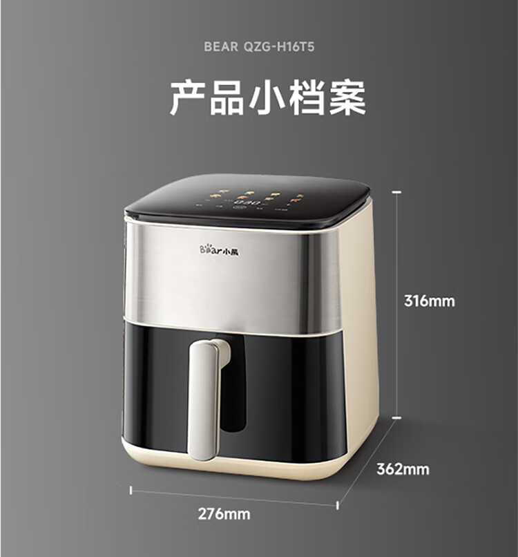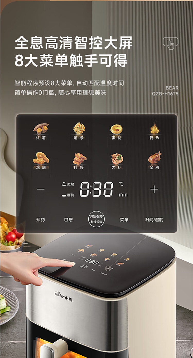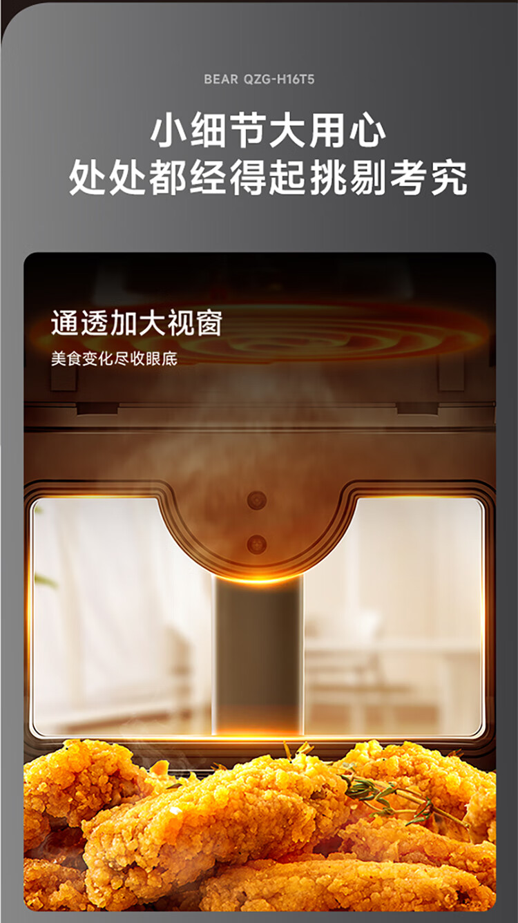 小熊(Bear)空气炸锅 不用翻面 双档风速金属内腔 6.2L家用大容量蒸汽嫩炸 易操作可视炸烤一体机 QZG-H16T5